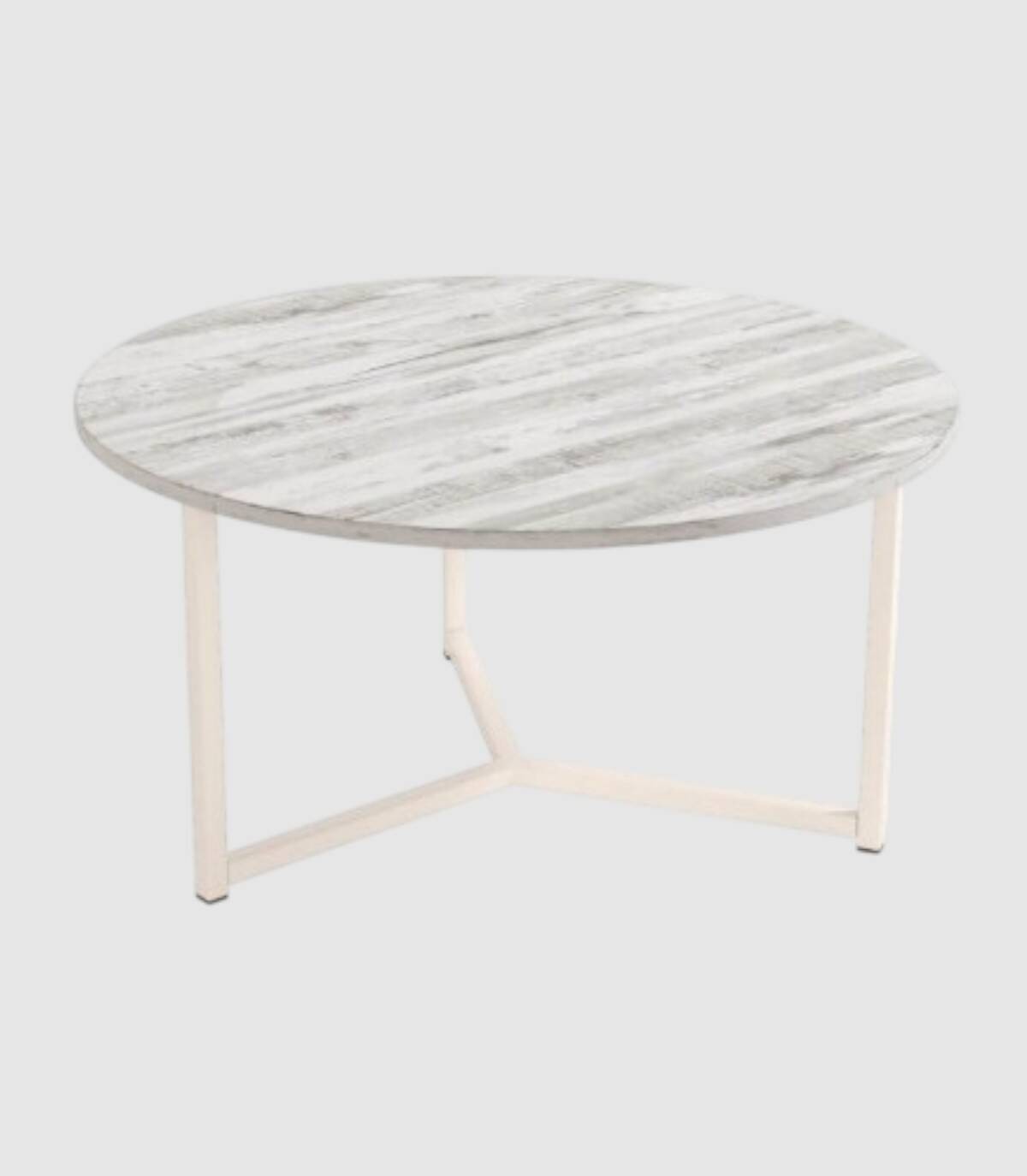 La mesa de centro redonda Pacífico se compone de tablero acabado en melaminas sobre estructura metálica pintada de color marfil.