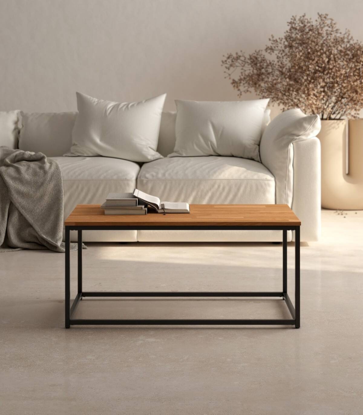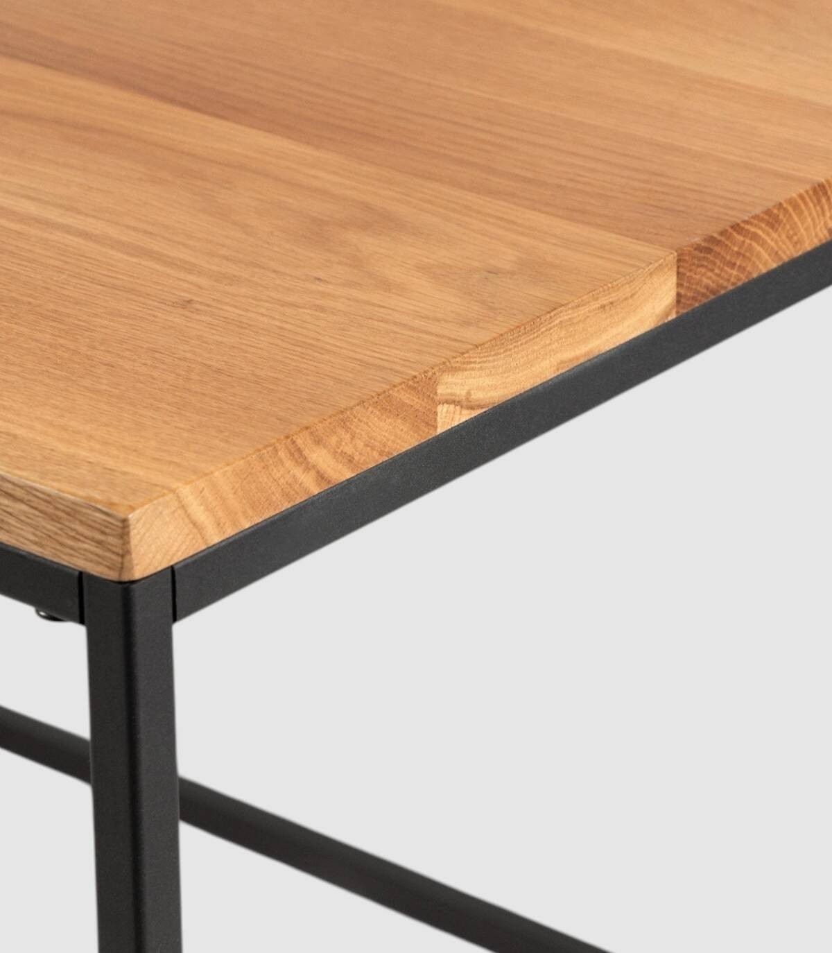La mesa Austral de centro redonda se compone de tablero de madera de roble sobre estructura cubica metálica pintada de color negro con forma de cuatro patas unidas por los extremos.