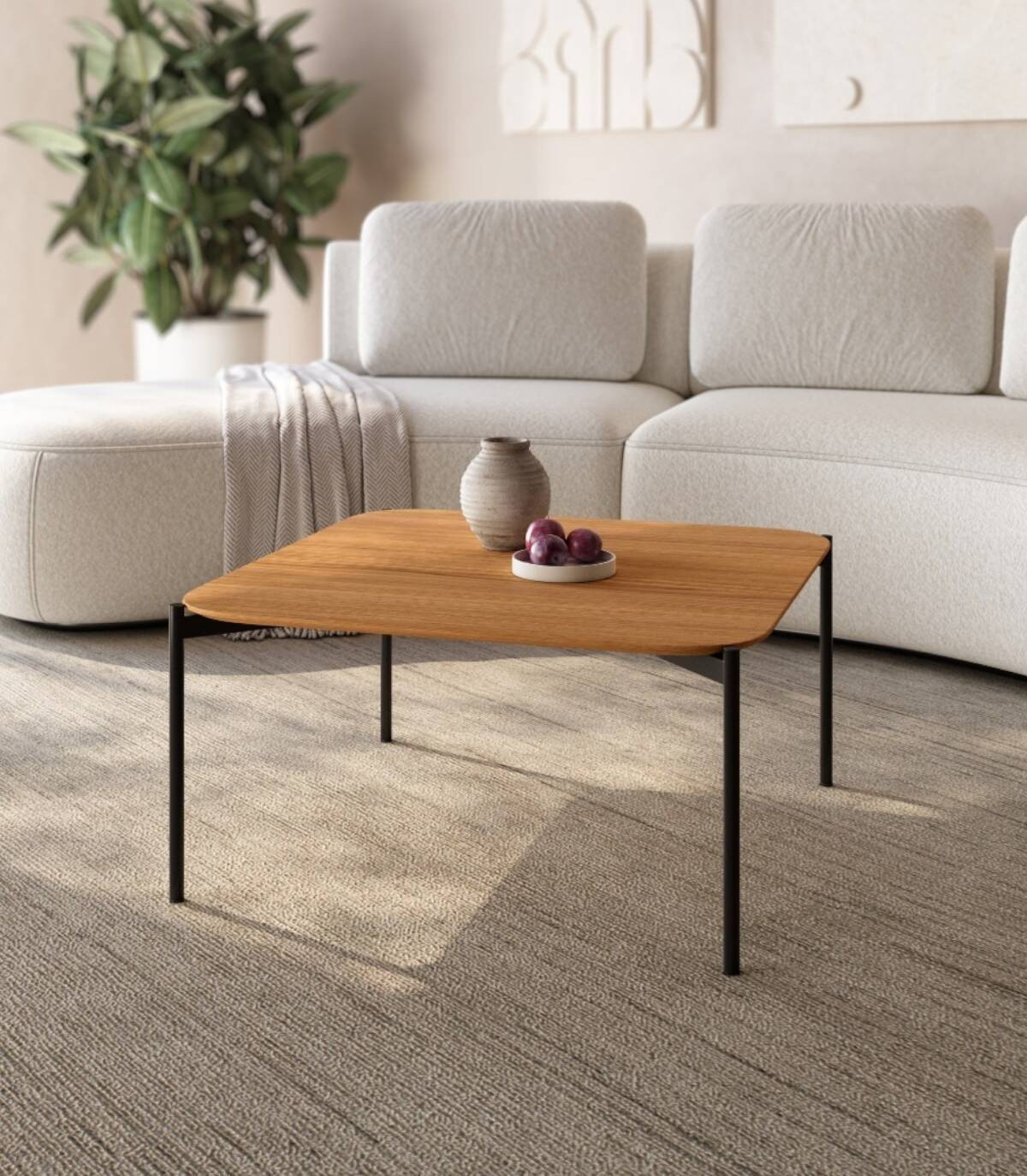 The square Java coffee table, Elegant and modern design, it has a beveled top with a wood-style finish and metal legs with black varnish.
