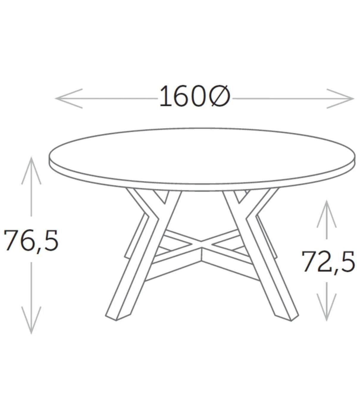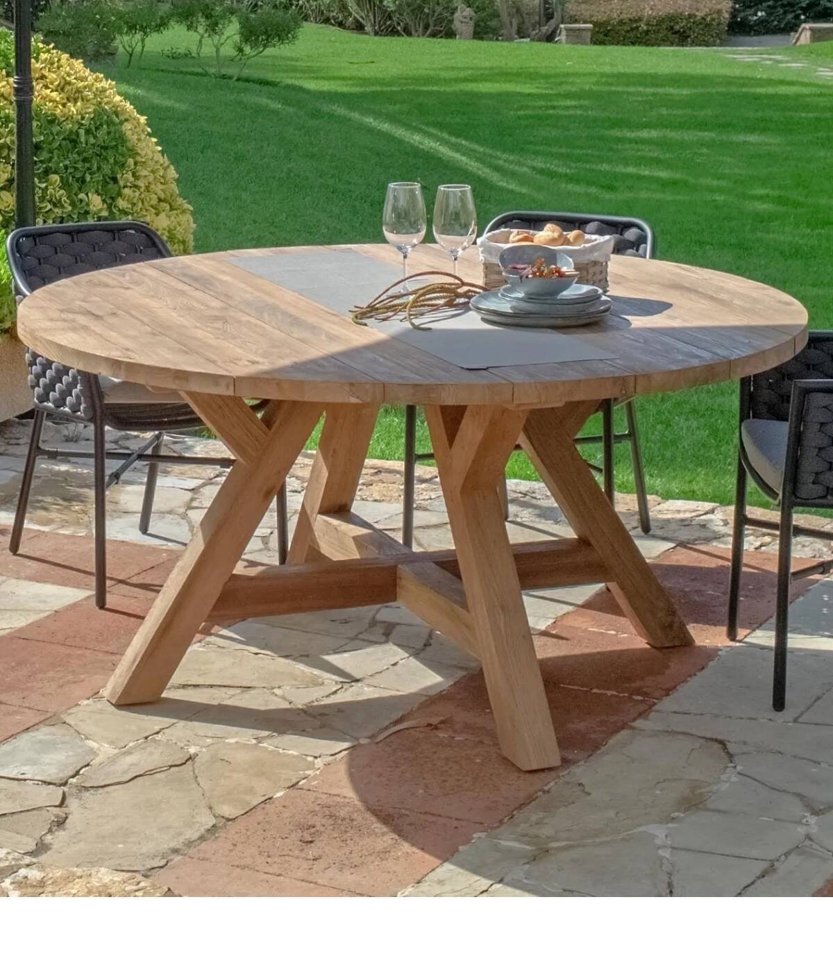 The Kenya dining table it has a smooth round surface and legs made of recycled teak wood.