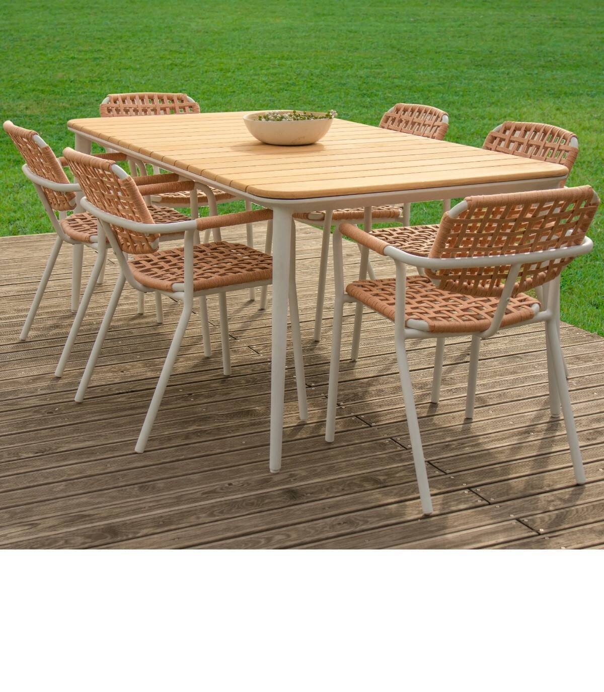 Timo aluminum table It is made of powder-coated aluminum (polyester). It has a smooth rectangular teak top. All 4 legs have non-slip caps.