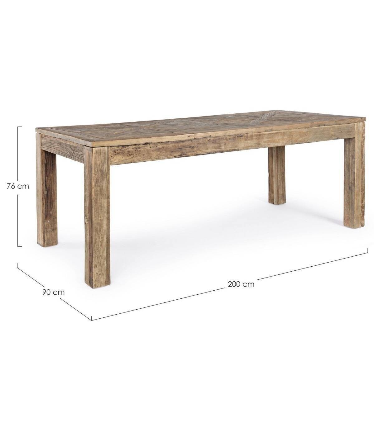 La mesa madera Kaily tiene estructura de madera de olmo reciclado, tablero a parqué efecto envejecido, acabado a base de nitrocelulosa. Las patas requieren montaje.