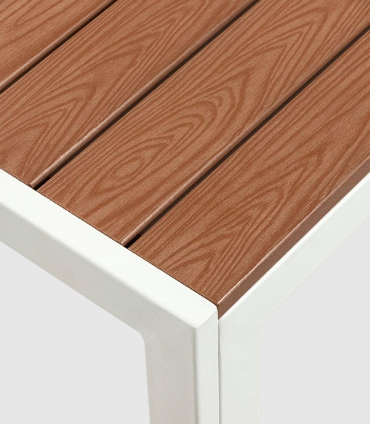 Read moreShow lessIt is made up of a WPC slatted board with a wood effect on a metal structure with four legs painted white.