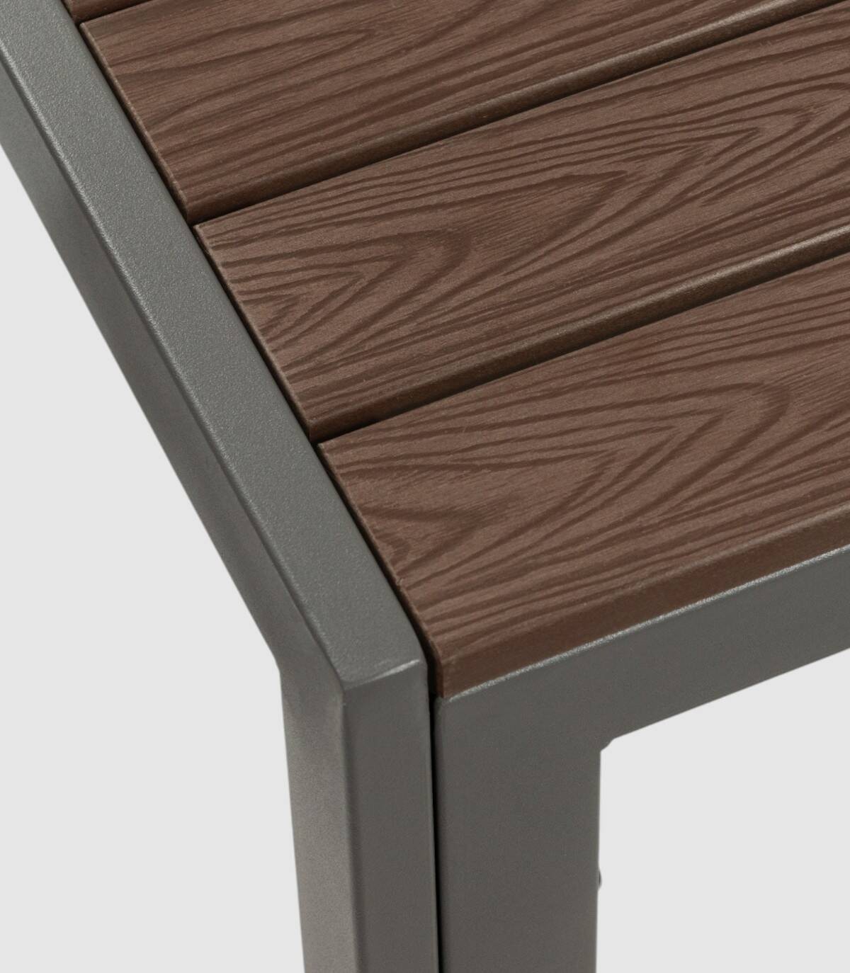 Read moreShow lessIt is made up of a WPC slatted board with a wood effect on a metal structure with four graphite-painted legs.