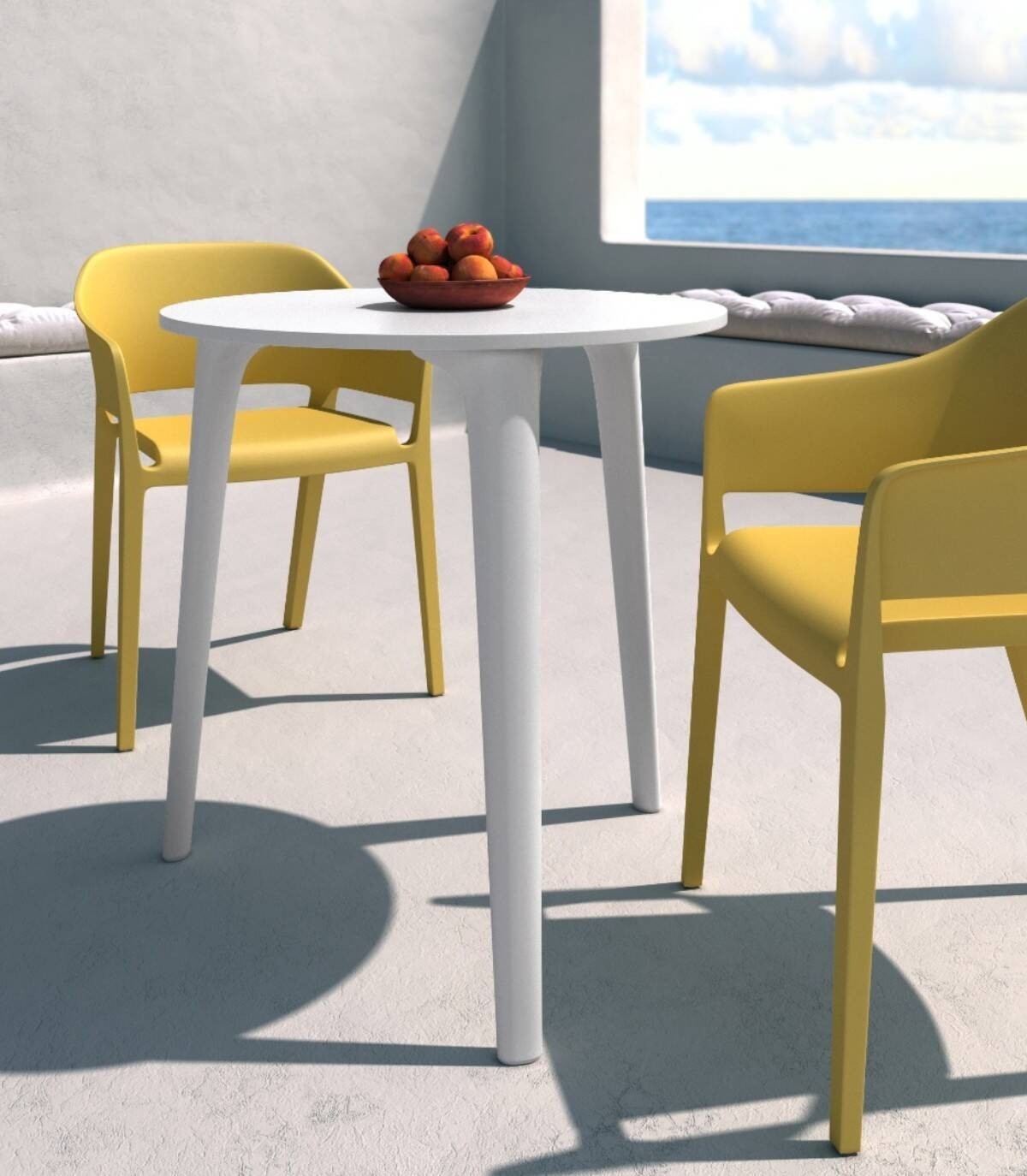 The round Sulu table, Elegant and modern design, it has a polypropylene top and legs of the same color.