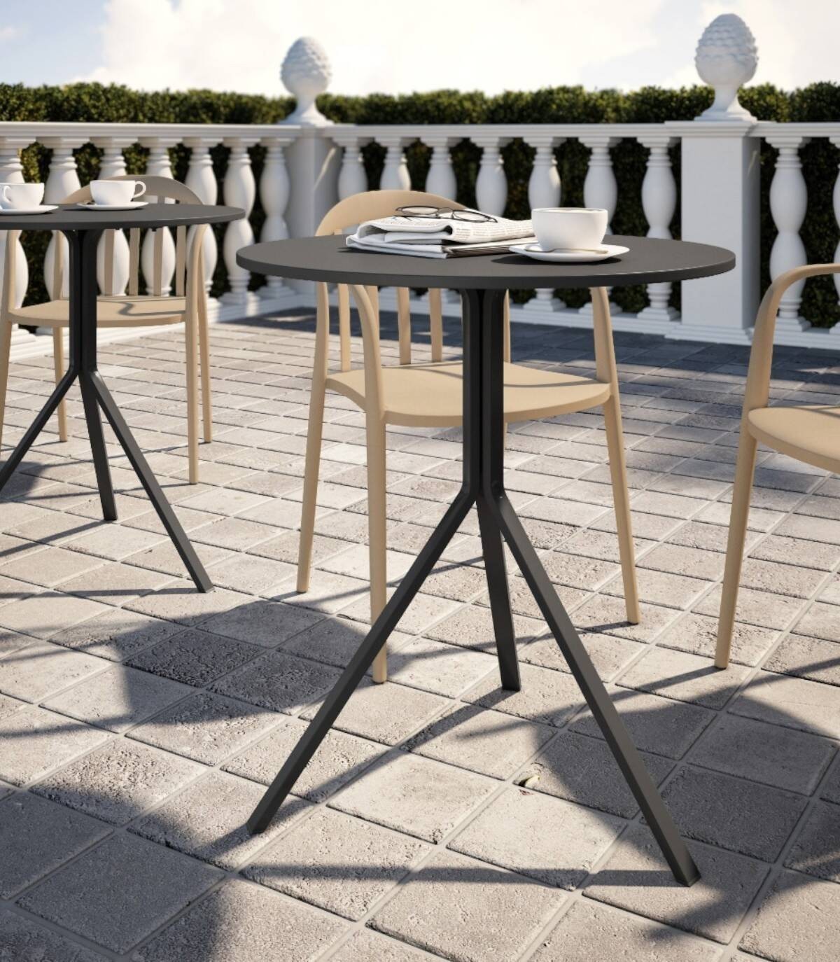 The round Ionian table, With an elegant and modern design, it has a polypropylene top and lacquered metal legs of the same color.
