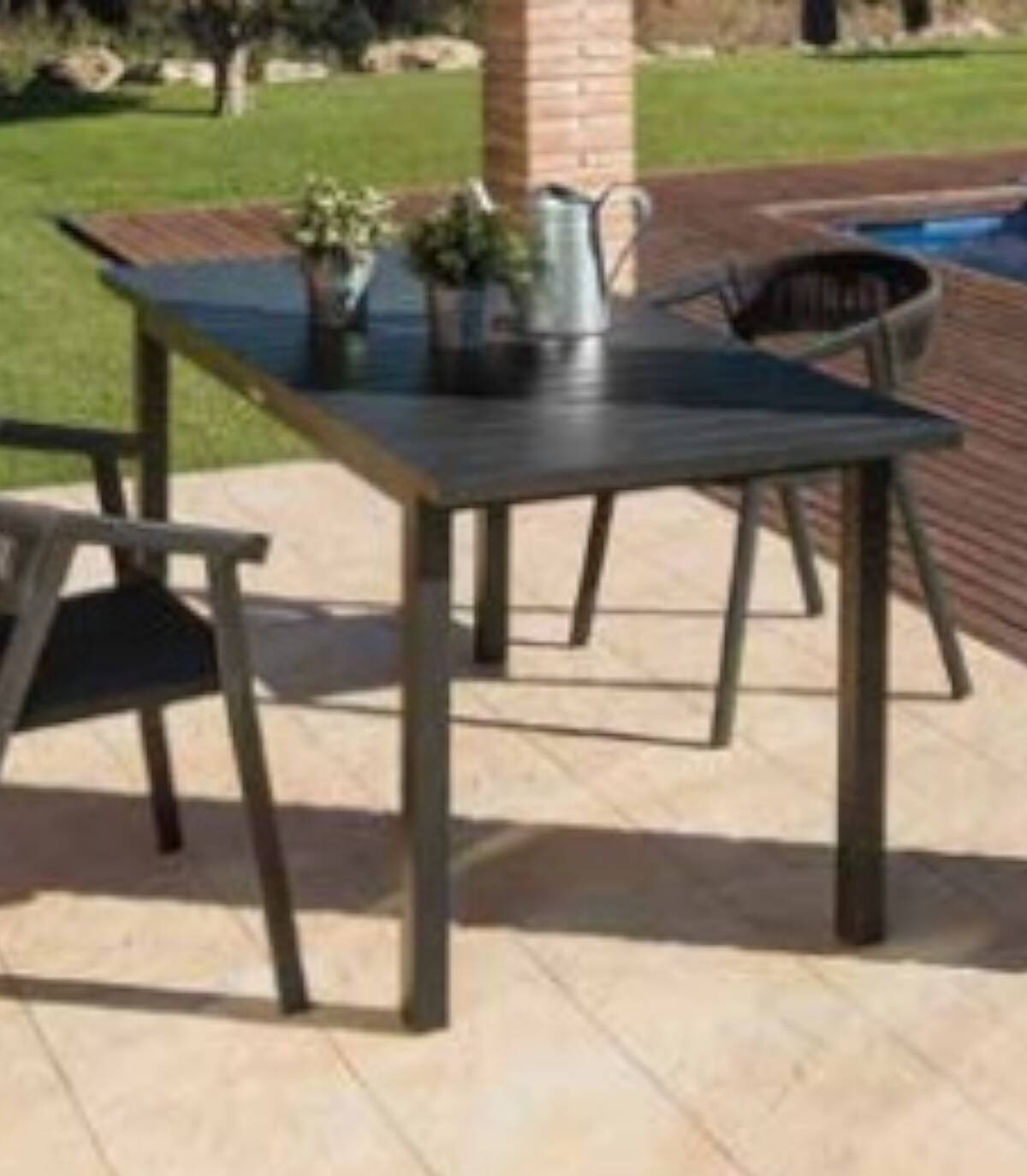 The extendable aluminum dining table Auto It is made of powder-coated aluminum (polyester). It has a smooth rectangular aluminum surface. All 4 legs have non-slip caps.