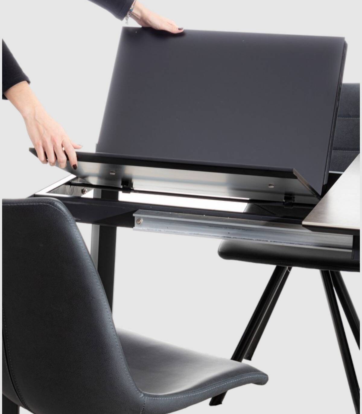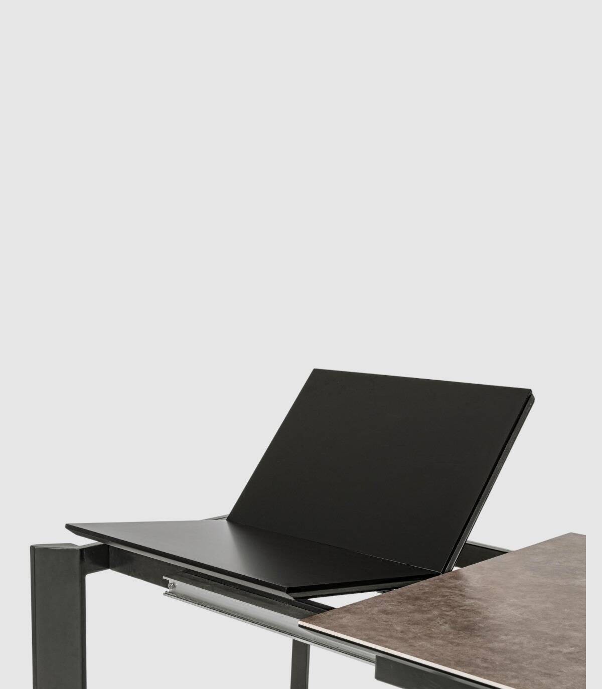 The Briva gray black extendable table has a powder-coated steel frame epoxy, ceramic cap (5mm) with dm holder (18mm), dm extension (21mm). Requires assembly.