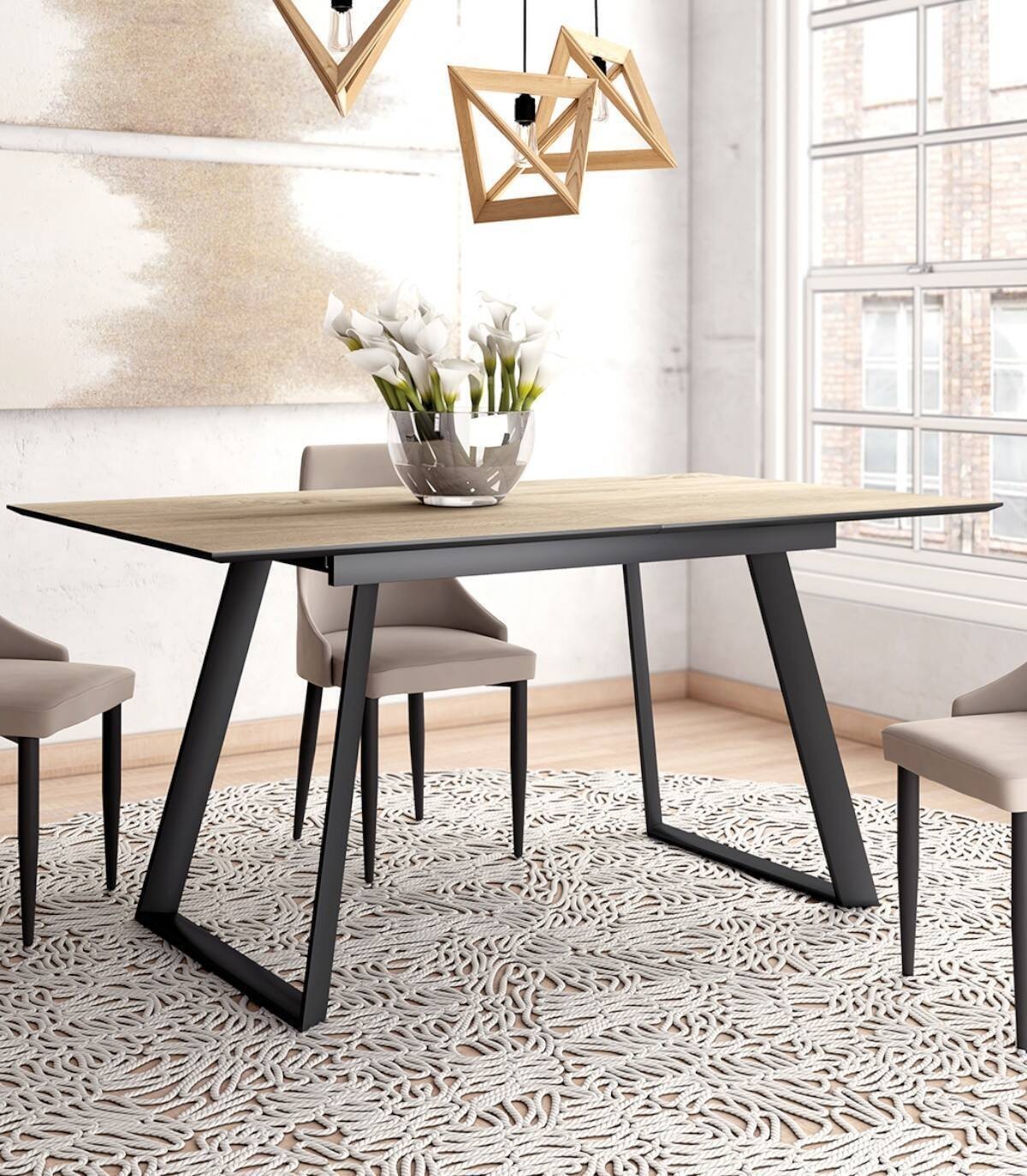 The rectangular Timor table with extension, Elegant and modern design, it has a beveled top with a wood-style finish and a black varnished metal structure.