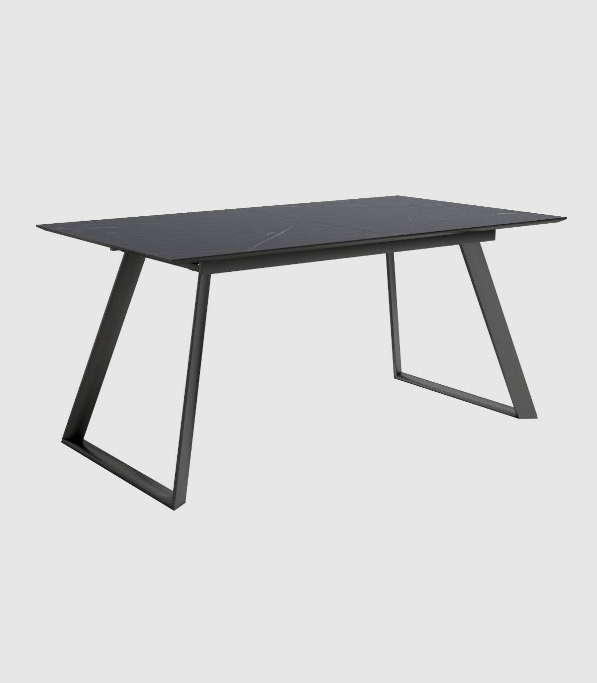 The rectangular Timor table with extension, Elegant and modern design, it has a beveled top with a stone-style finish and a black varnished metal structure.