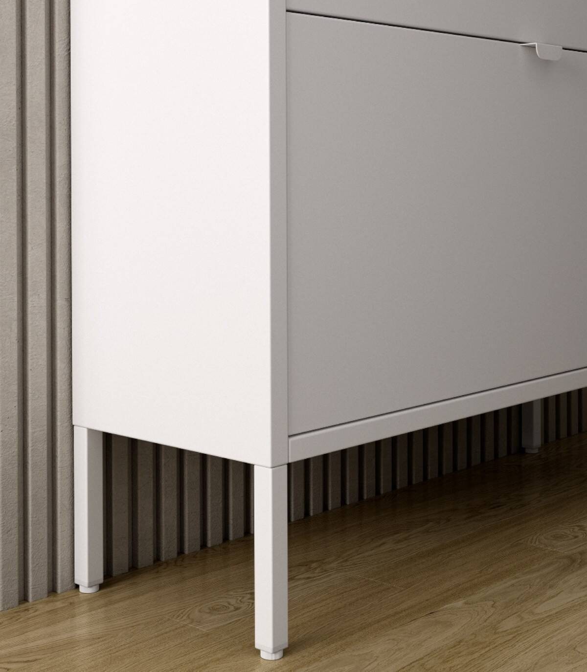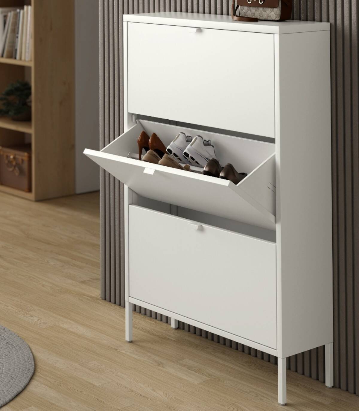 The Titania shoe rack consists of three doors with handles, a metal frame and legs.