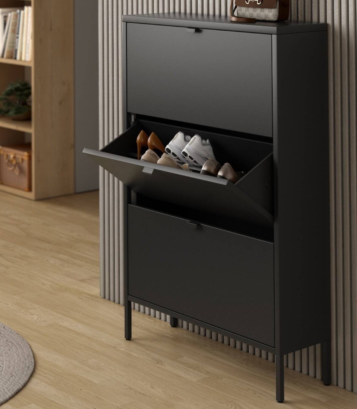 The Titania shoe rack consists of three doors with handles, a metal frame and legs.