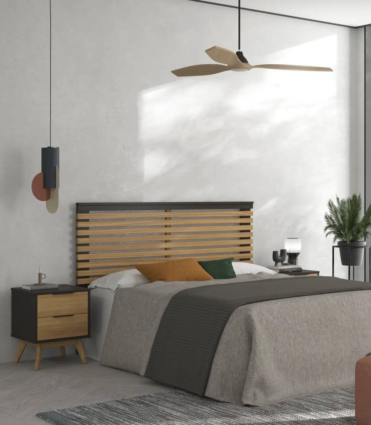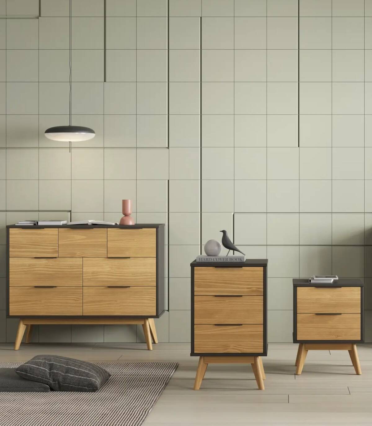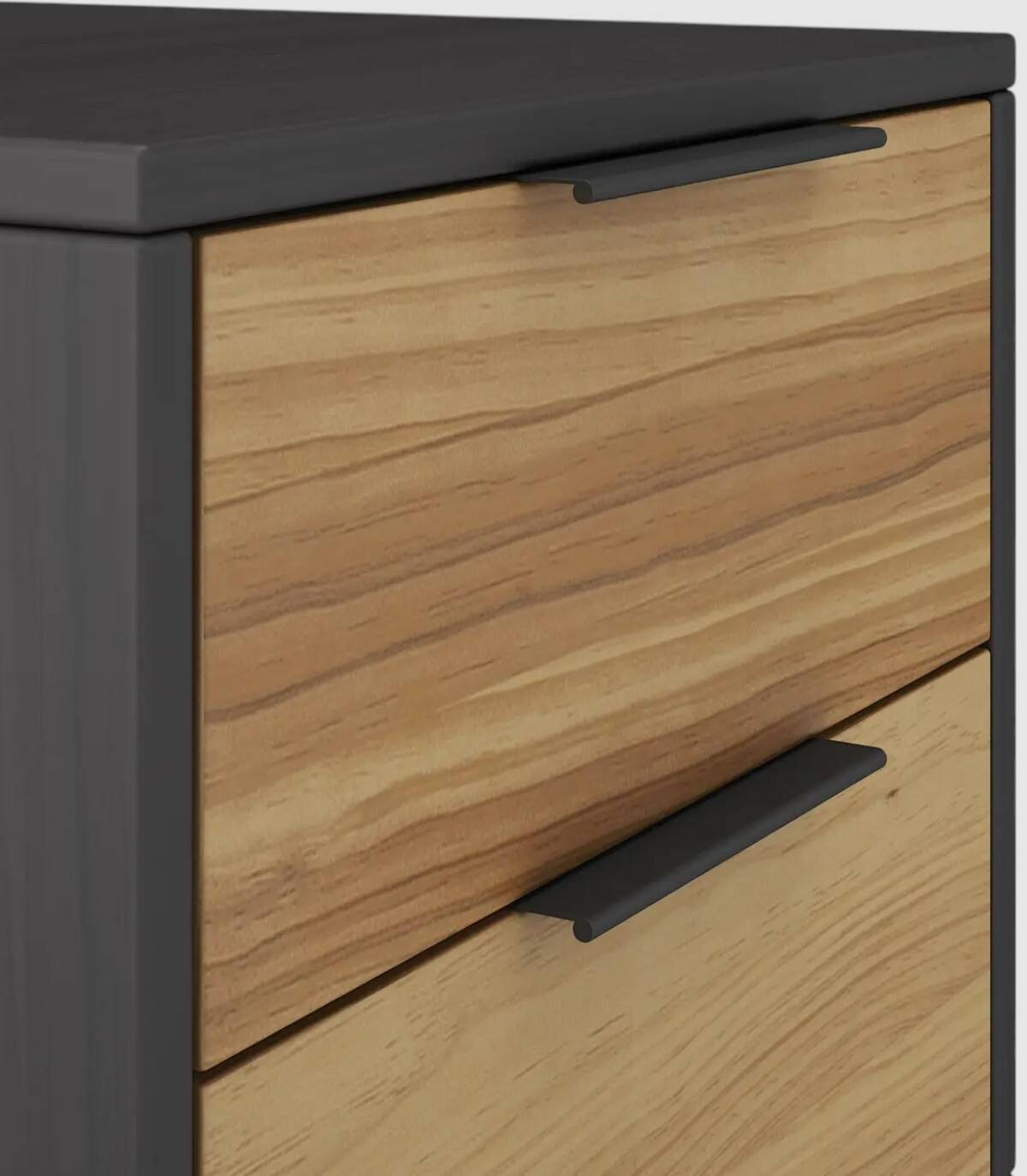 La mesita Tilske se compone de dos cajones en vertical con tirador negro en el extremo superior, frontal color madera y estructura fabricada en madera de pino pintado de color antracita sobre cuatro patas color madera.
