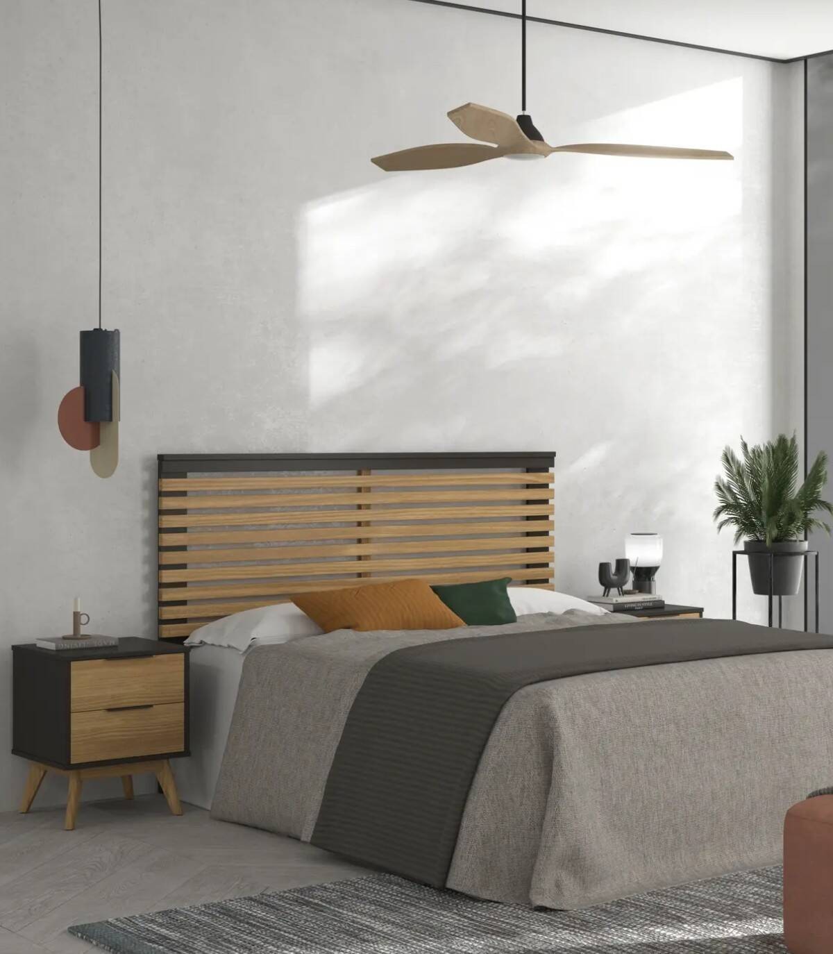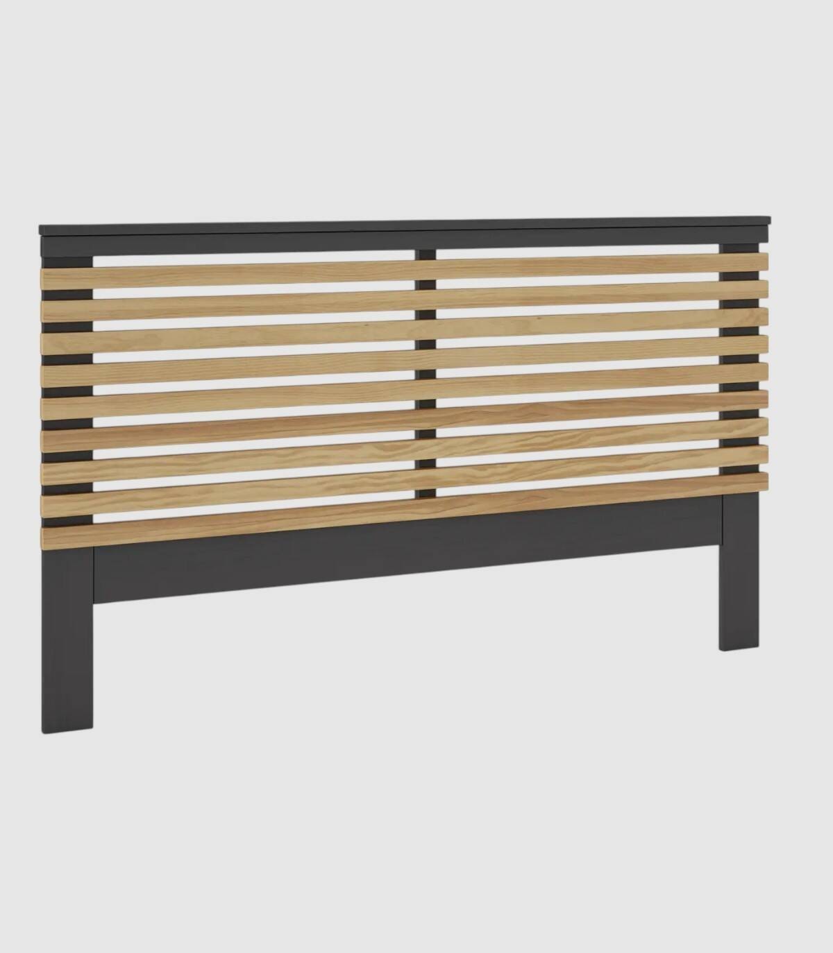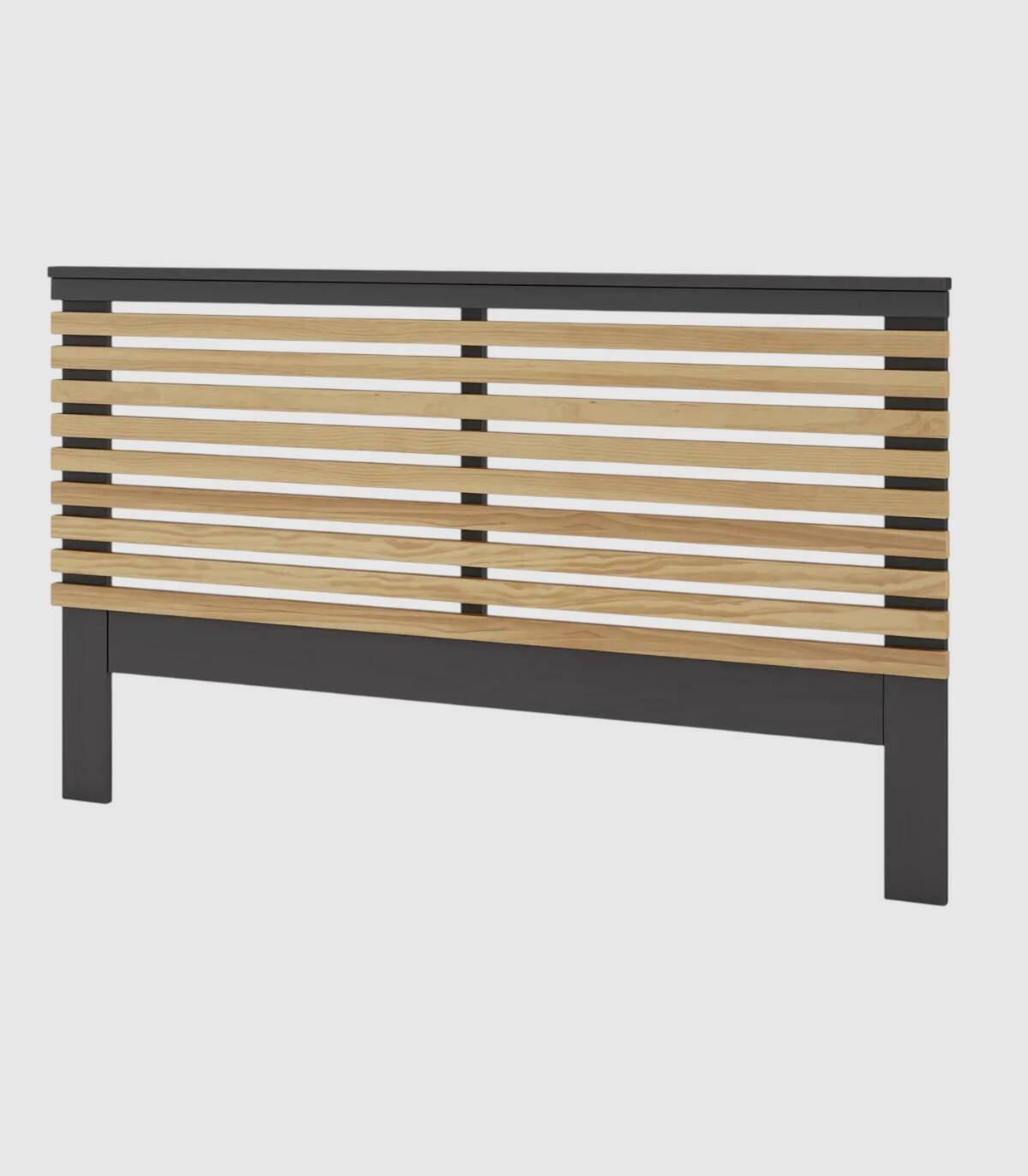 El cabezal Tilske se compone de láminas de madera color natural en horizontal con espacios entre cada una, estructura y dos patas fabricado en madera de pino pintado de color antracita. Apto para camas de 135 cm de ancho.