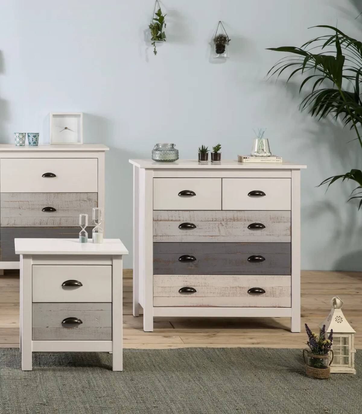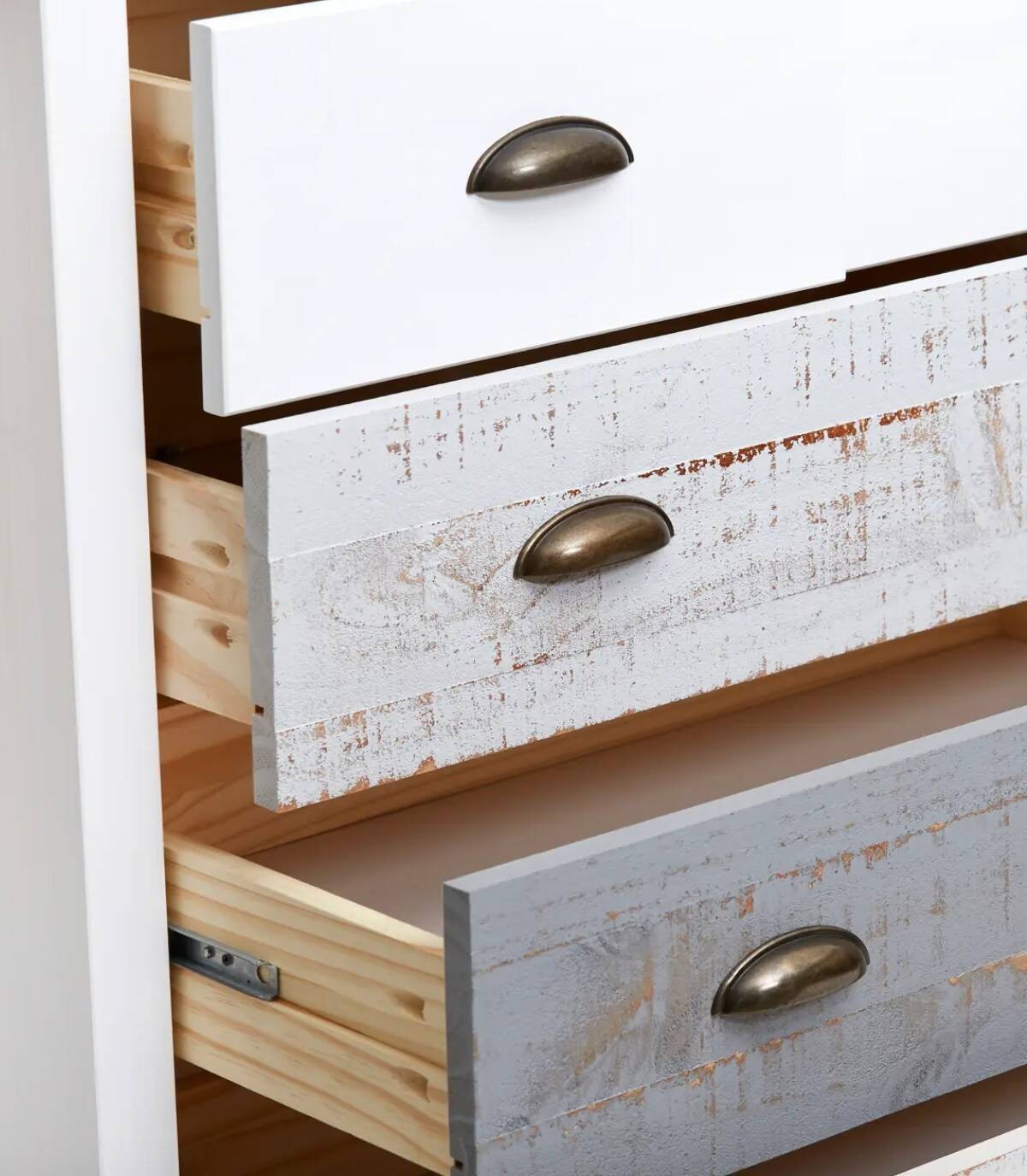 La cómoda Fernaus se compone de cinco cajones, dos arriba en horizontal con tirador y frontal blanco y tres abajo en vertical con tirador y frontal gris en varios tonos con efecto envejecido, con estructura de madera de pino y DM pintada de color blanco sobre cuatro patas de color blanco.
