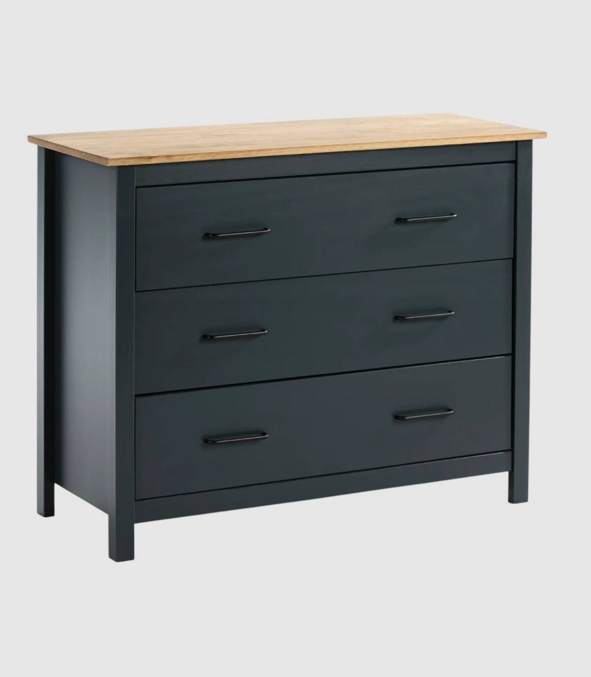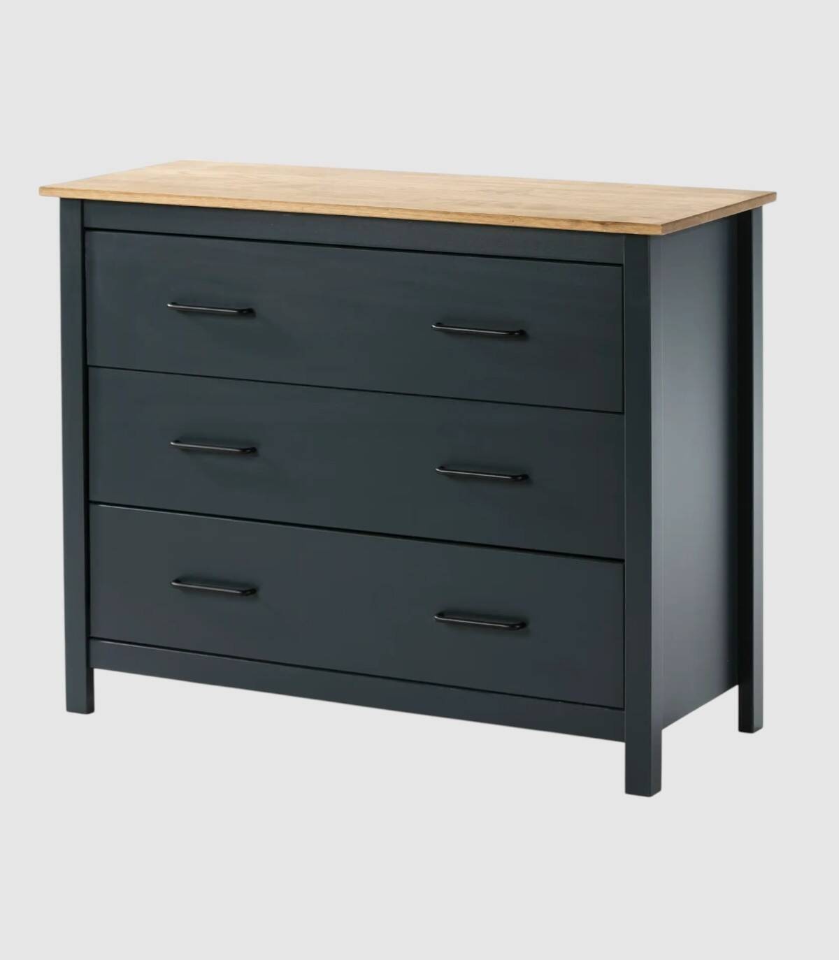 La cómoda Dangal se compone de tres cajones en vertical con tiradores negros y tablero de color madera con estructura de madera de pino pintada de color azul sobre cuatro patas.
