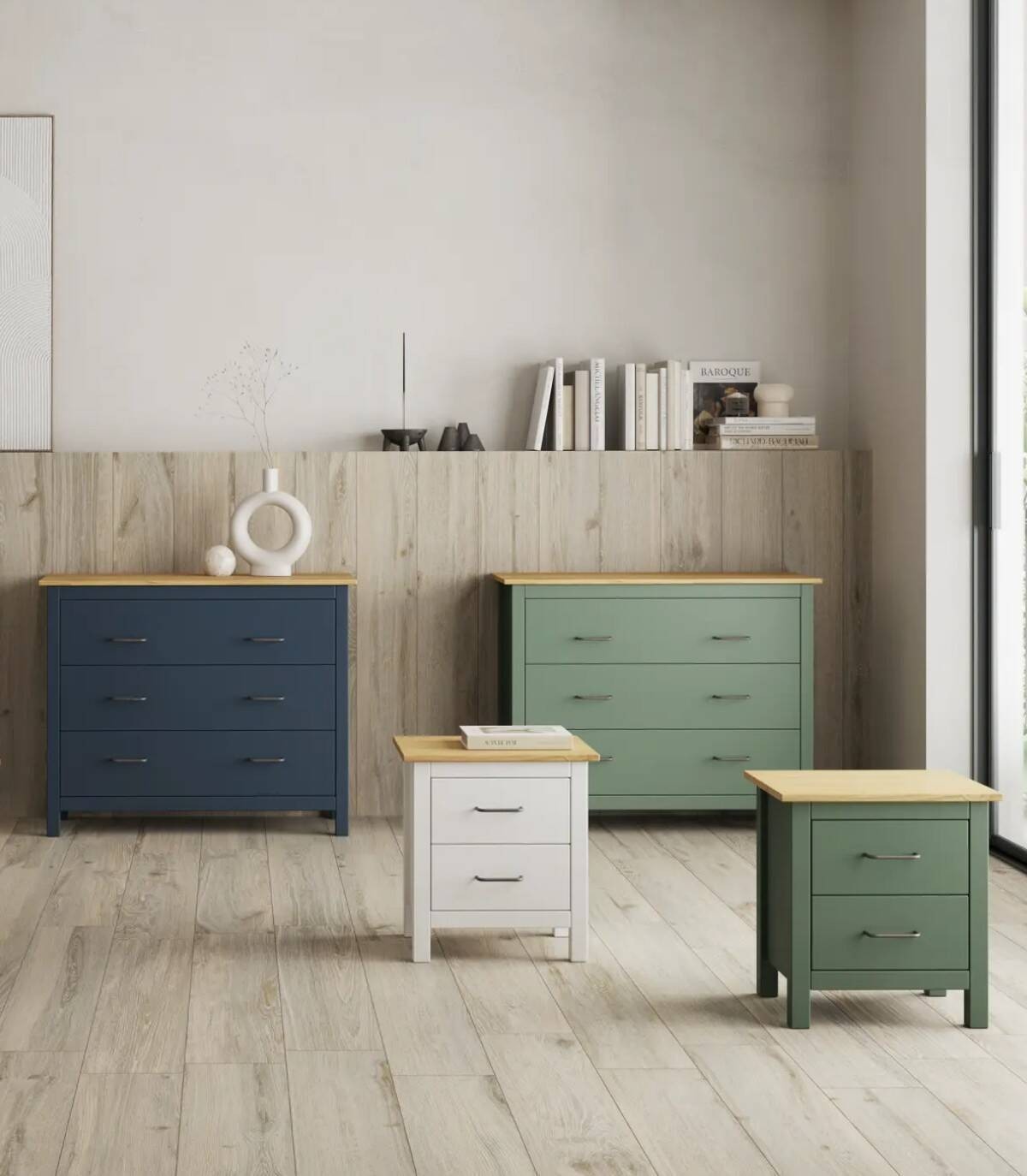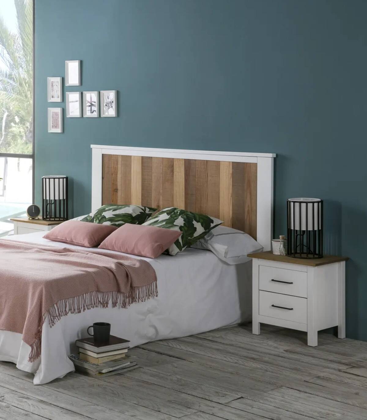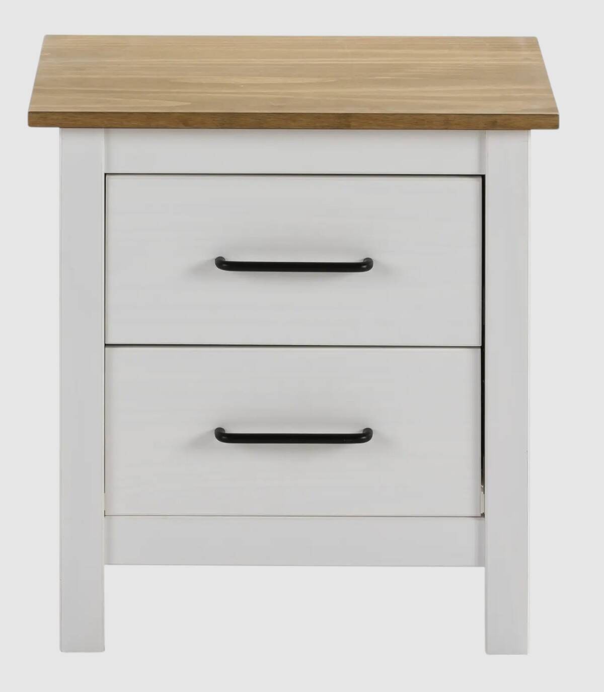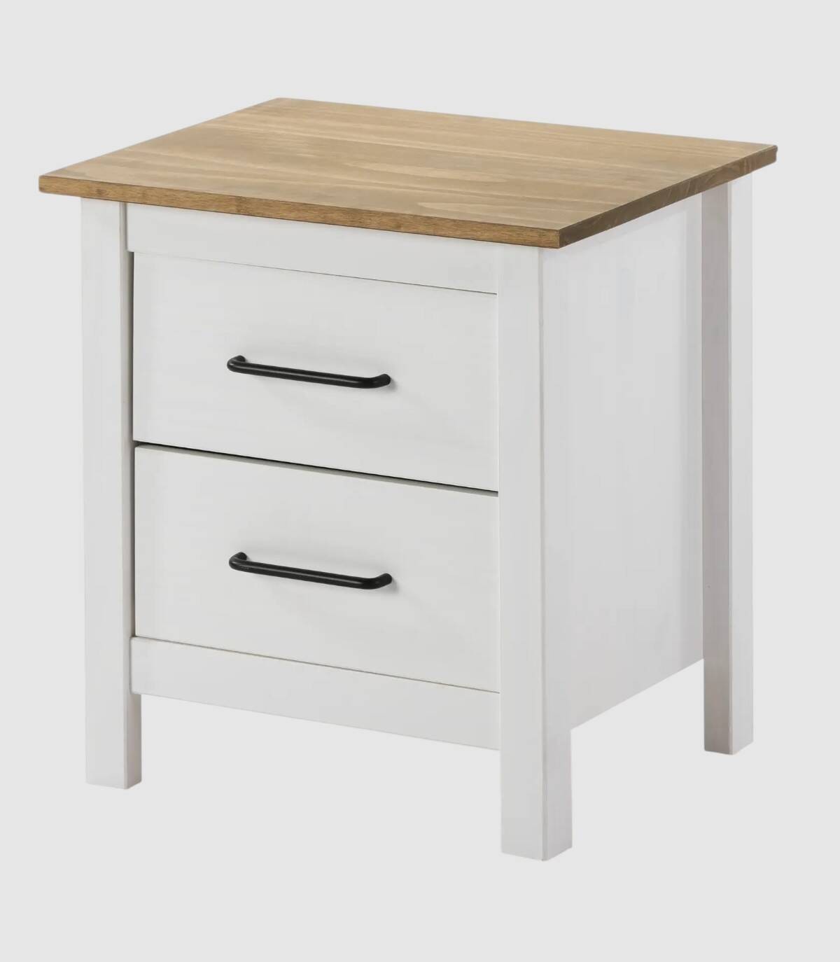 La mesita Dangal se compone de dos cajones en vertical con tirador negro y tablero de color madera con estructura de madera de pino pintada de color blanco sobre cuatro patas.