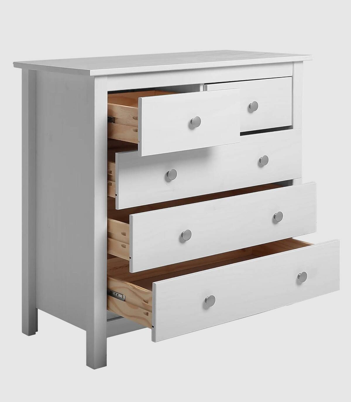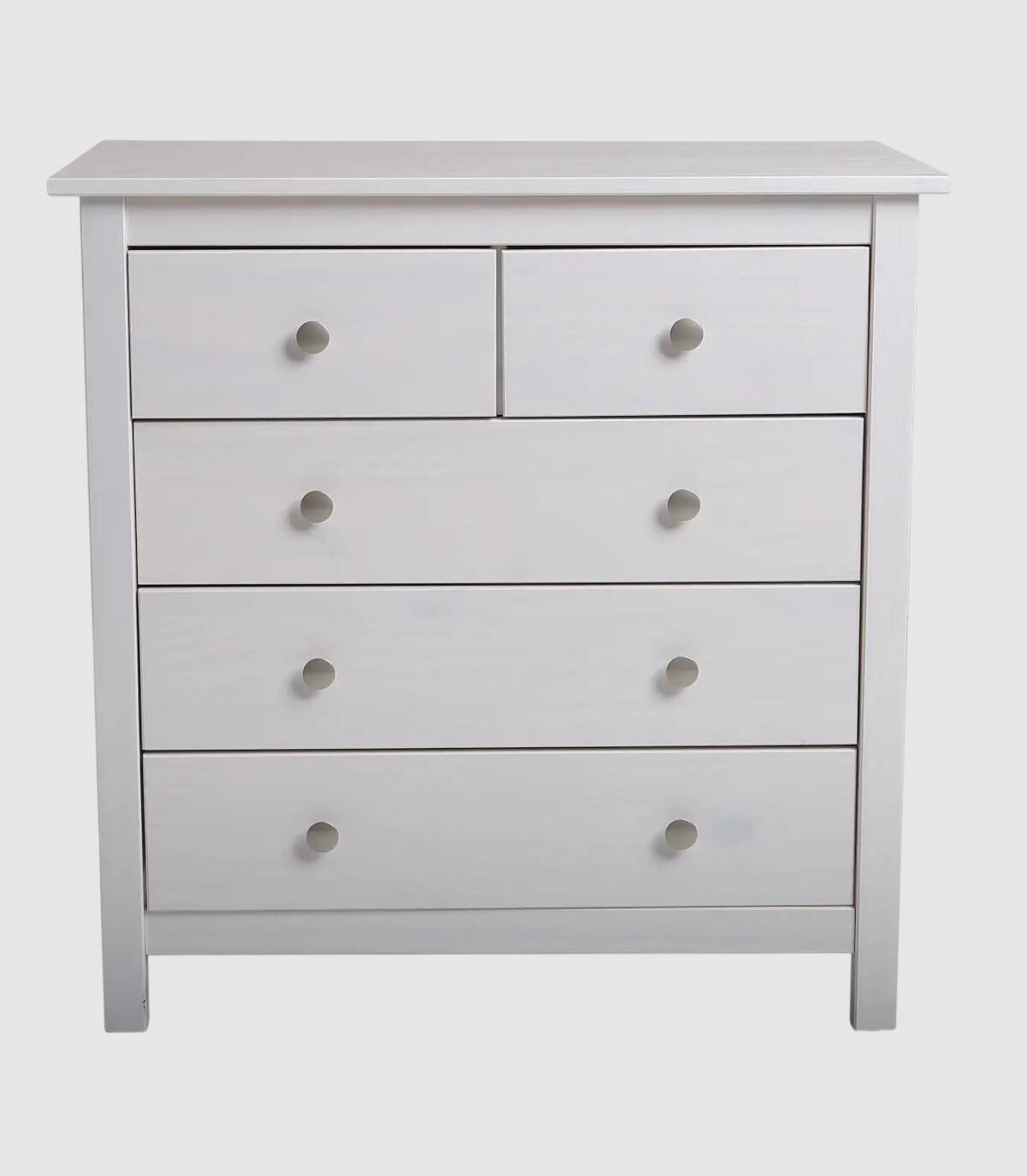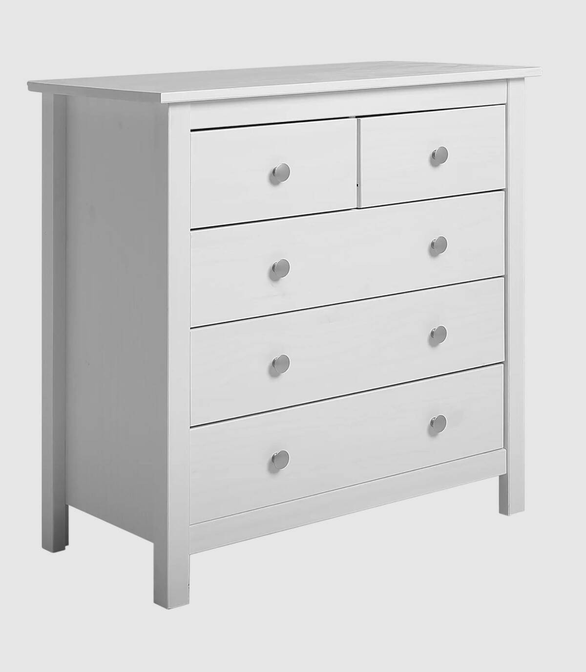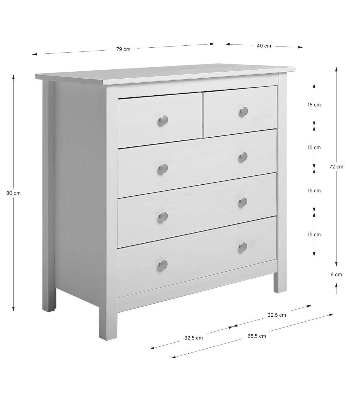 La cómoda Frielz se compone de cinco cajones con pomo, dos arriba en horizontal y tres abajo en vertical sobre cuatro patas fabricado en madera de pino pintado de color blanco.