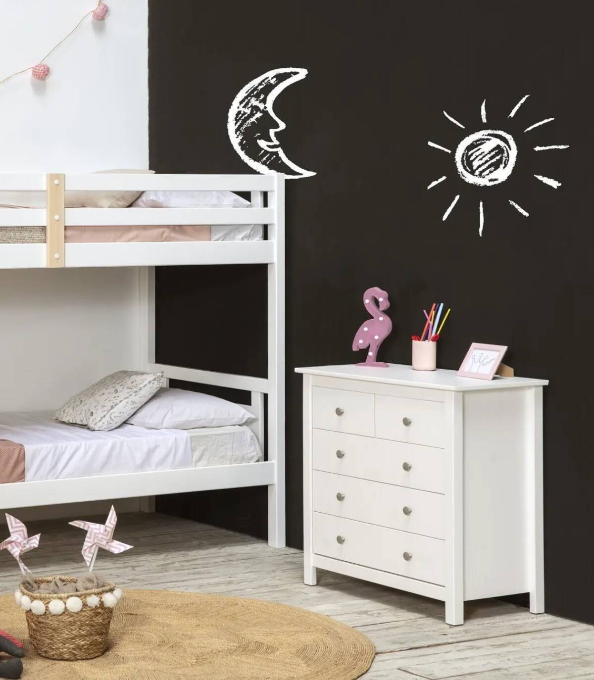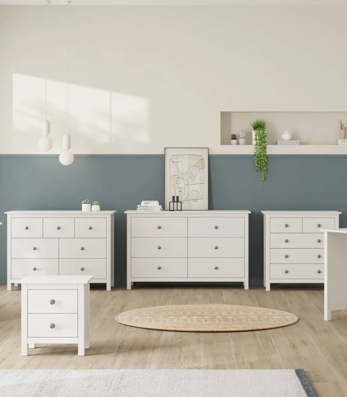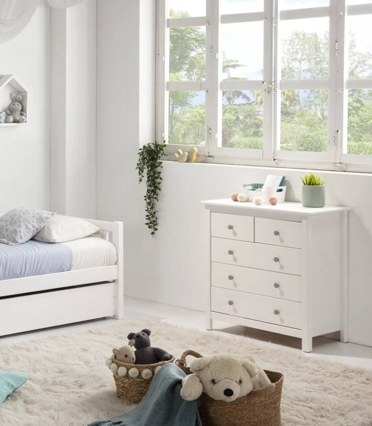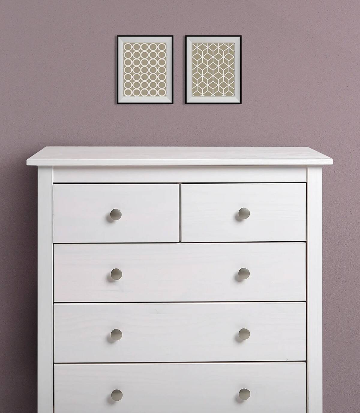 La cómoda Frielz se compone de cinco cajones con pomo, dos arriba en horizontal y tres abajo en vertical sobre cuatro patas fabricado en madera de pino pintado de color blanco.