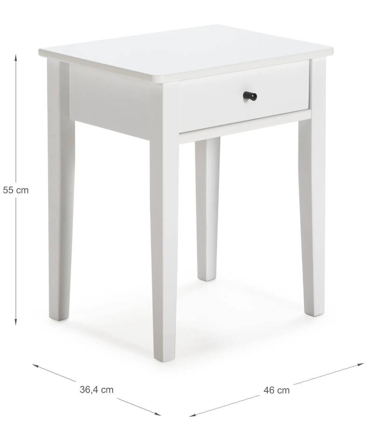 La mesita Merkes se compone de un cajón con pomo sobre cuatro patas fabricado en madera de pino y DM.