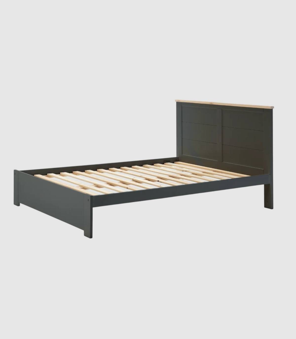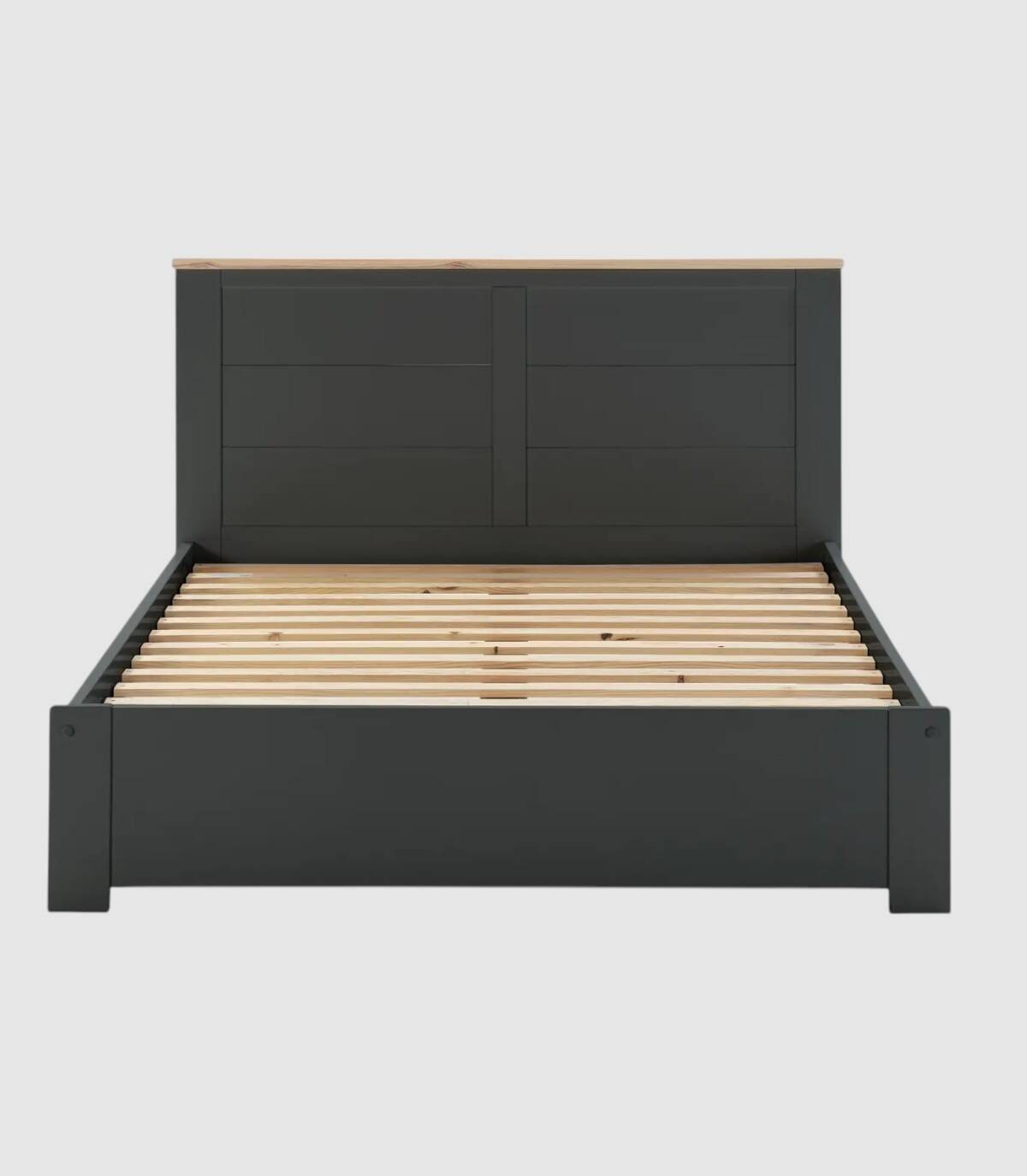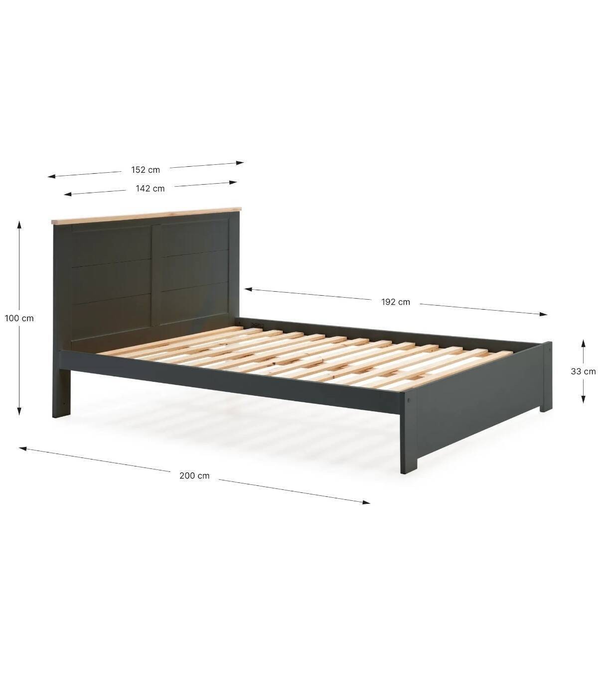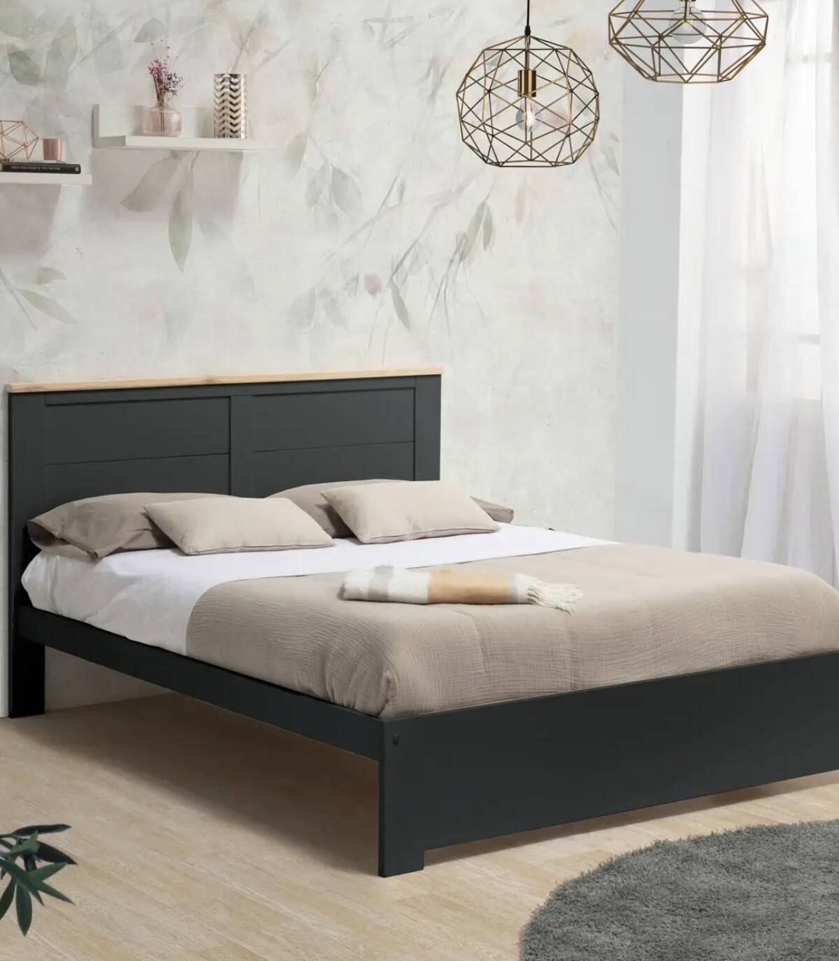 La cama Nefil se compone de somier y cabecero sobre estructura y cuatro patas con frontal fabricado en madera de pino y DM pintado de color negro.