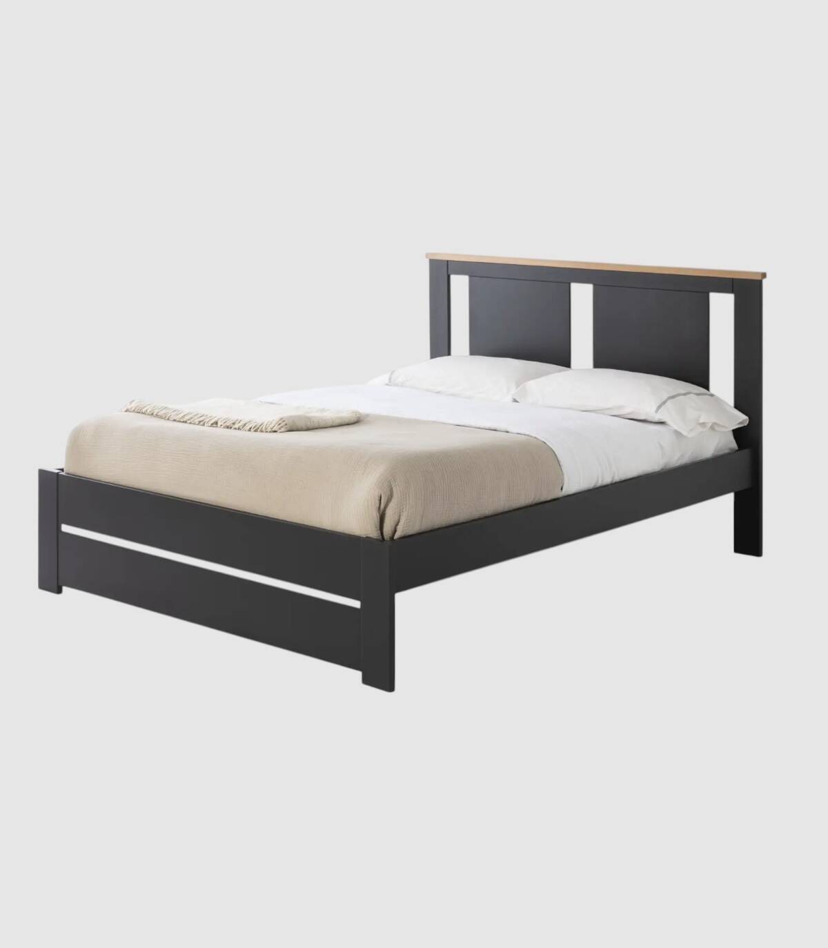 La cama Layma se compone de somier con láminas de madera color natural y cabezal con perforaciones en forma de rectangulos verticales, listón de madera arriba, sobre estructura y cuatro patas con frontal fabricado en madera de pino y DM pintado de color antracita. Apto para colchones de 135 x 190.