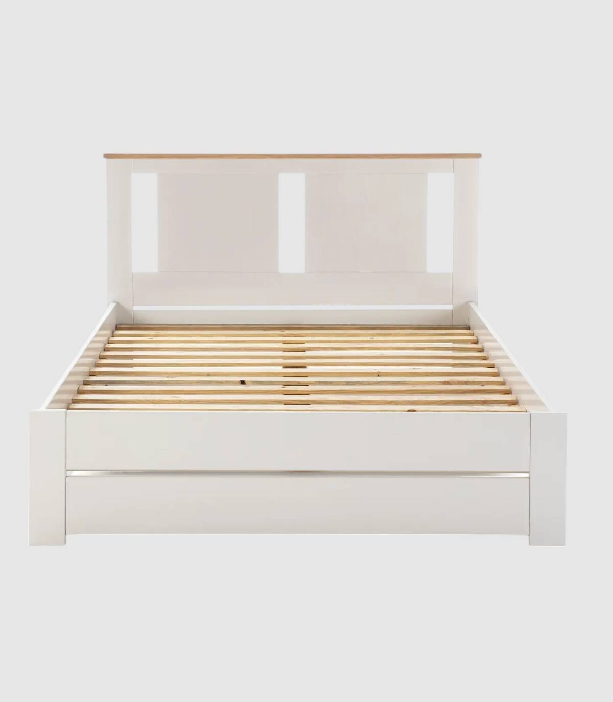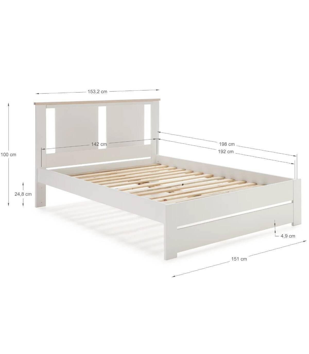 La cama Layma se compone de somier con láminas de madera color natural y cabezal con perforaciones en forma de rectangulos verticales, listón de madera arriba, sobre estructura y cuatro patas con frontal fabricado en madera de pino y DM pintado de color blanco. Apto para colchones de 135 x 190 cm.