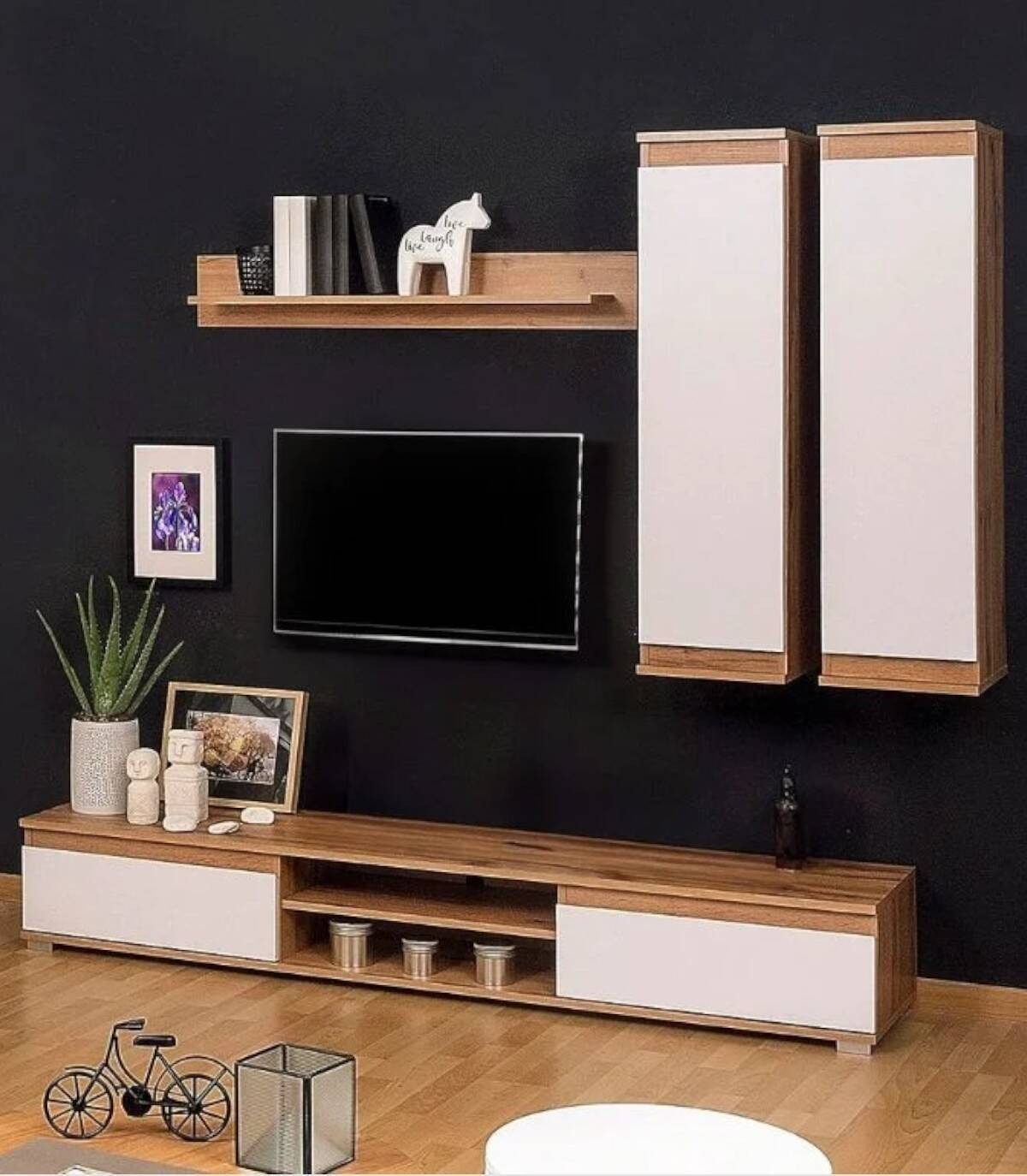 Lusia living room furniture modern, consisting of a television table with two doors and a shelf in the middle, a shelf and two cupboards that are supported on the wall. The opening of the cabinets is different, one opens to the left and the other to the right.