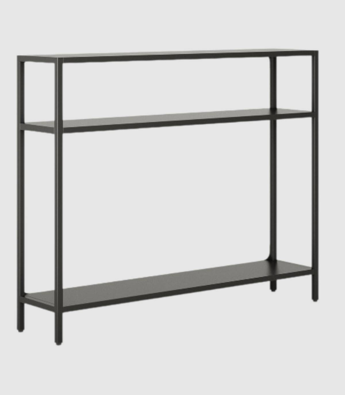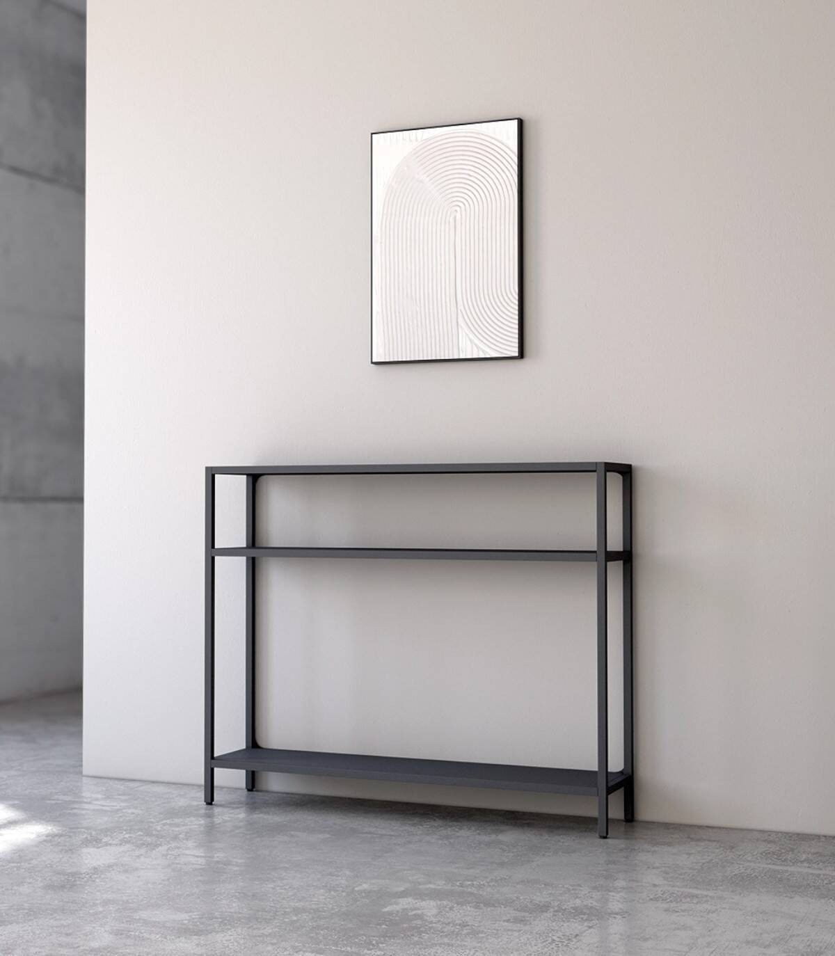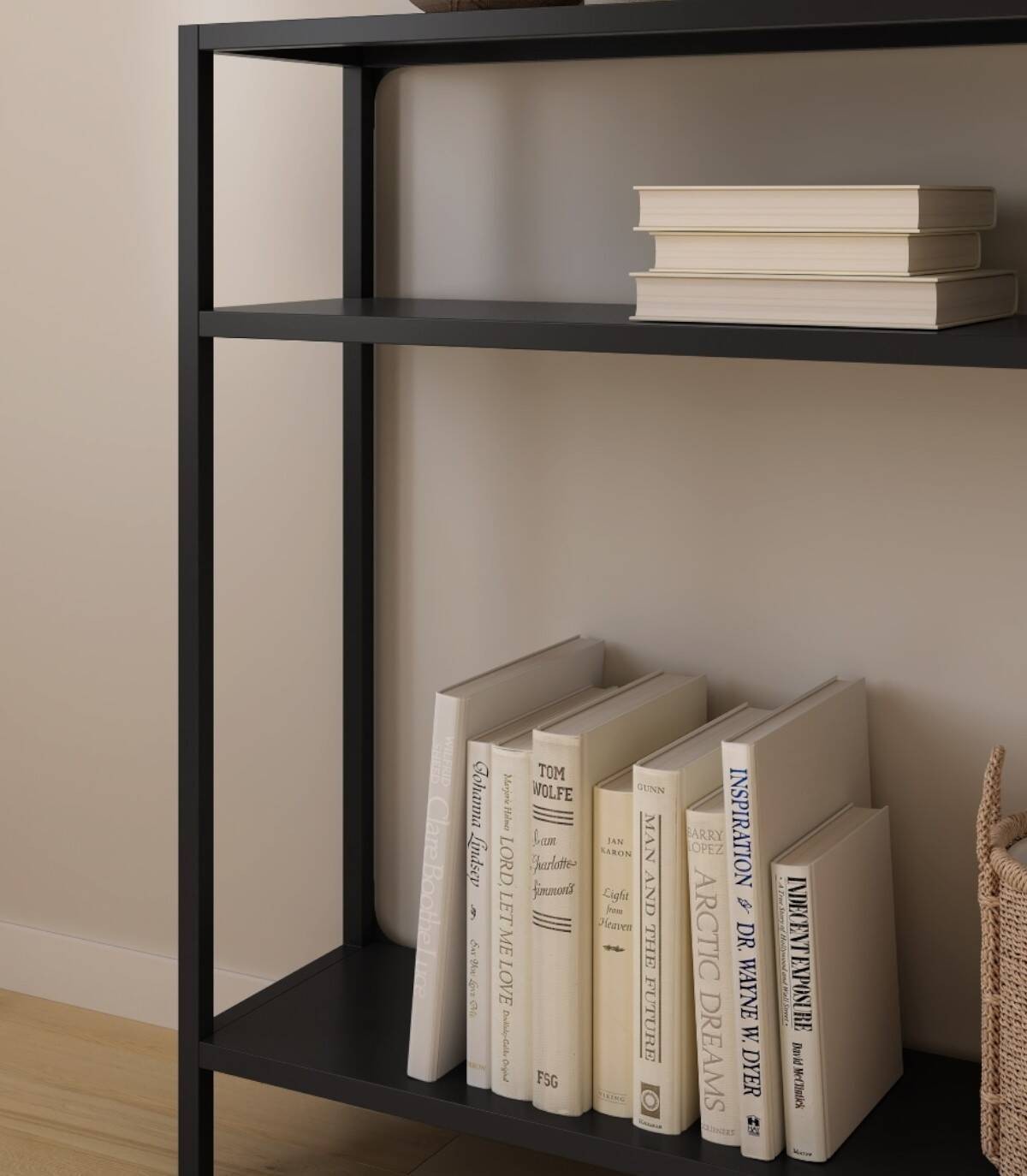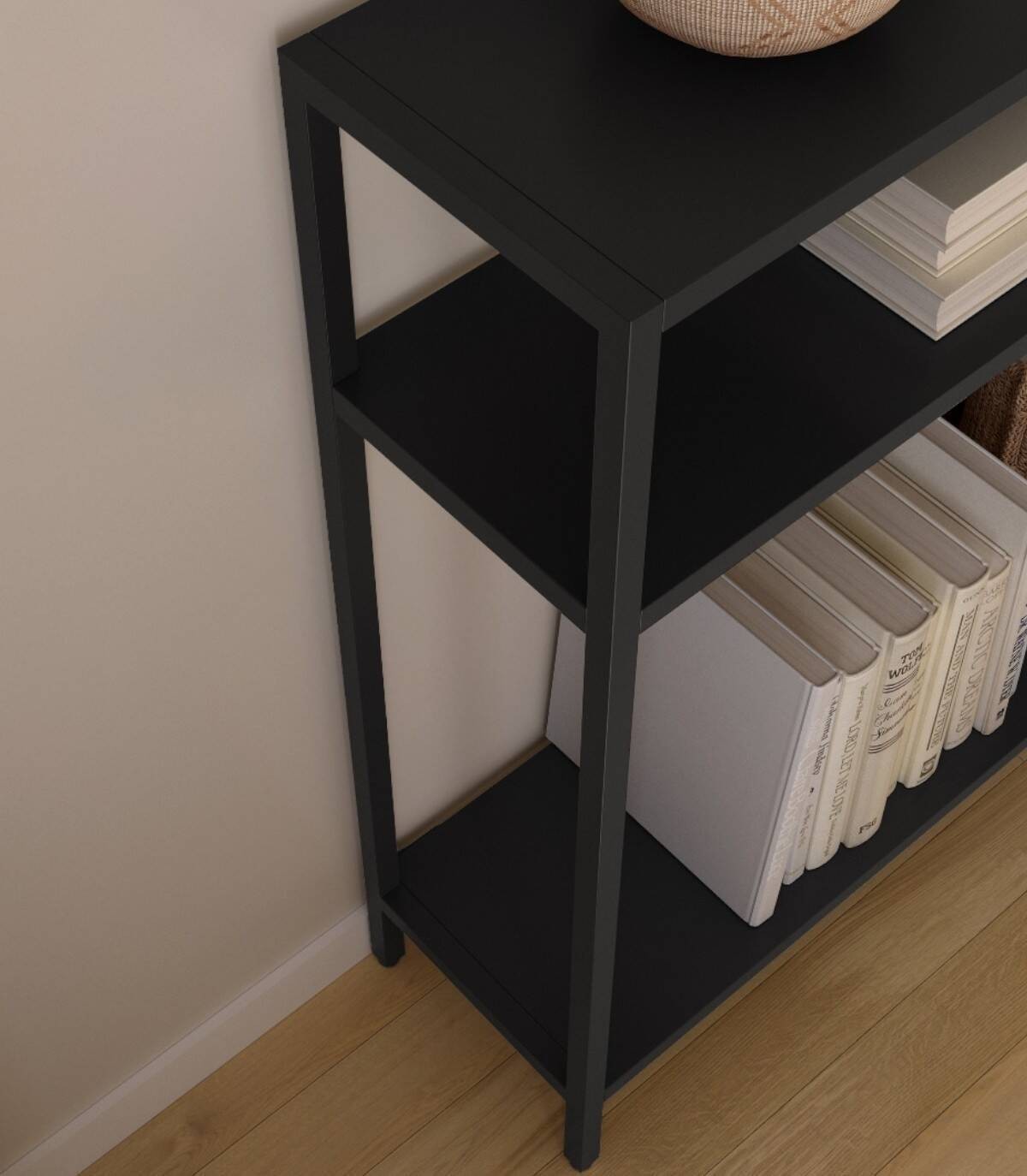 La estanteria Titania grande se compone de estructura de color negro con cuatro patas y tres baldas.