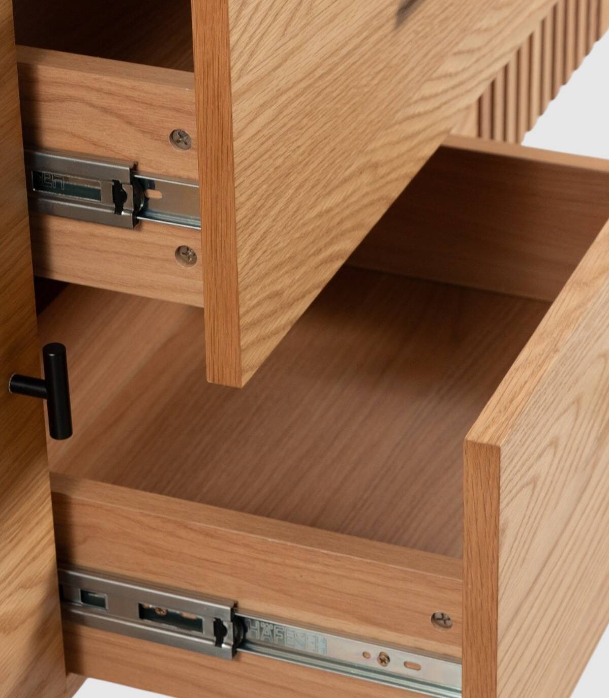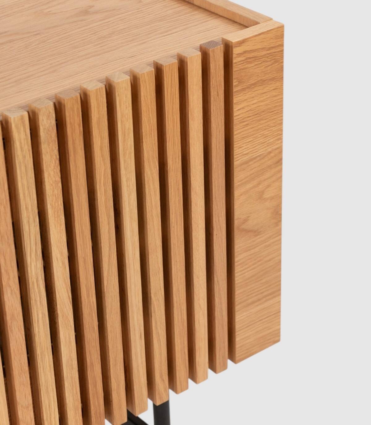 The Samurai TV cabinet consists of two doors (one with a design of spaces between vertical slats) two drawers with a natural oak veneer wood structure, handles and black painted metal legs.
