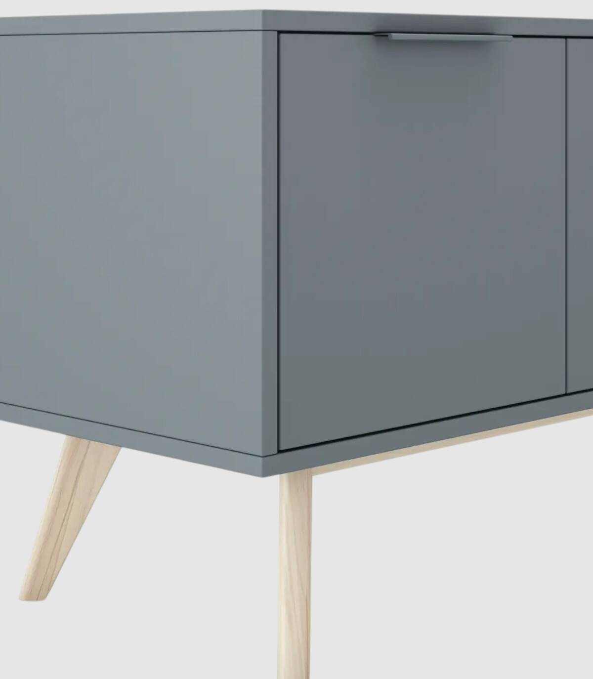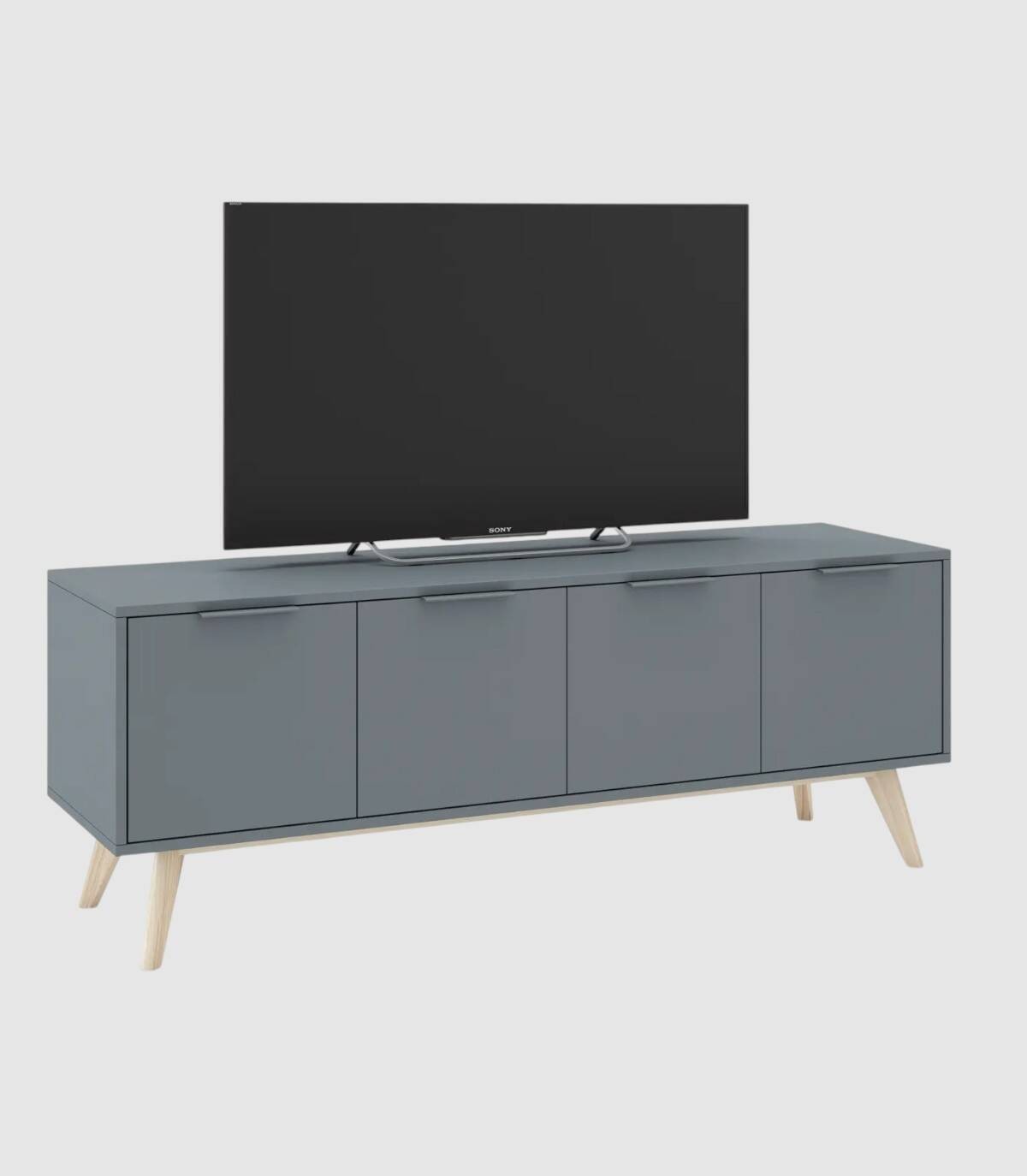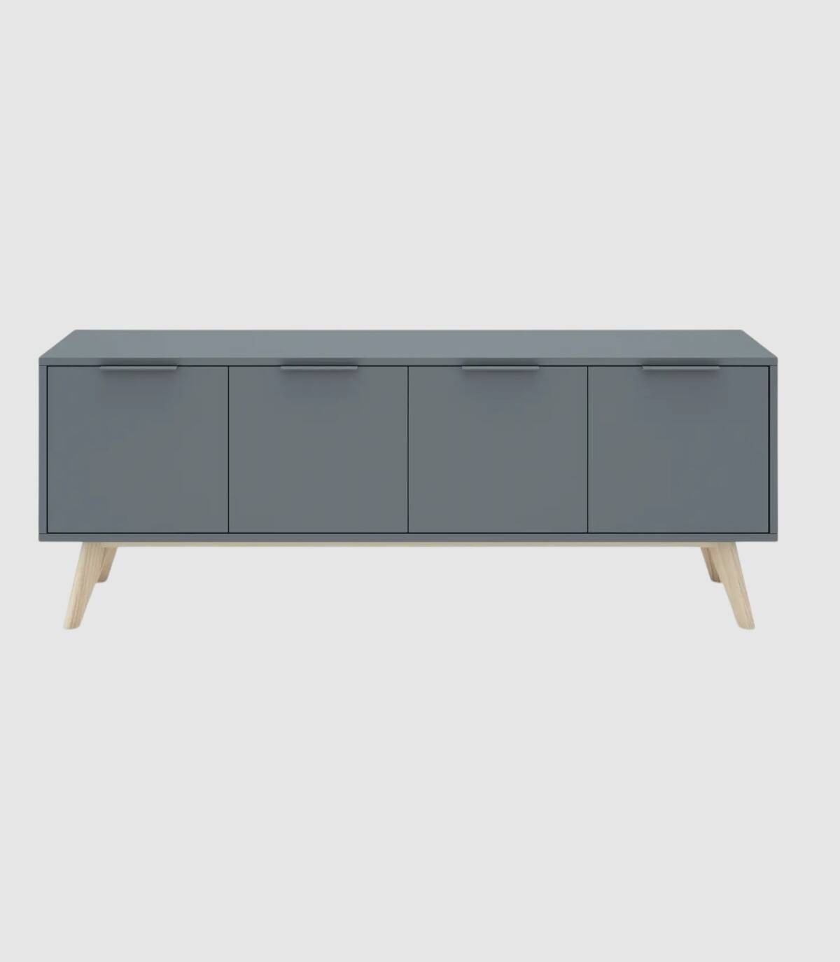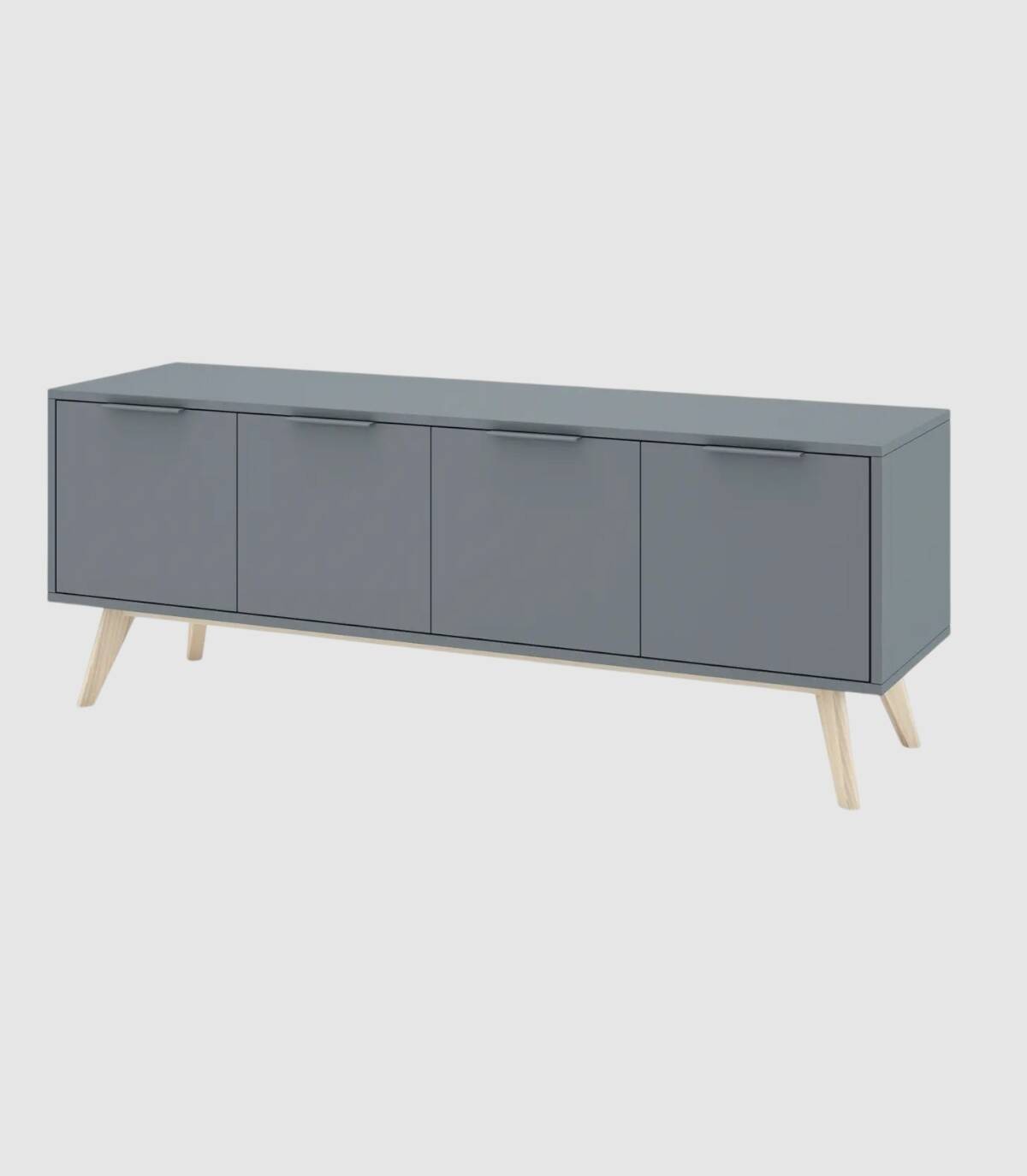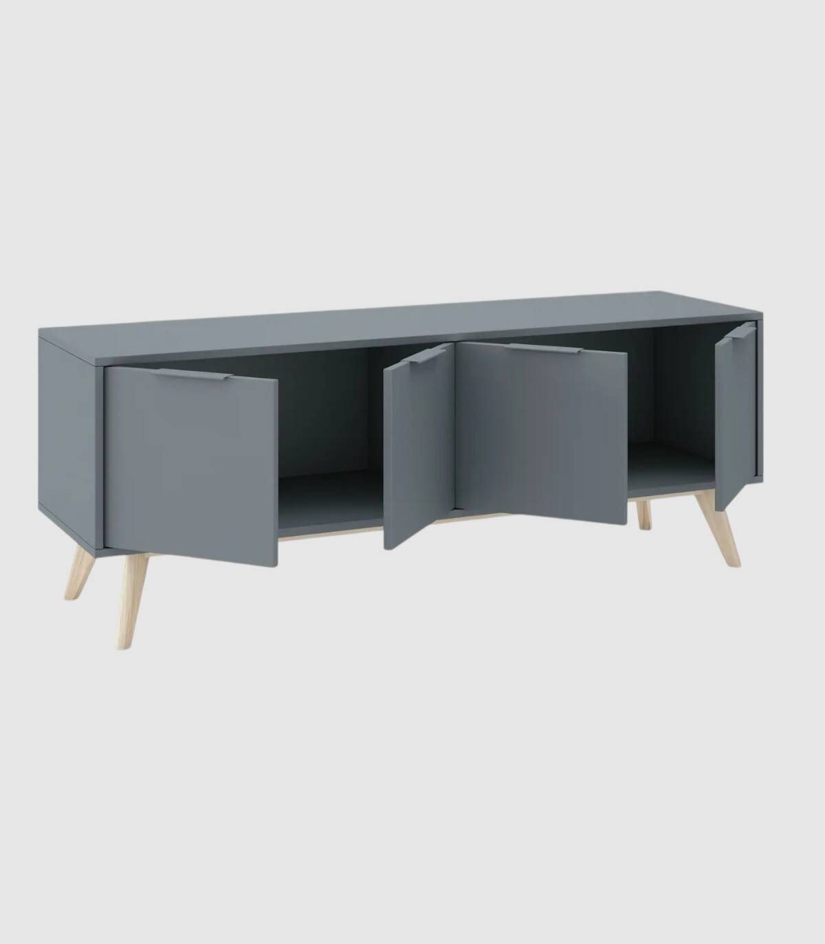 El mueble TV Deibel se compone de cuatro puertas, en horizontal, con tirador en el extremo superior y estructura de madera de pino y DM pintada de color verde kaki sobre cuatro patas de color madera.
