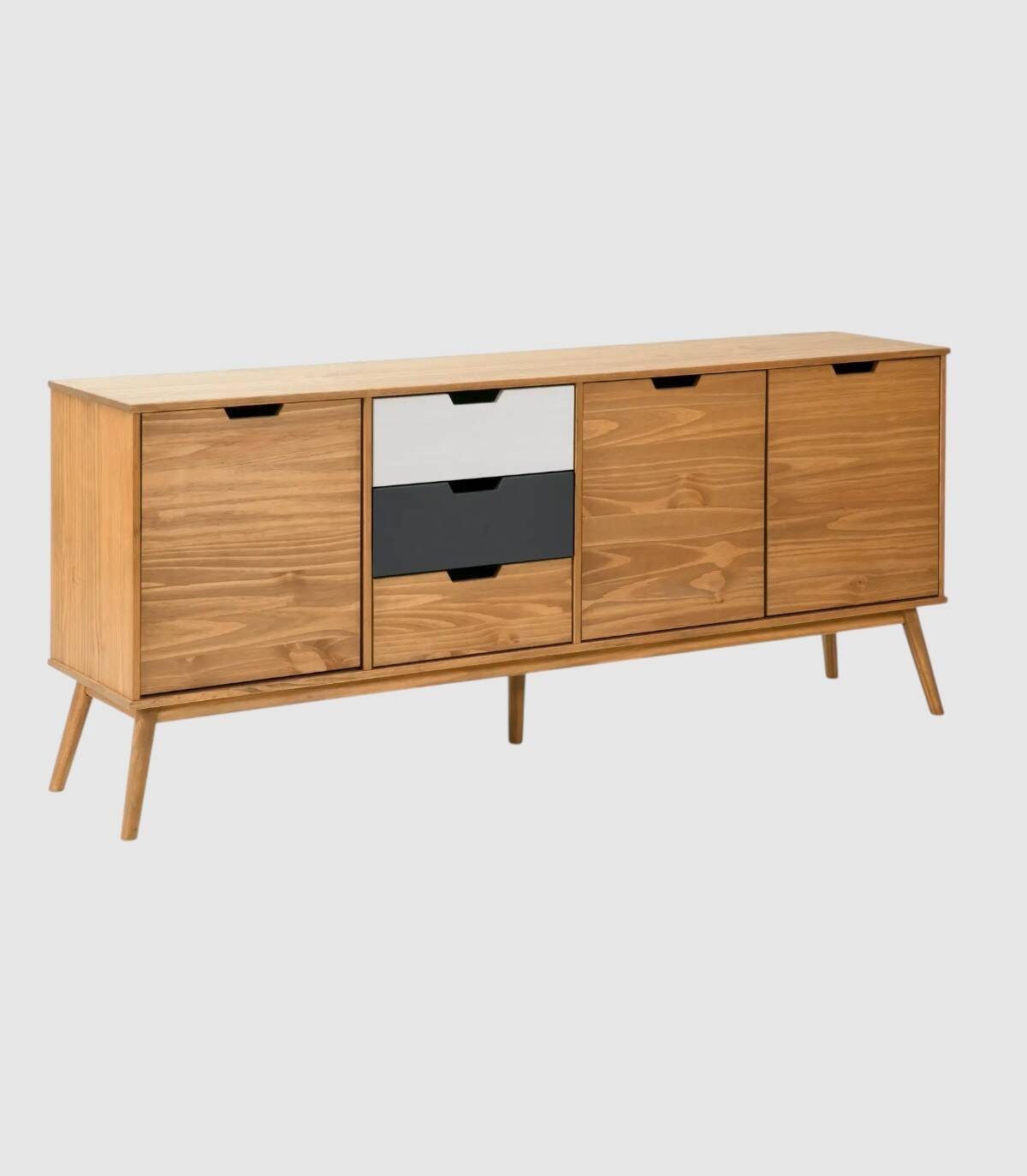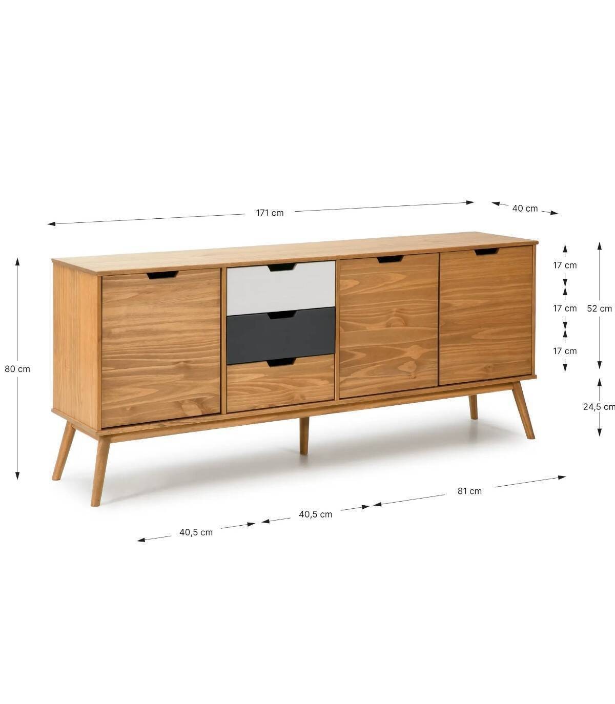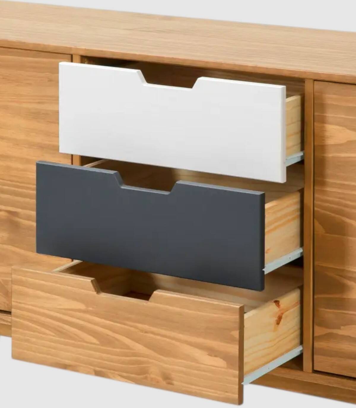 El aparador Puray se compone de tres cajones en medio, uno con frontal blanco arriba, uno con frontal gris en medio, uno de color madera en medio y tres puertas , una a la izquierda, dos a la derecha, con un hueco en el extremo superior que hace de tirador, estructura y cinco patas de pino de color madera.