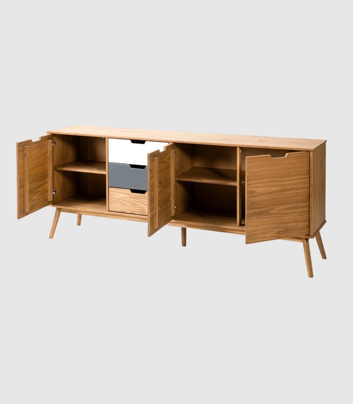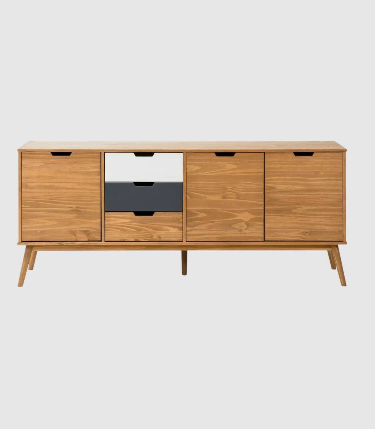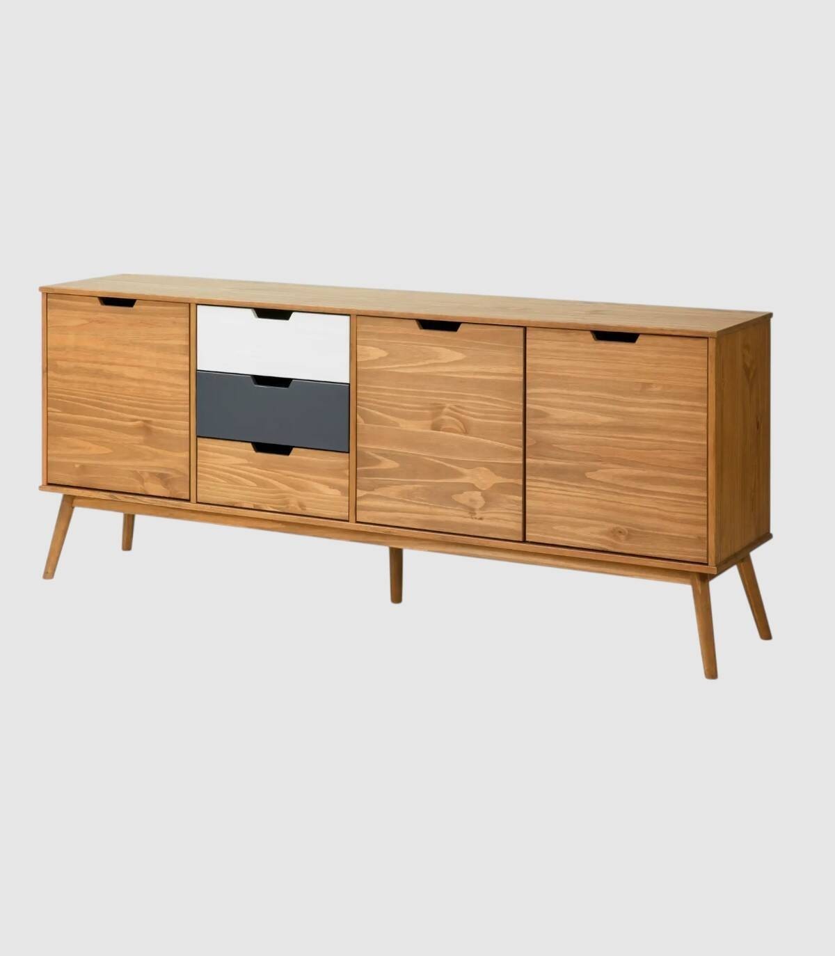 El aparador Puray se compone de tres cajones en medio, uno con frontal blanco arriba, uno con frontal gris en medio, uno de color madera en medio y tres puertas , una a la izquierda, dos a la derecha, con un hueco en el extremo superior que hace de tirador, estructura y cinco patas de pino de color madera.