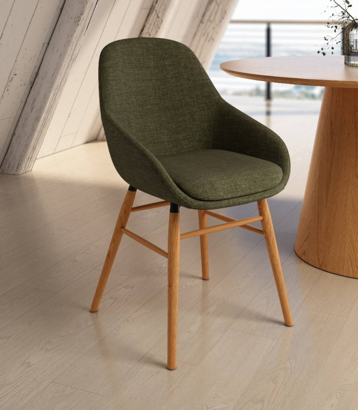 Read moreShow lessIt consists of a backrest, seat, upholstered armrests and four natural oak-coloured wooden legs.