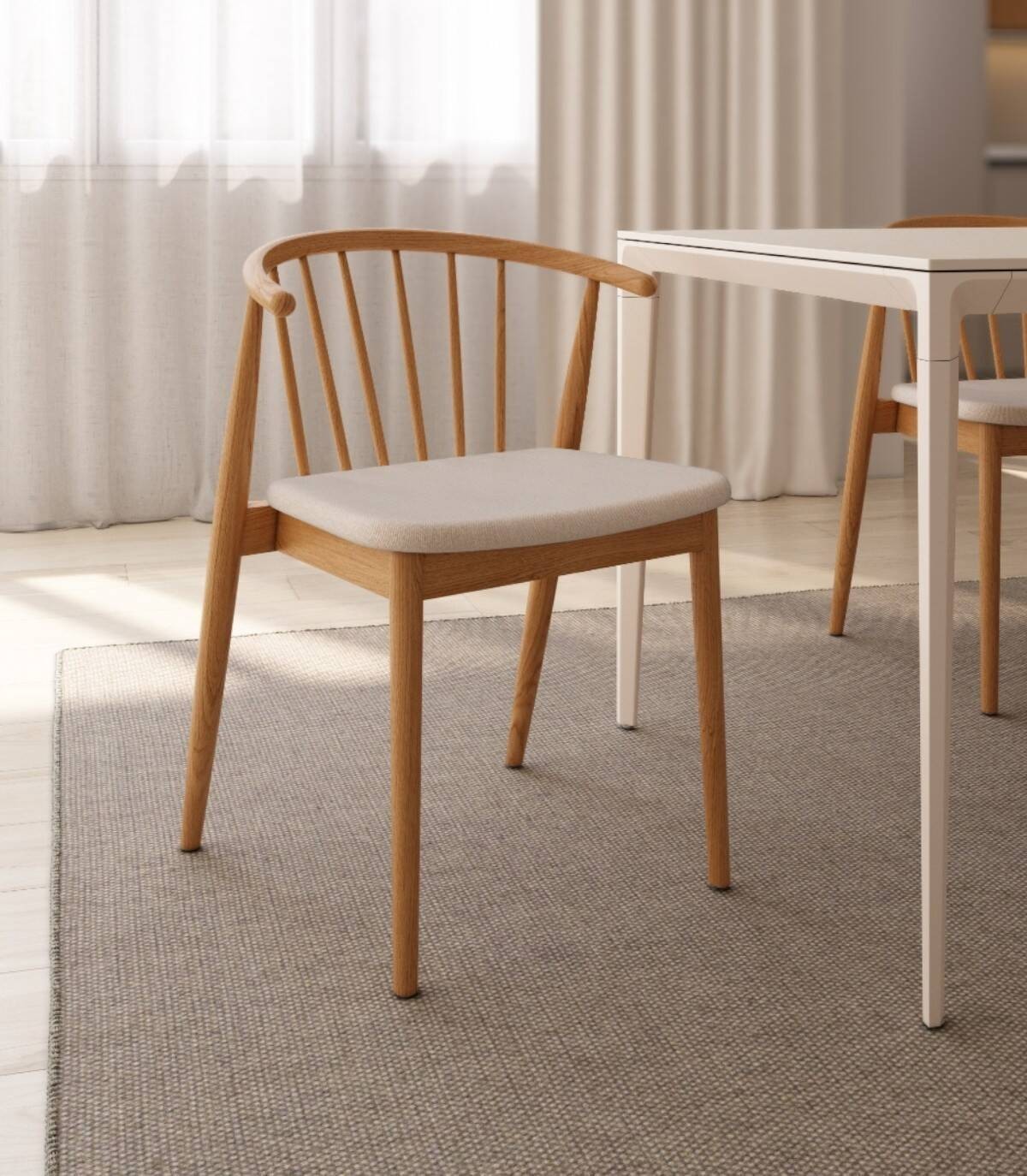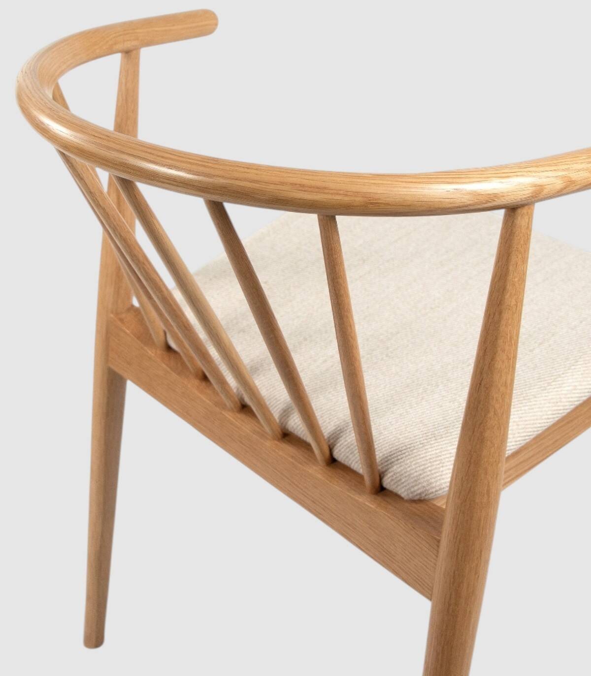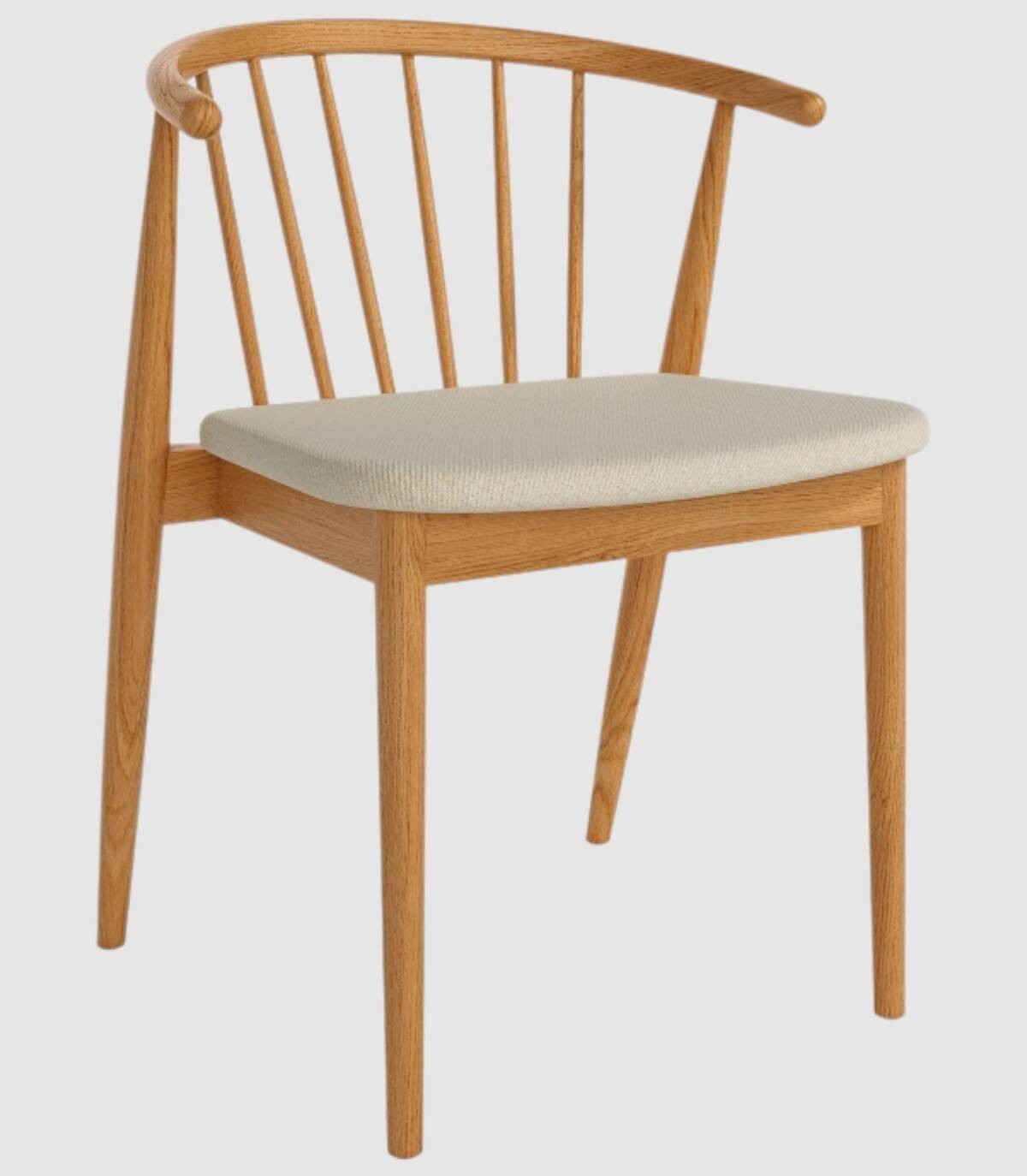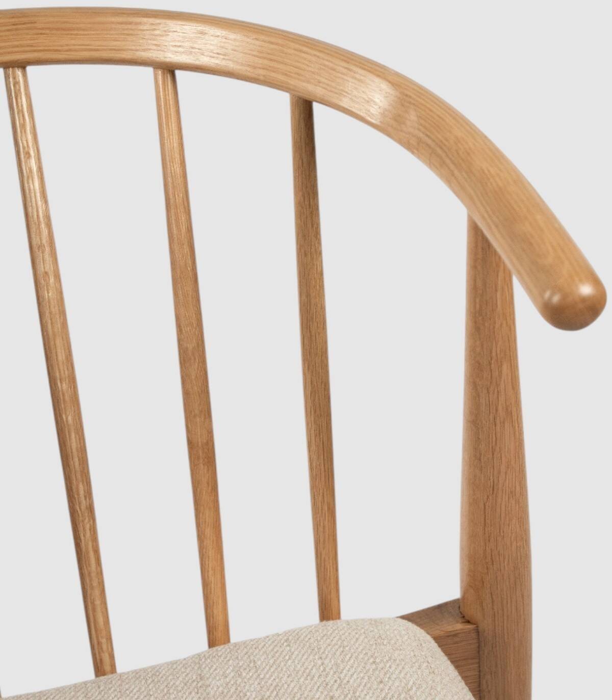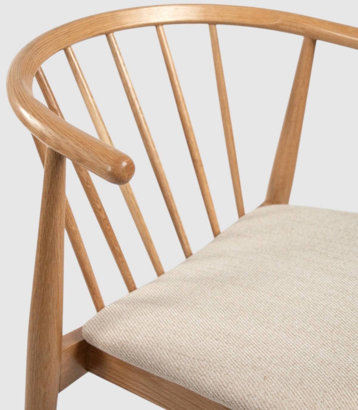 Read moreShow lessIt is made up of a natural oak-coloured wooden backrest with a vertical rod design, four wooden legs and an upholstered seat.