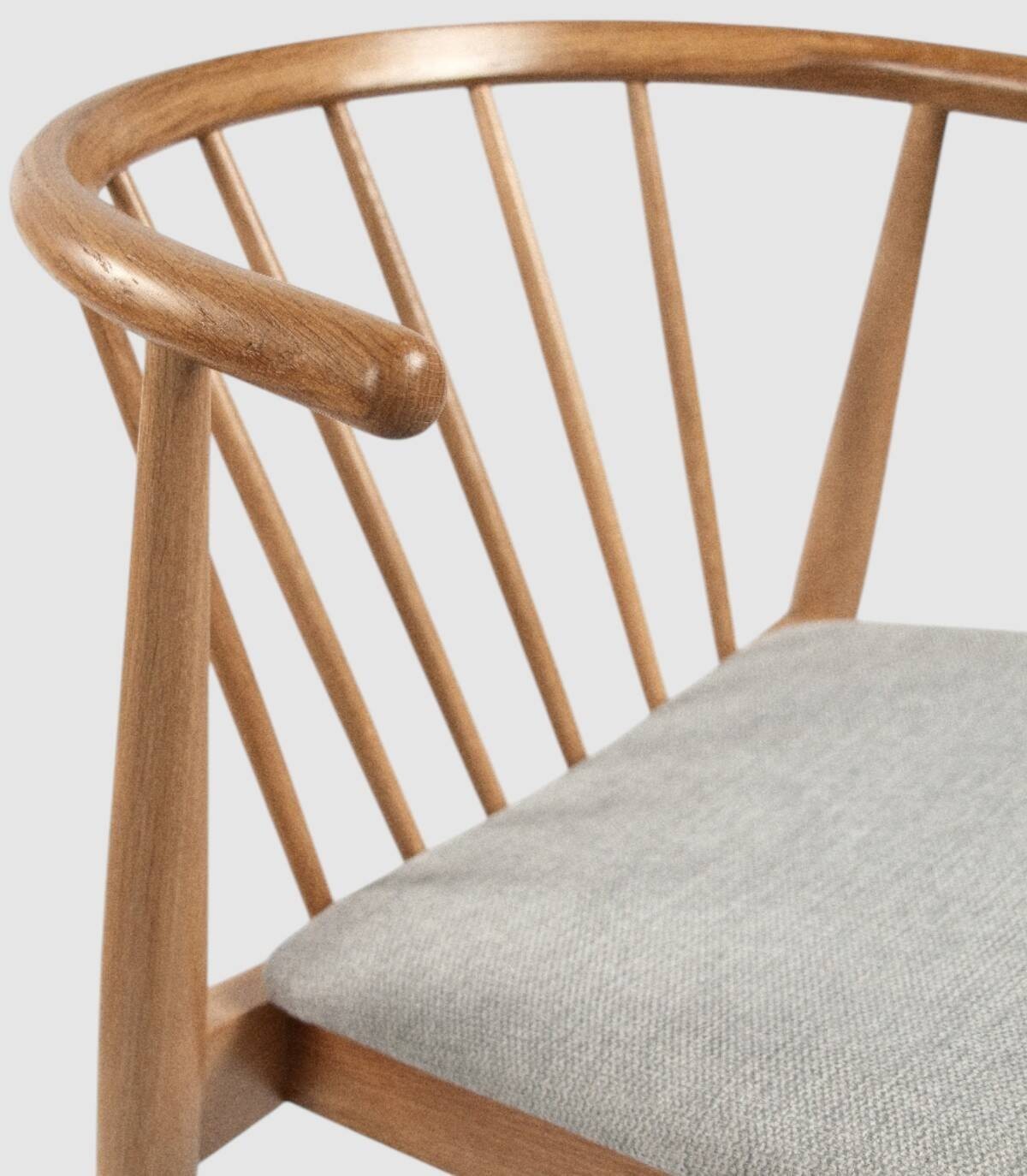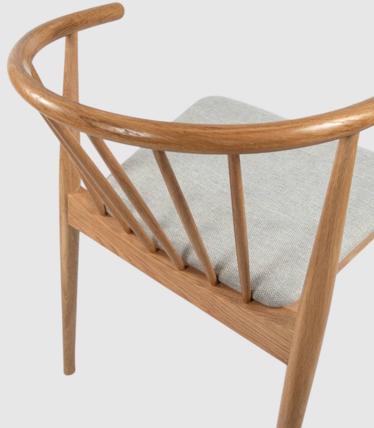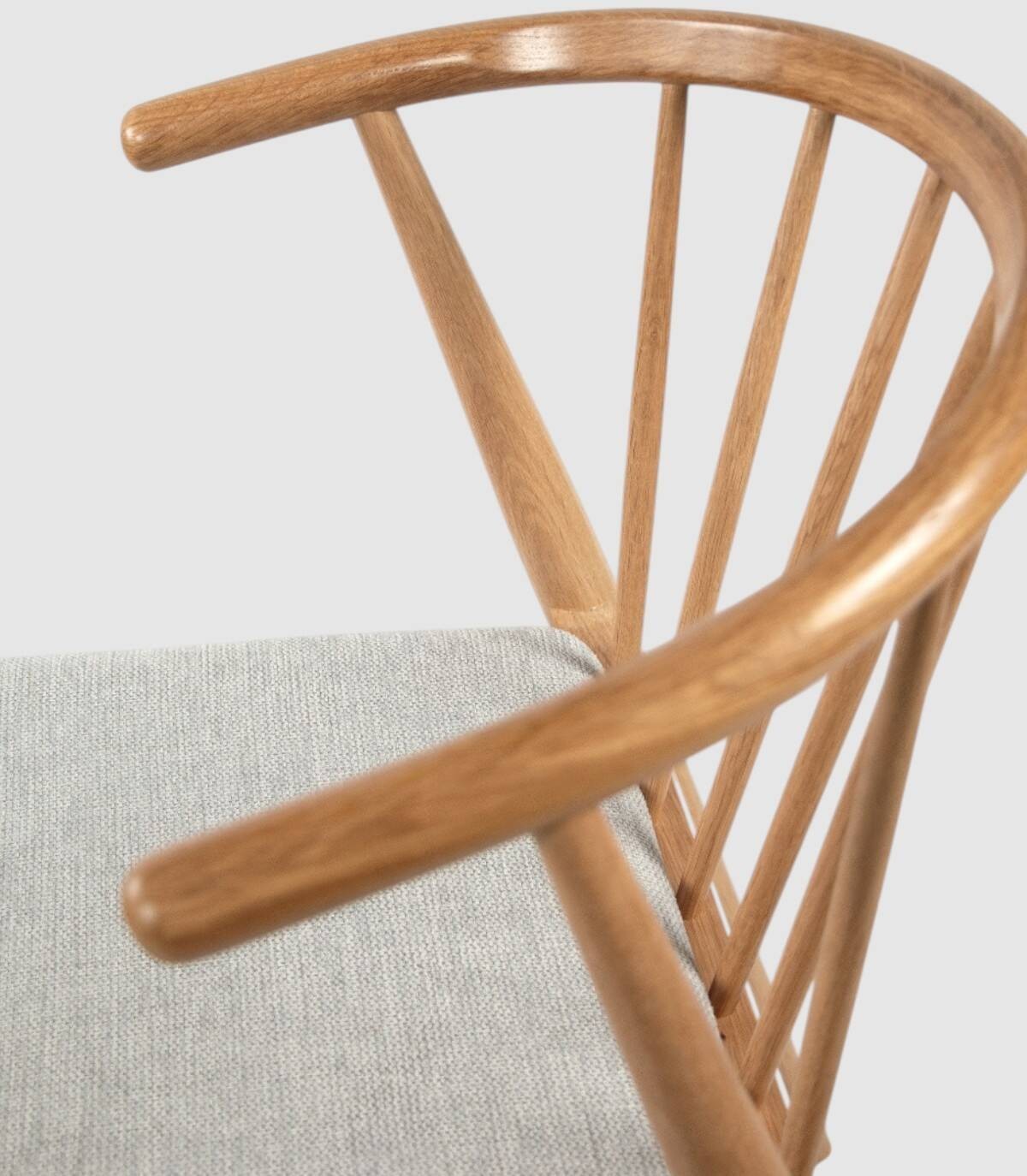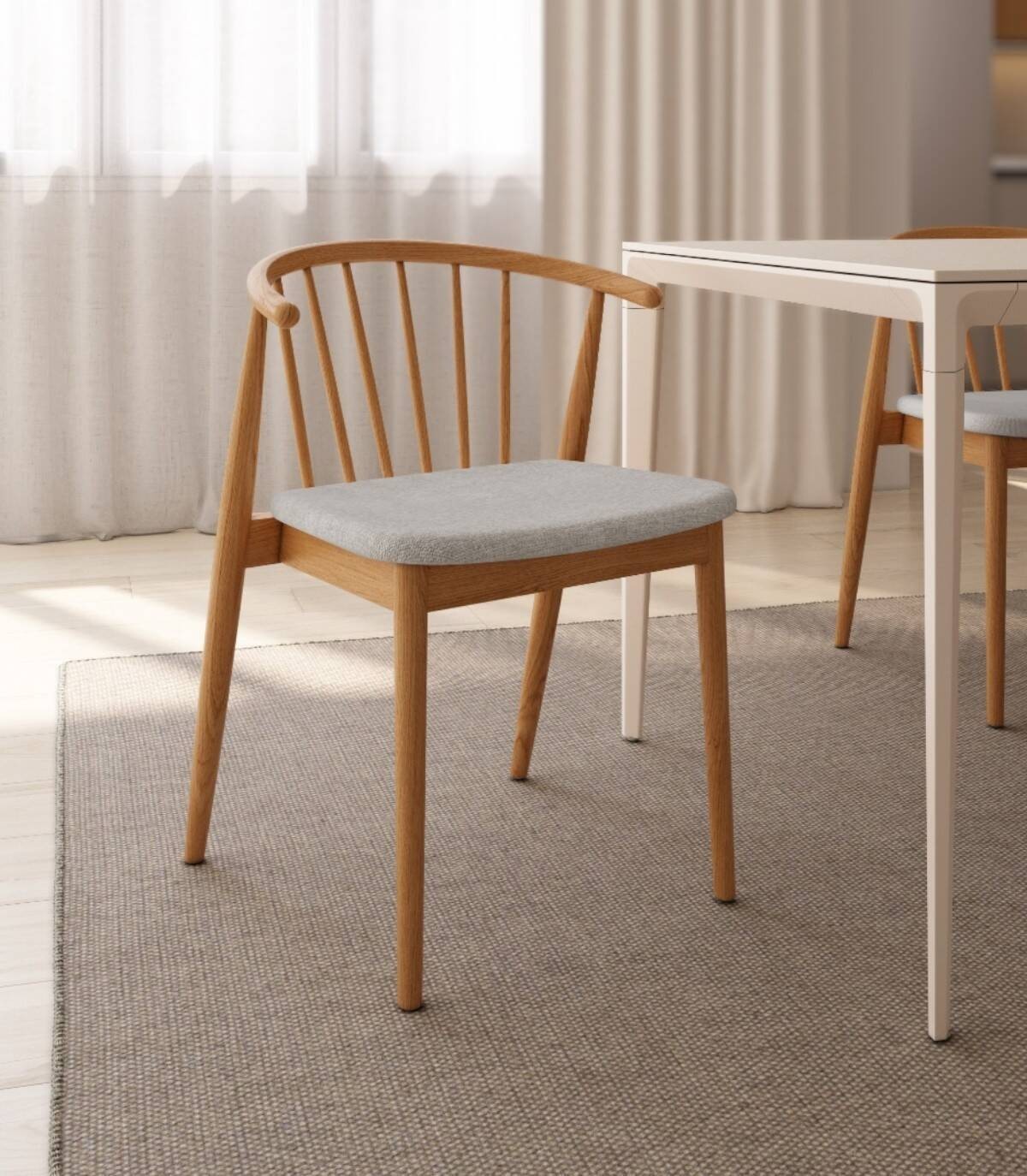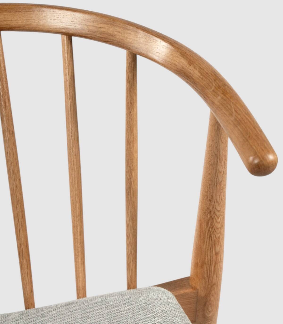 Read moreShow lessIt is made up of a natural oak-coloured wooden backrest with a vertical rod design, four wooden legs and an upholstered seat.