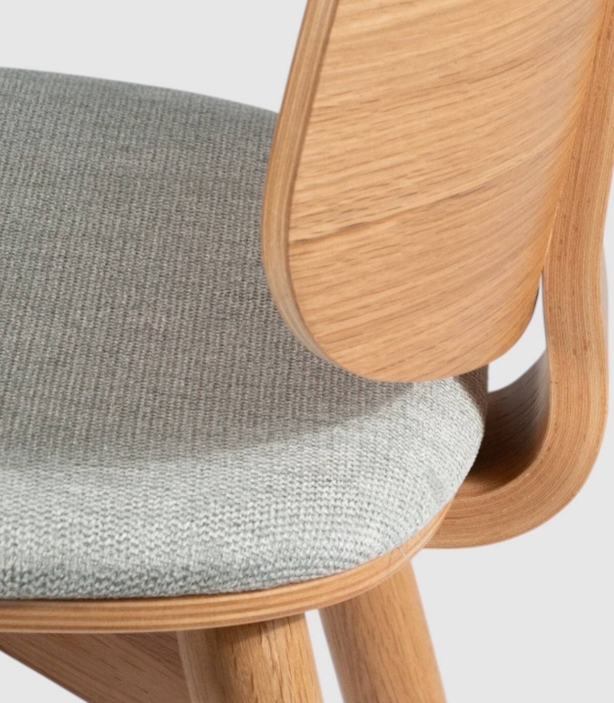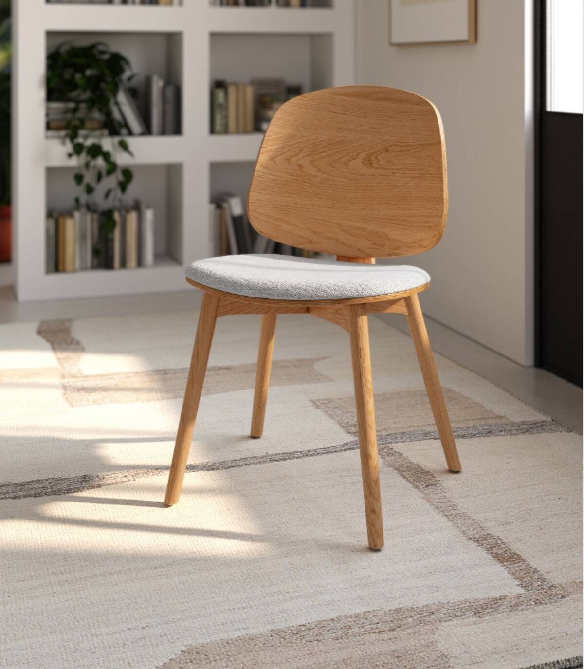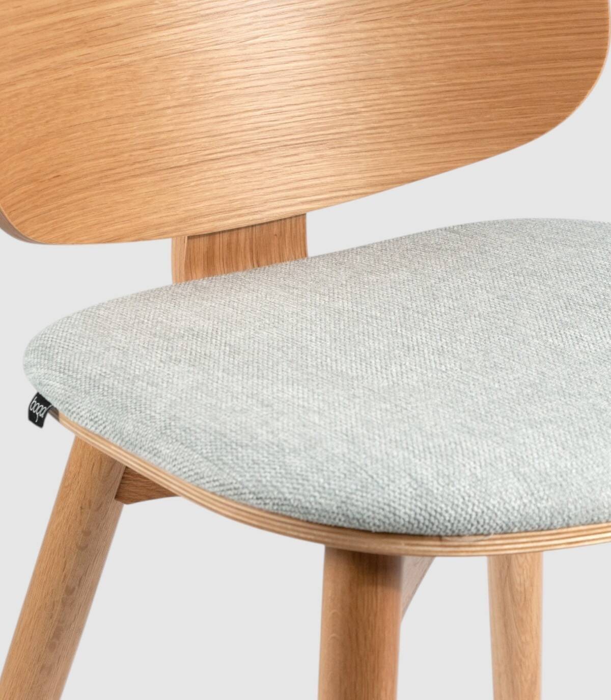 Read moreShow lessIt is made up of a smooth backrest made of natural oak-coloured wood, four wooden legs and an upholstered seat.