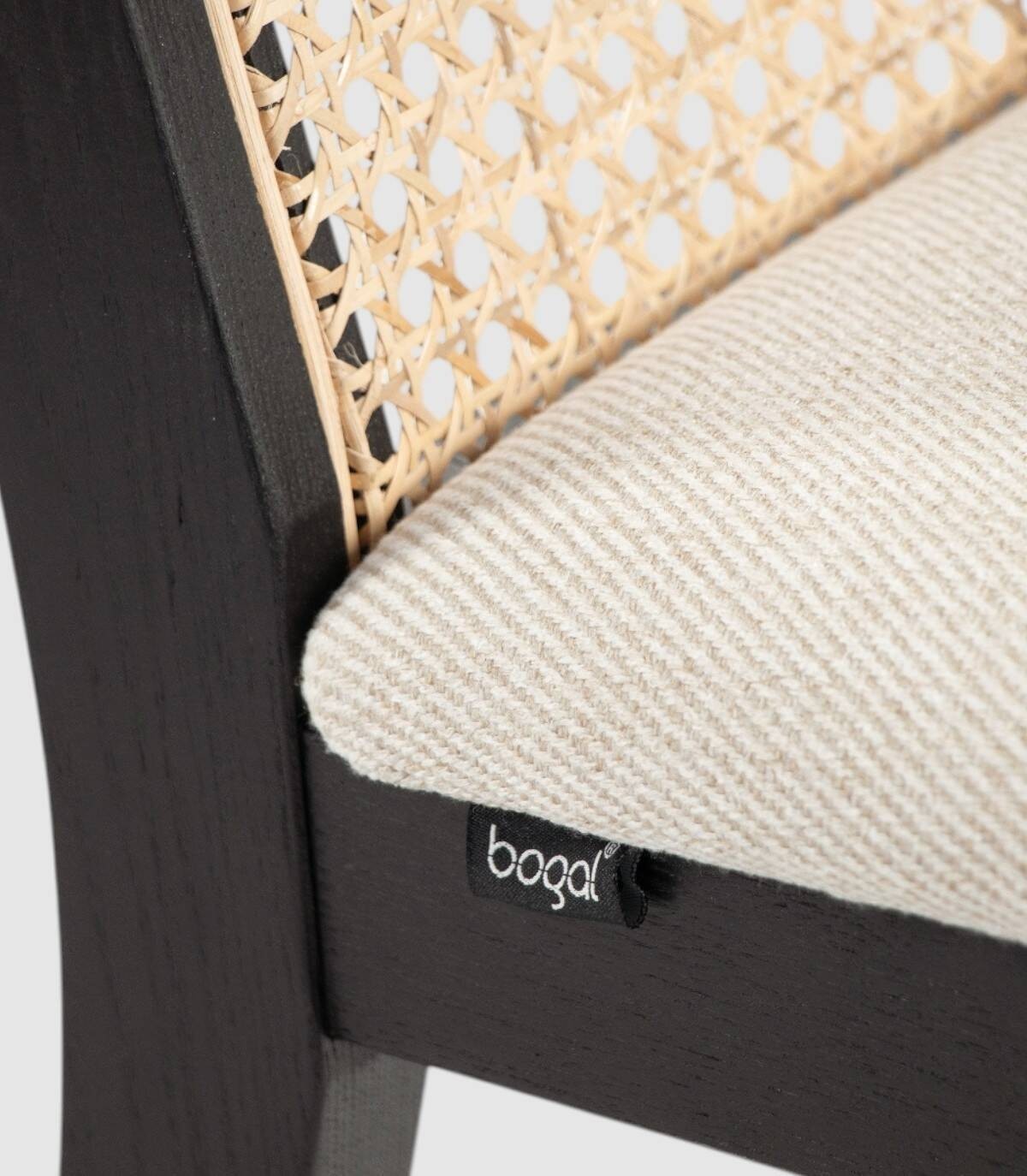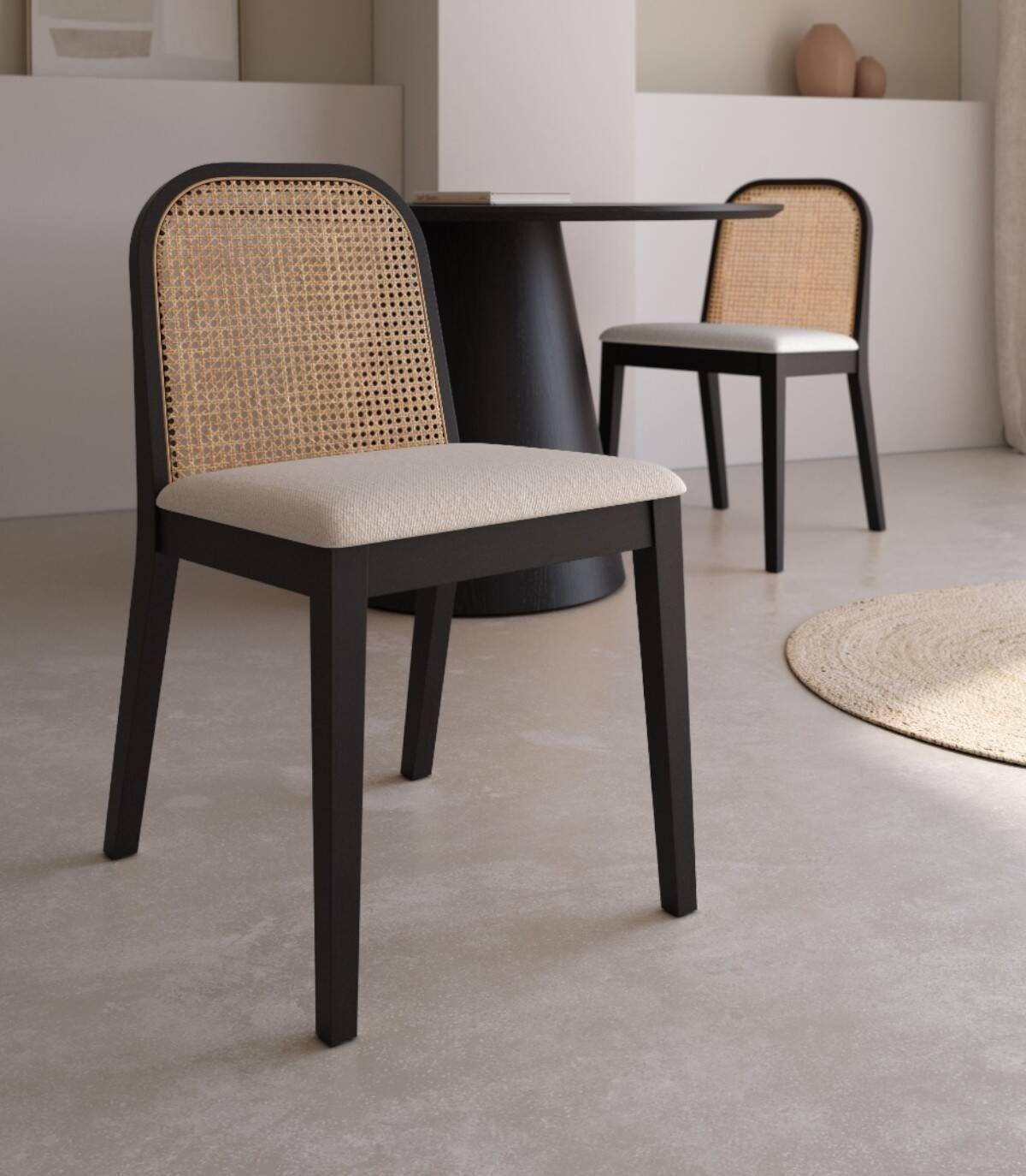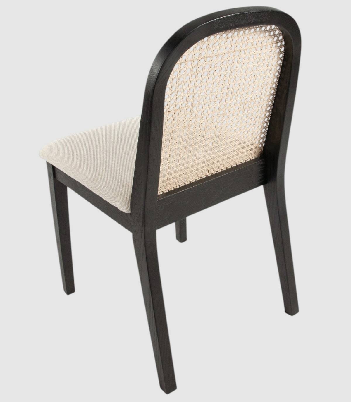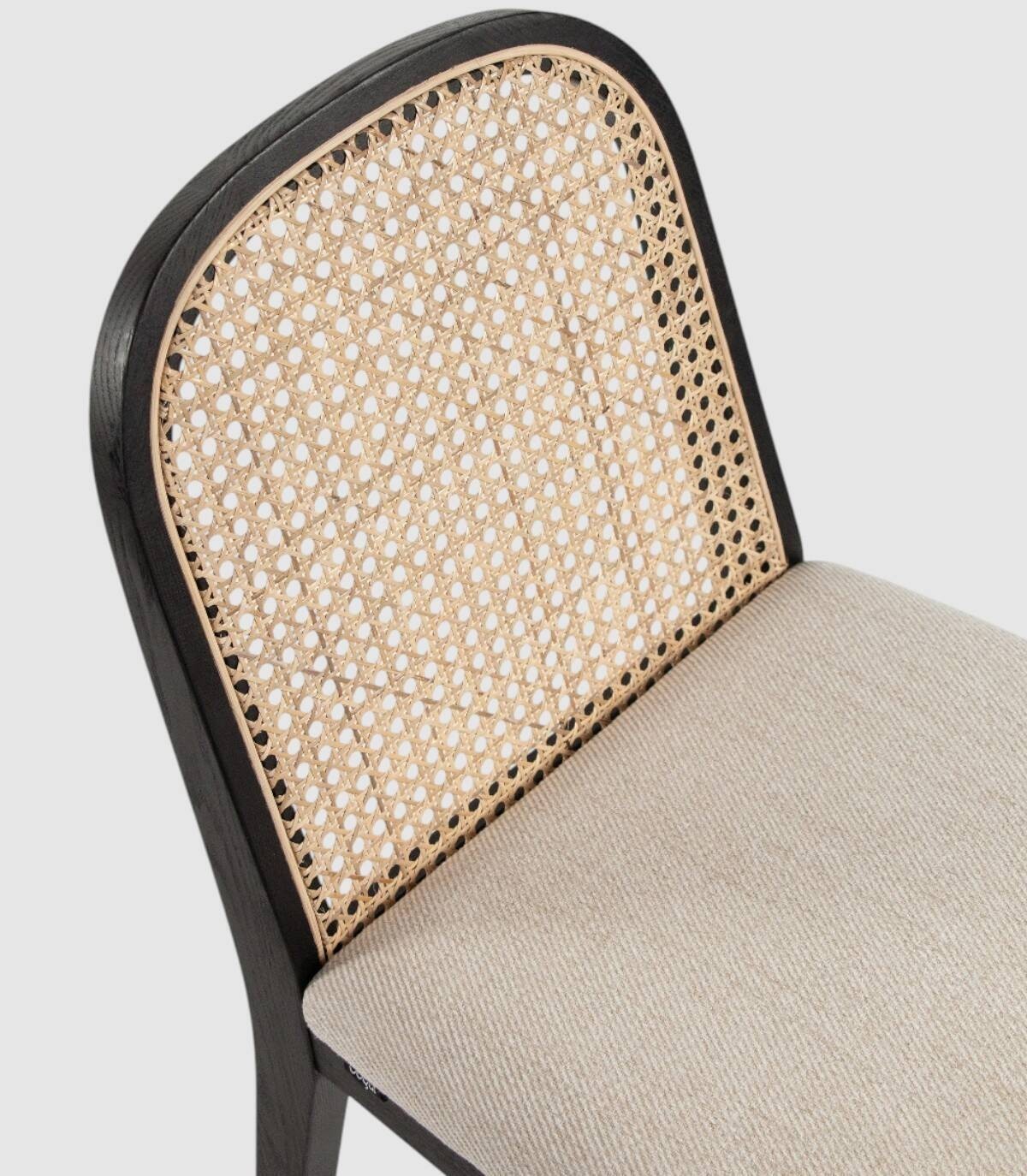 Read moreShow lessIt is made up of an upholstered seat, a natural wicker and wood backrest, and black ash-coloured wooden legs.