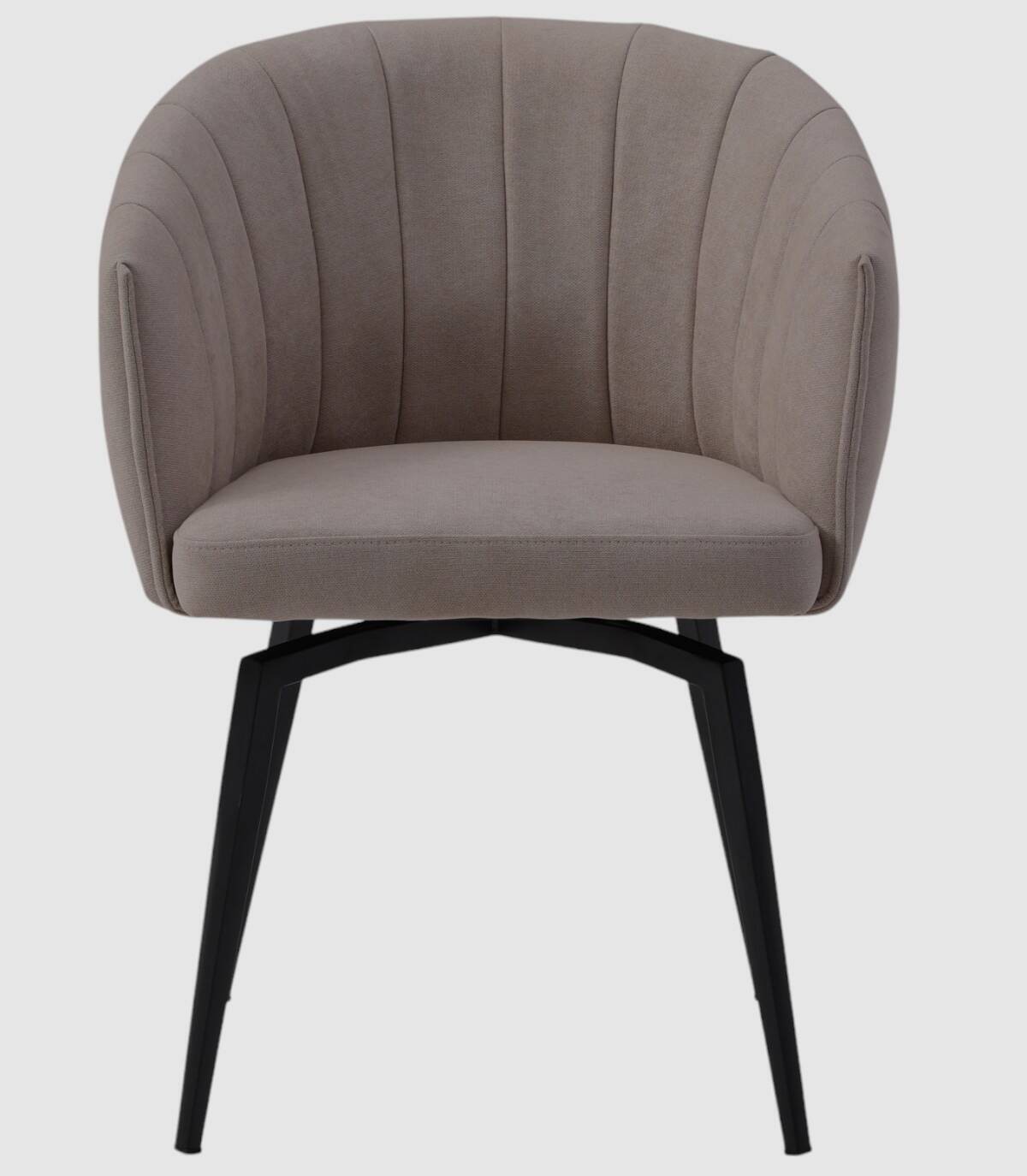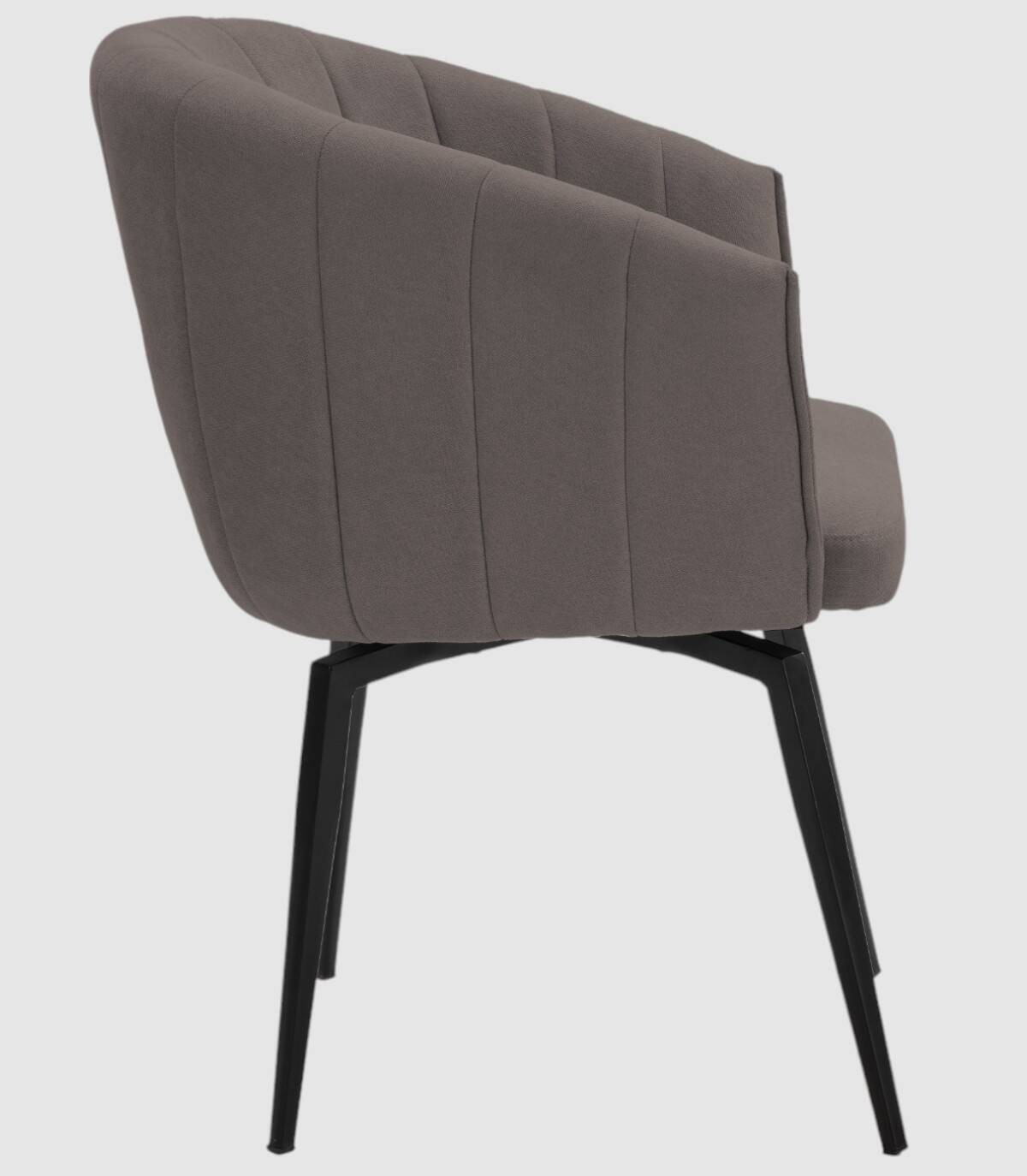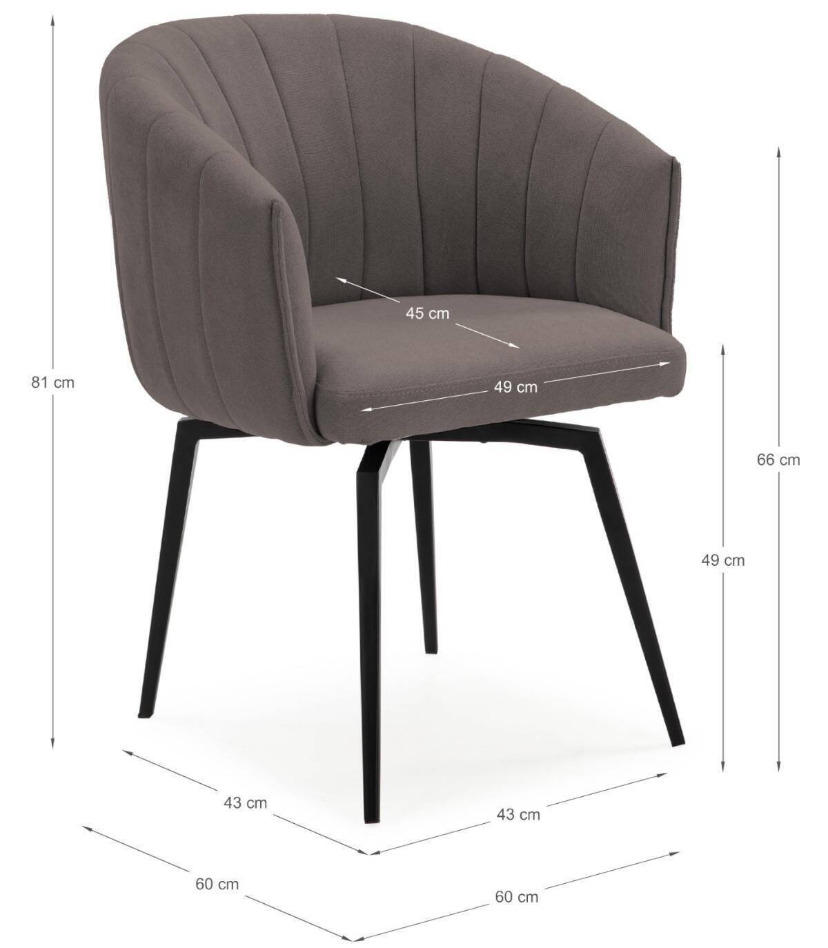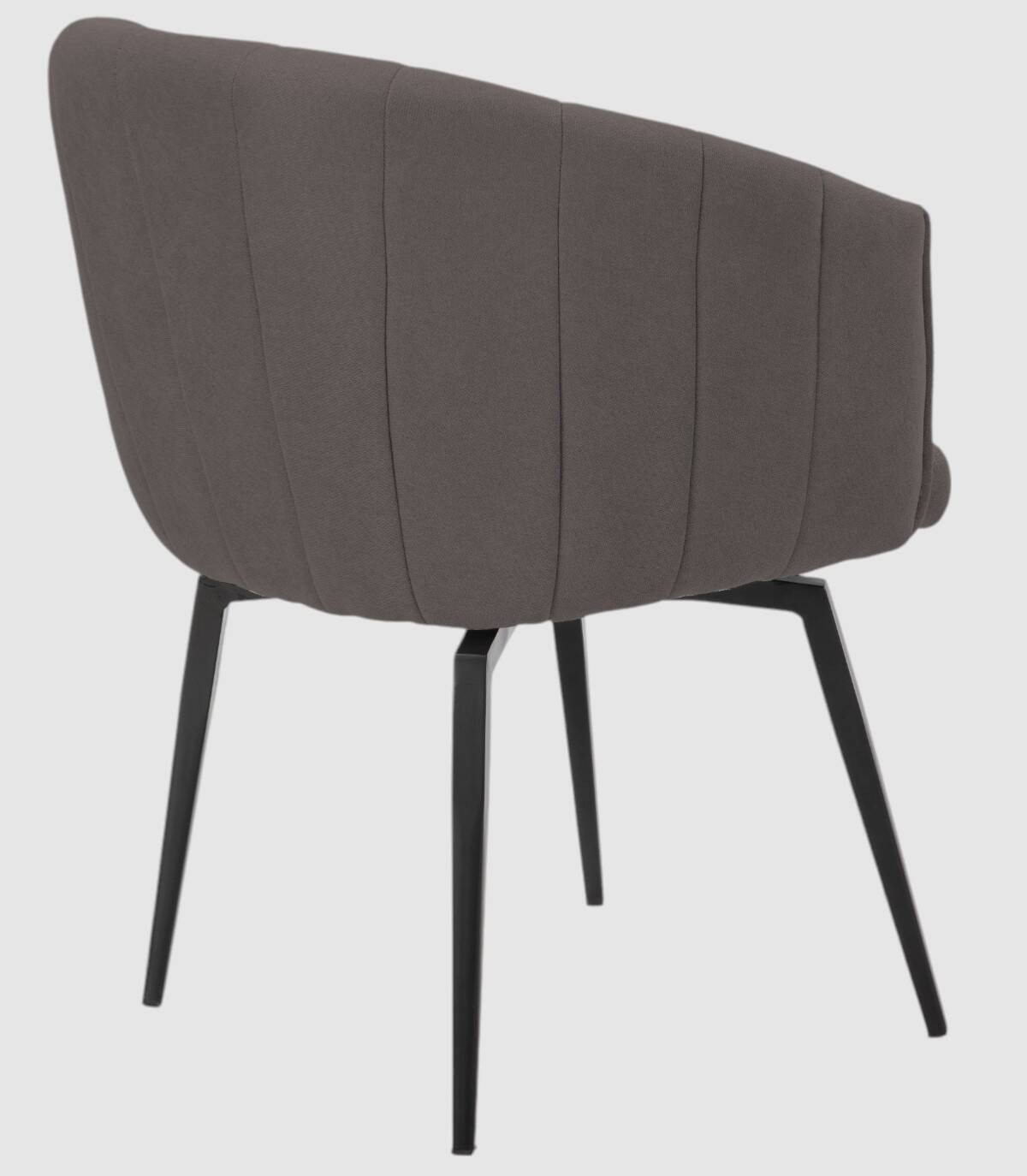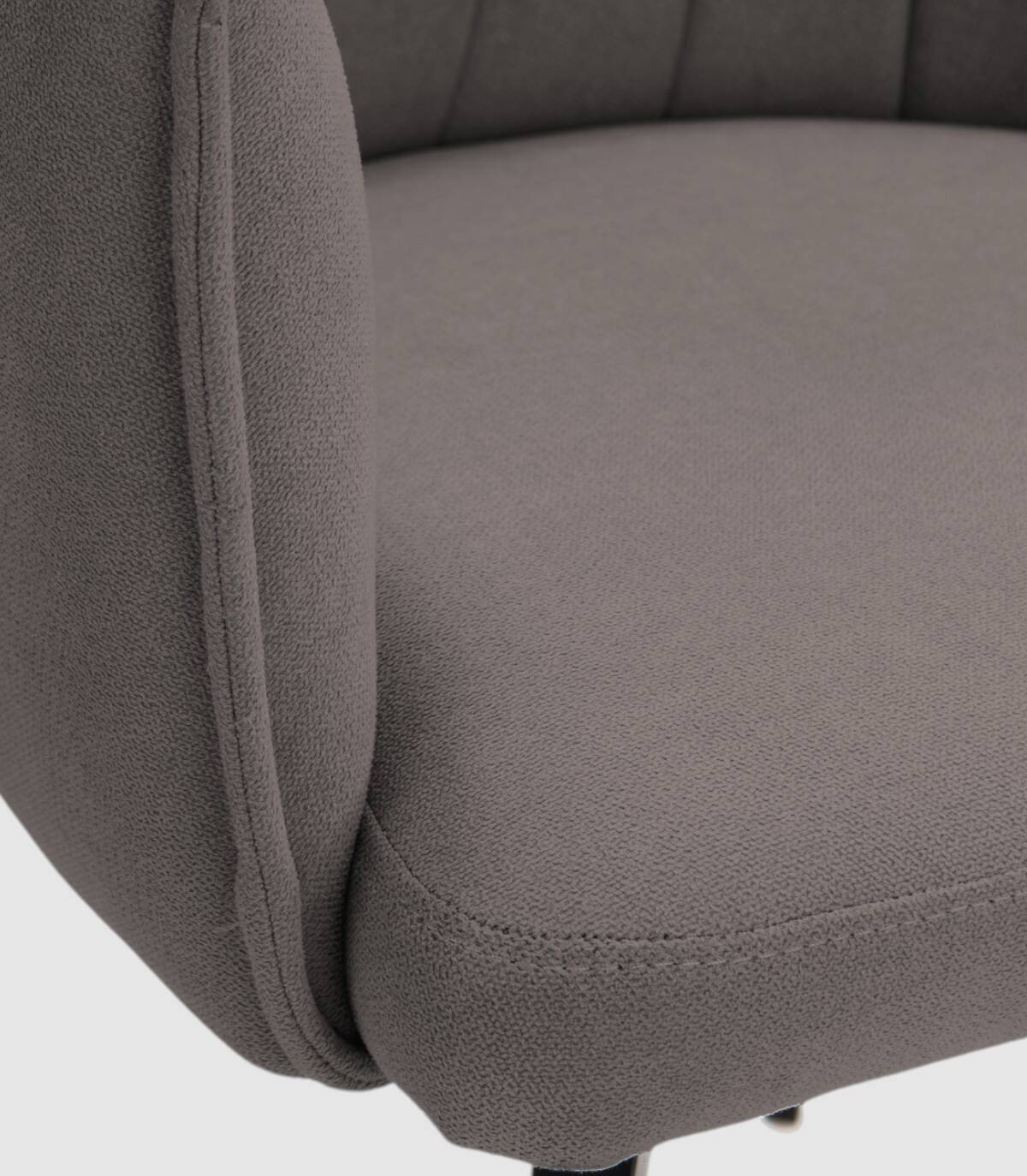 El sillón Tarey se compone de asiento, respaldo y reposabrazos tapizados de color gris oscuro sobre estructura de metal con cuatro patas de color negro.