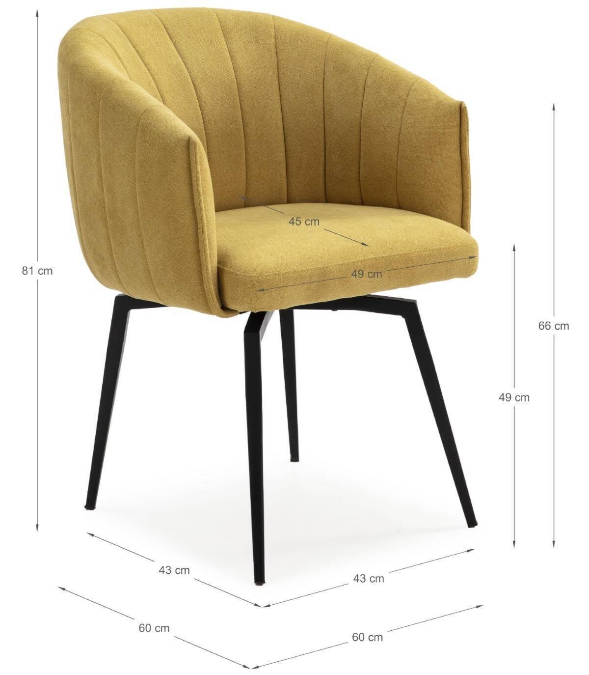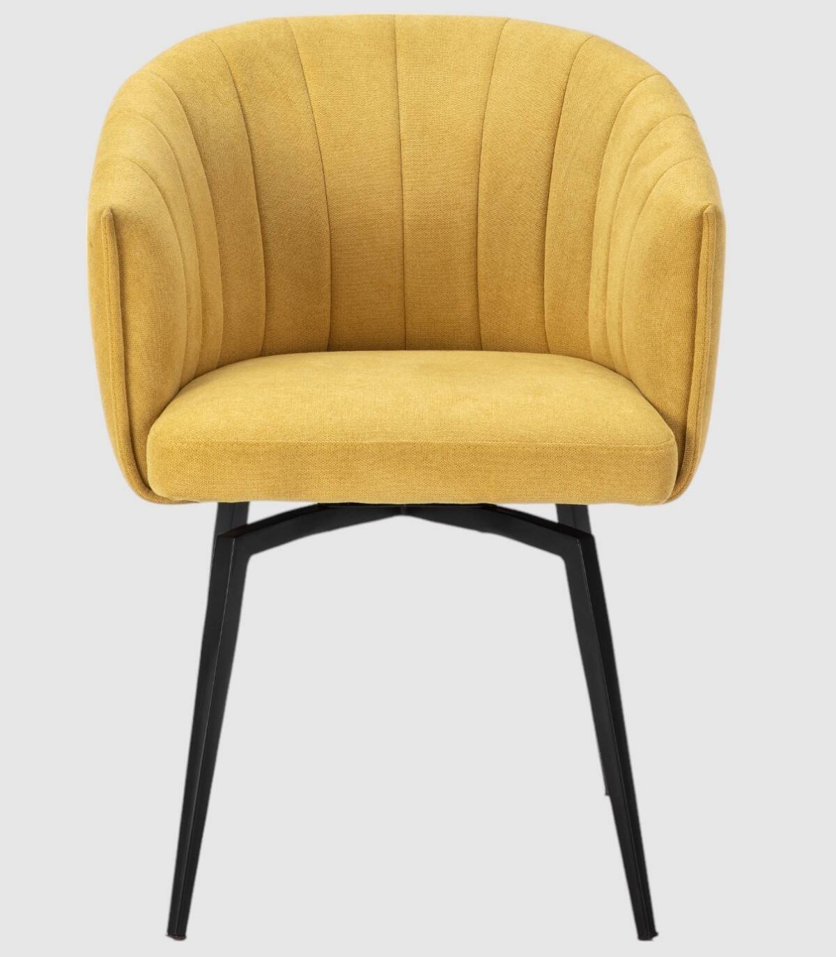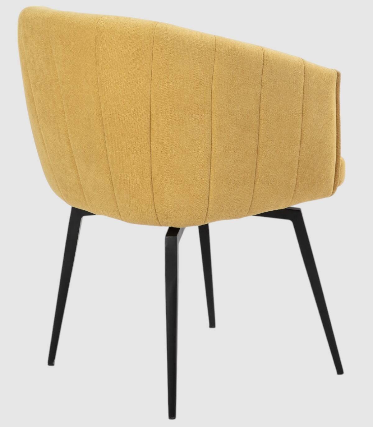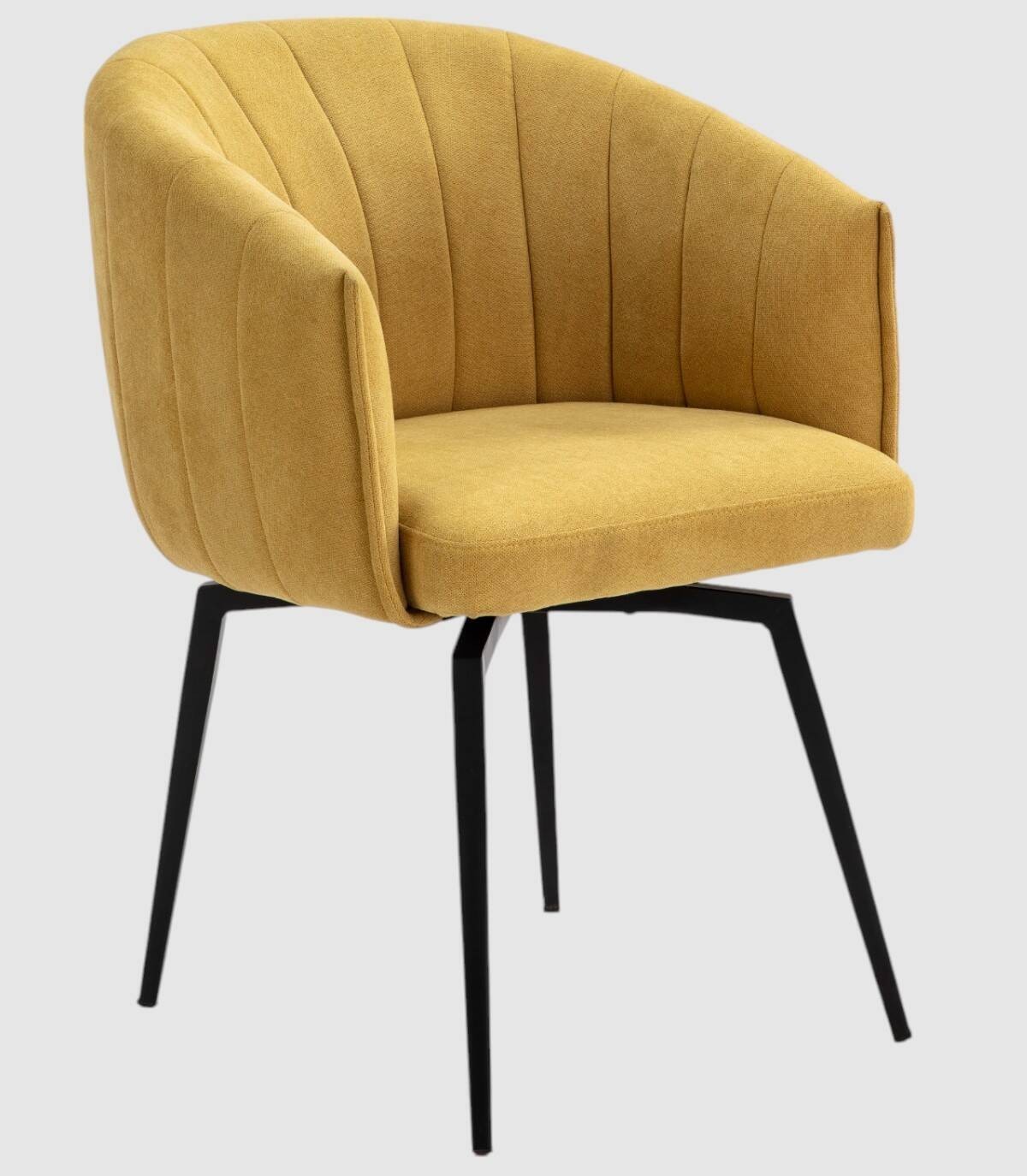 El sillón Tarey se compone de asiento, respaldo y reposabrazos tapizados de color mostaza sobre estructura de metal con cuatro patas de color negro.