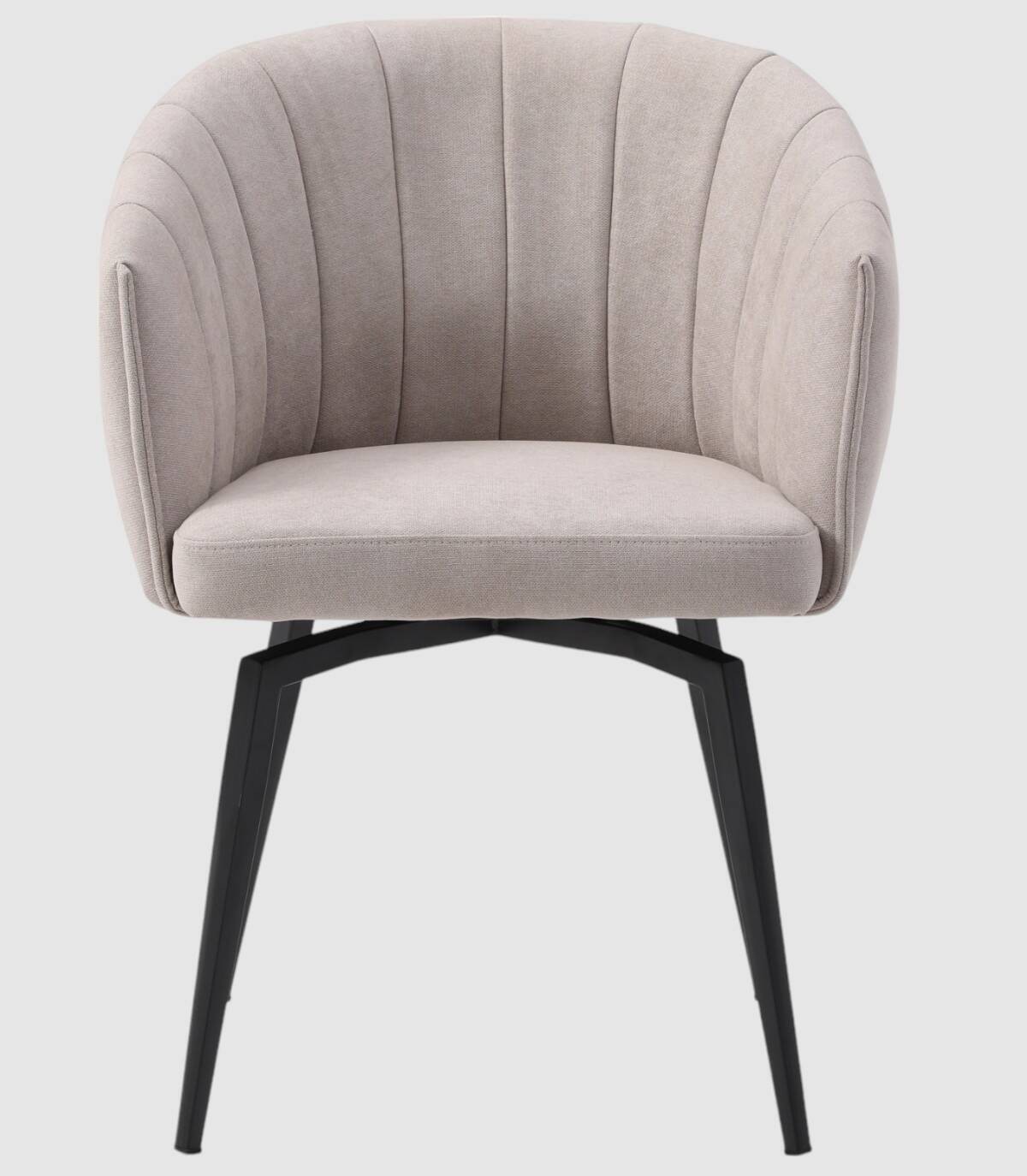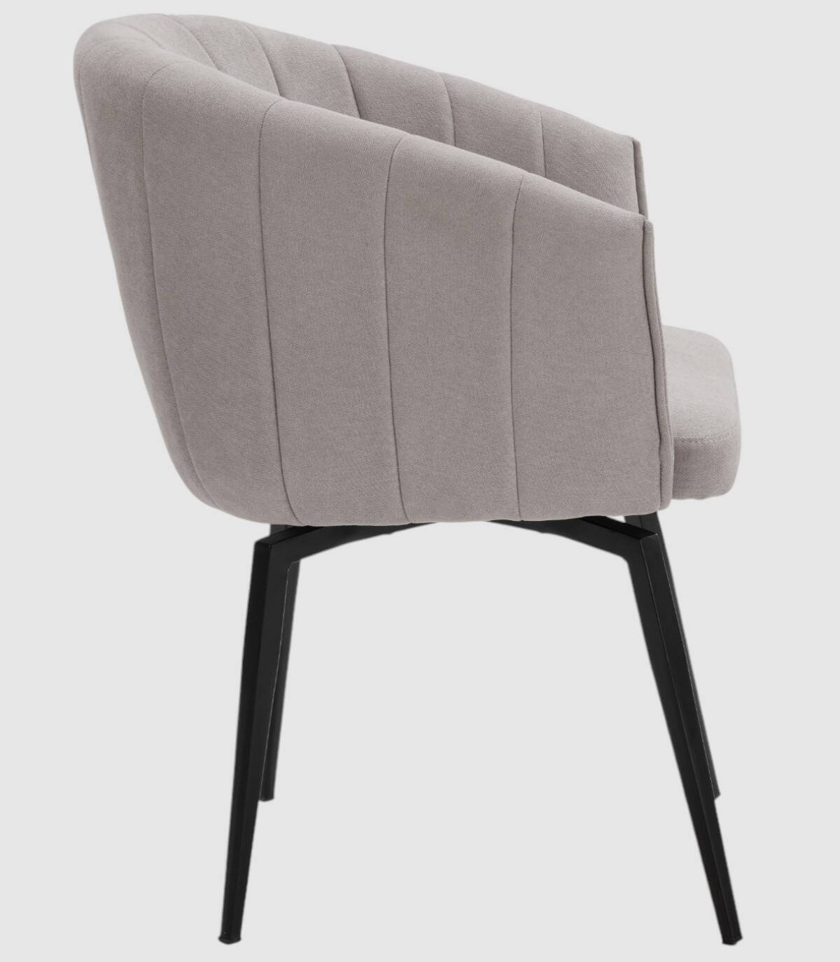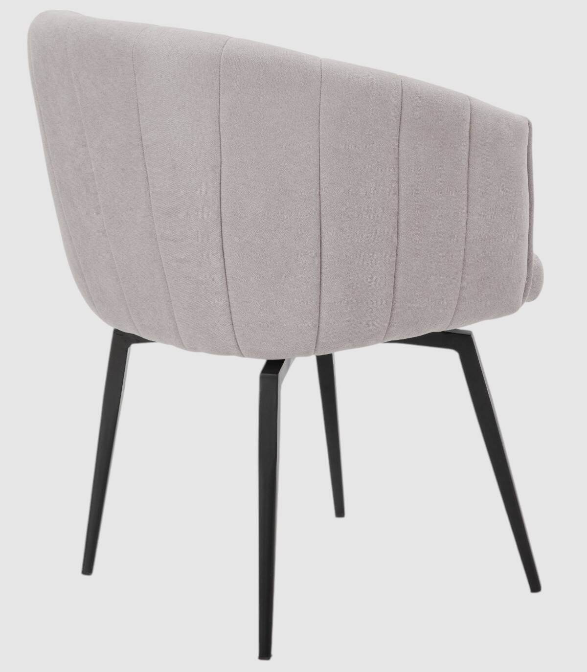 El sillón Tarey se compone de asiento, respaldo y reposabrazos tapizados de color gris claro sobre estructura de metal con cuatro patas de color negro.