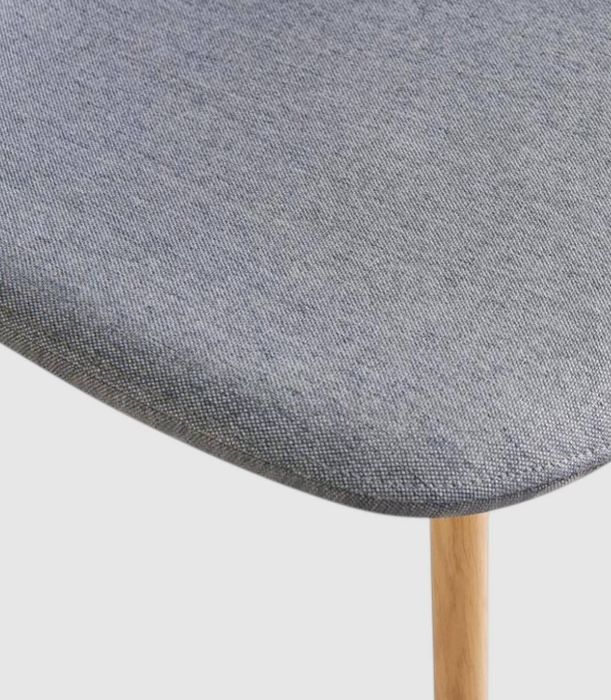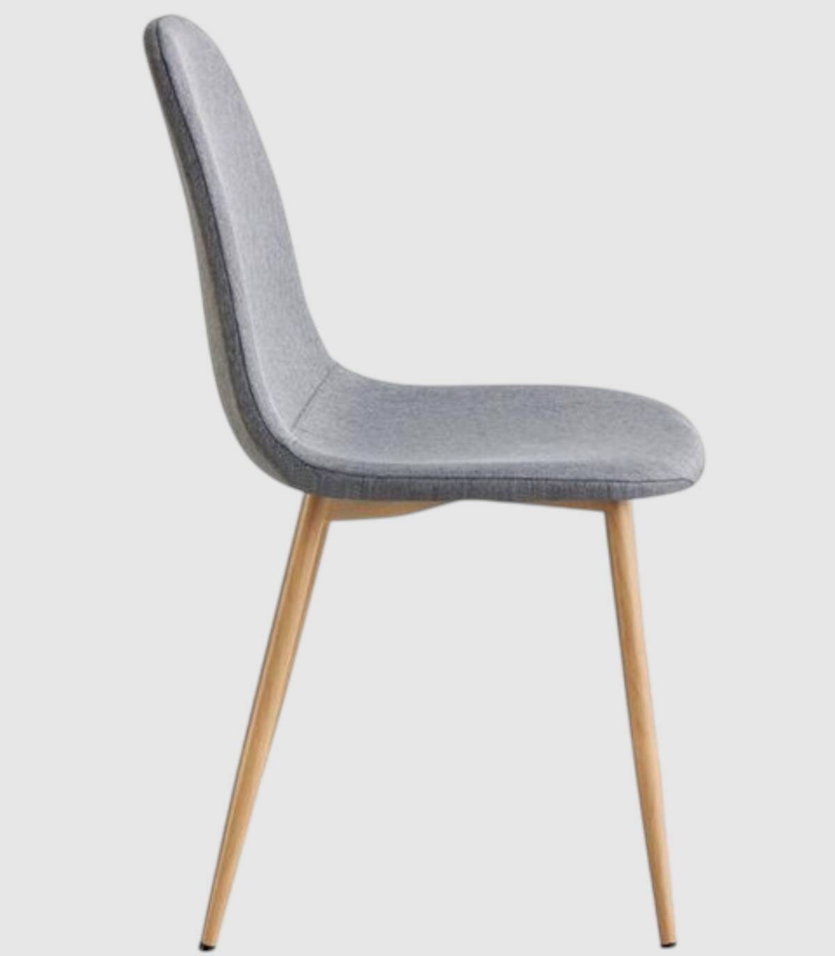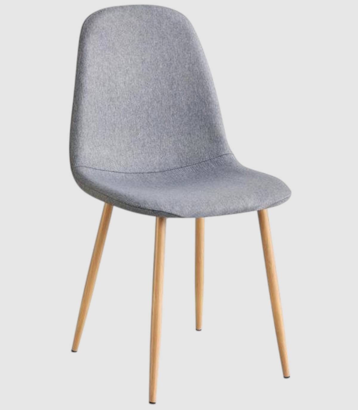 La silla de comedor James se compone de asiento y respaldo tapizado en tela de poliéster de color gris marengo y cuatro patas de acero pintado con papel impreso imitación a madera.