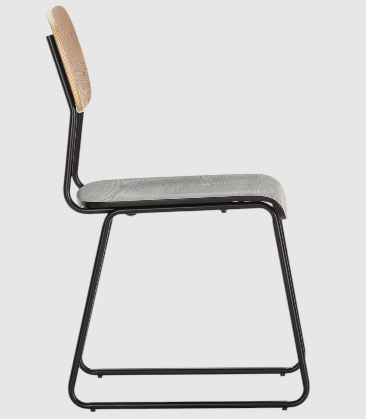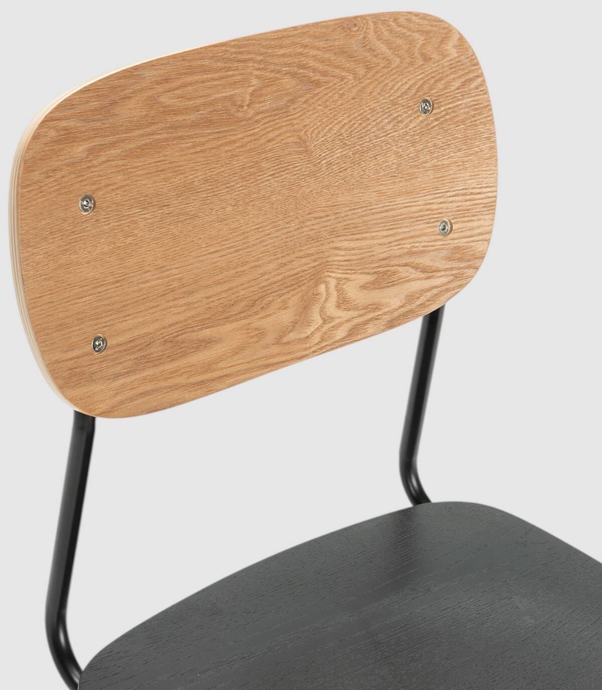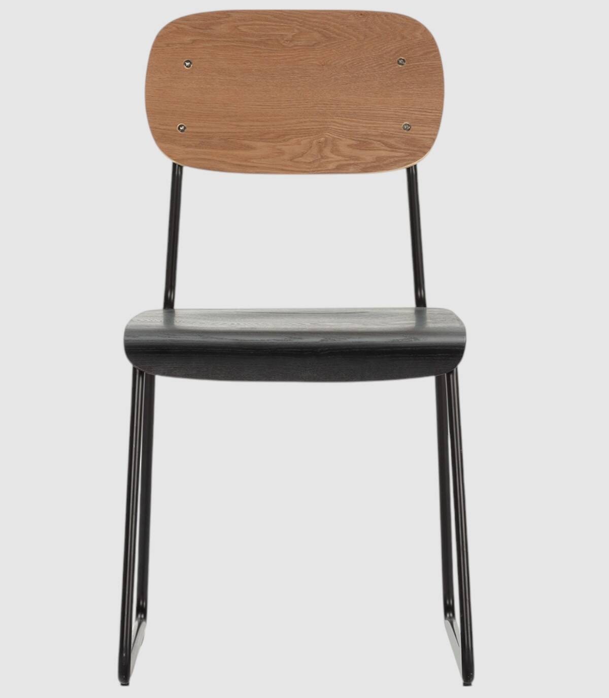 La silla Neka se compone de asiento de madera de color negro y respaldo de madera de color natural sobre estructura de metal con cuatro patas pintado de color negro.