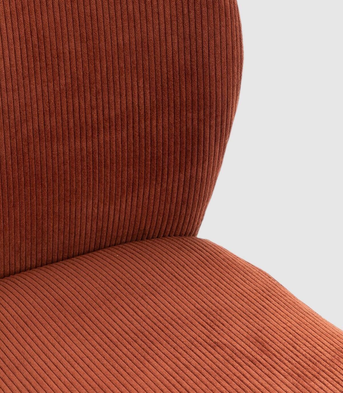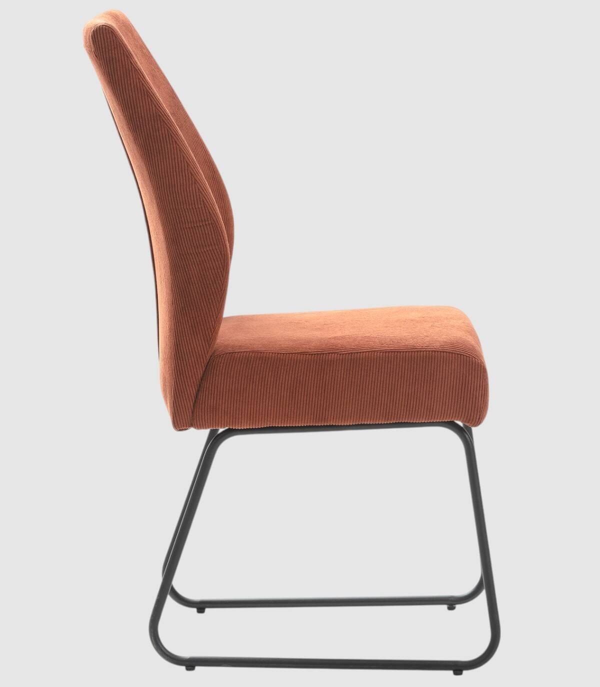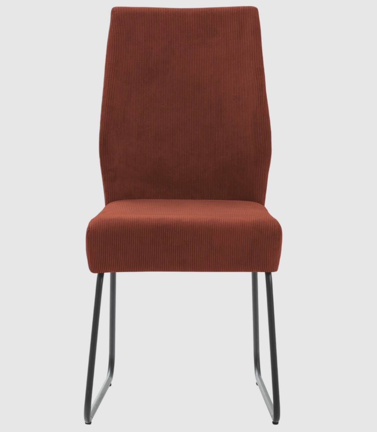 La silla Armila se compone de asiento y respaldo tapizados de teja gris sobre estructura de metal con cuatro patas pintado de color negro.
