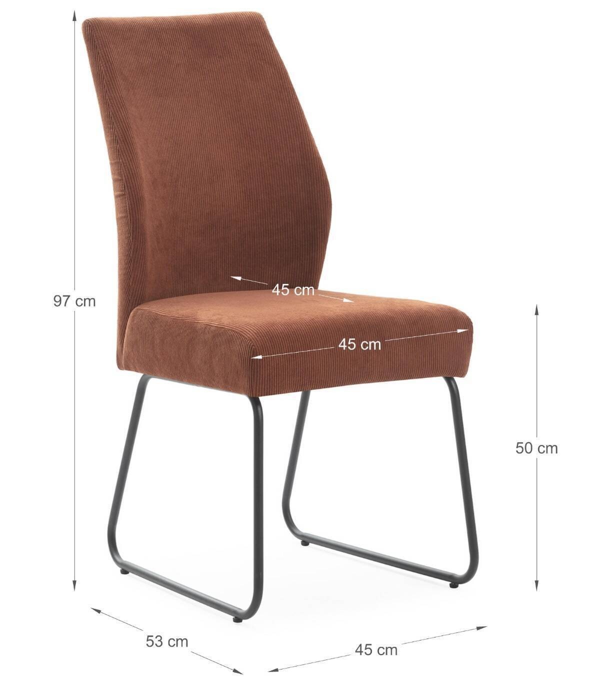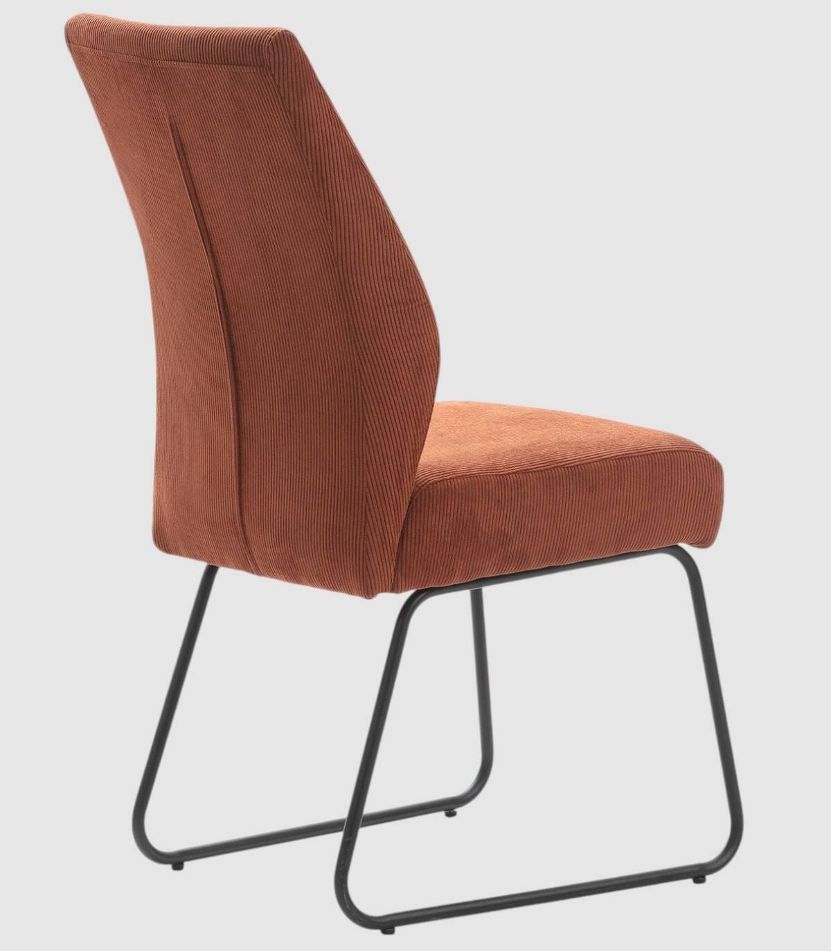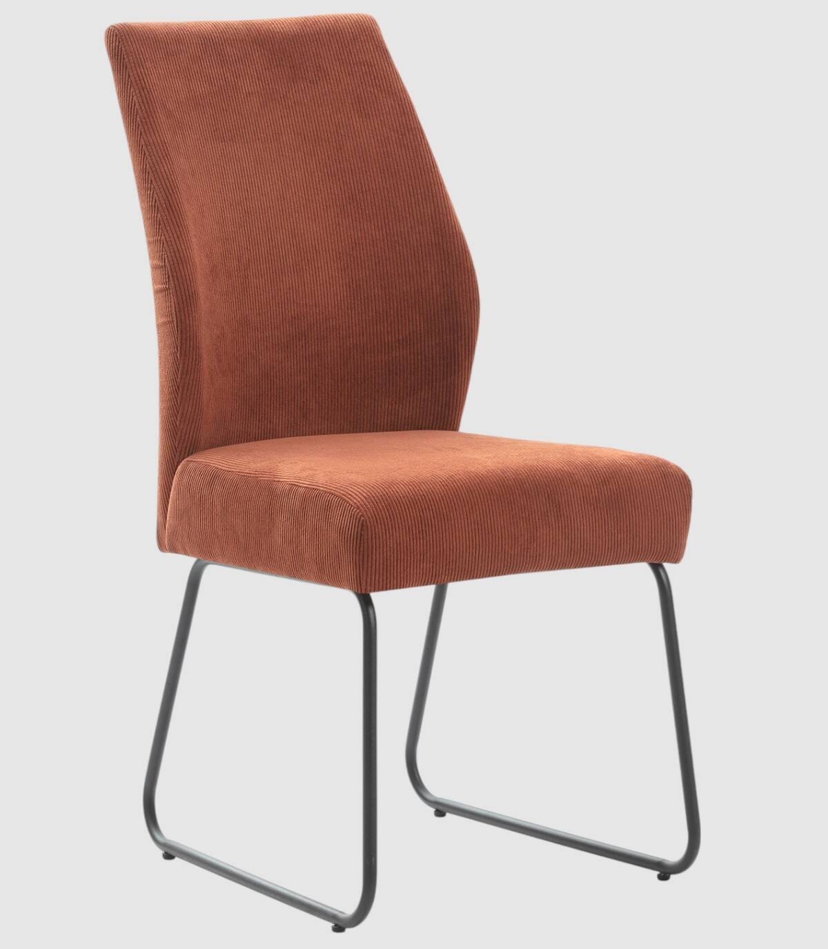 La silla Armila se compone de asiento y respaldo tapizados de teja gris sobre estructura de metal con cuatro patas pintado de color negro.