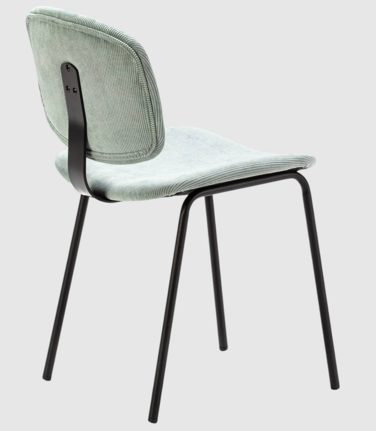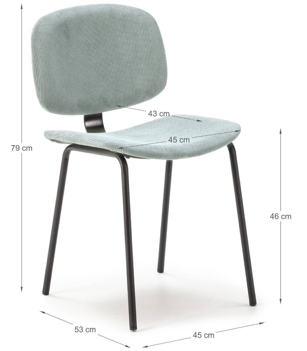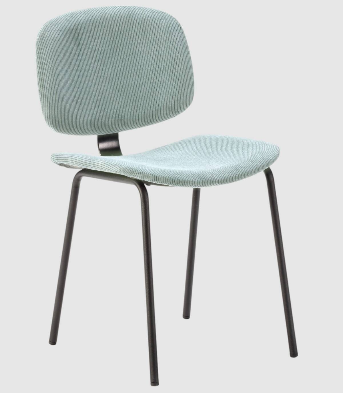 La silla Dimsu se compone de asiento y respaldo tapizado de color aguamarina sobre estructura de metal con cuatro patas pintado de color negro.