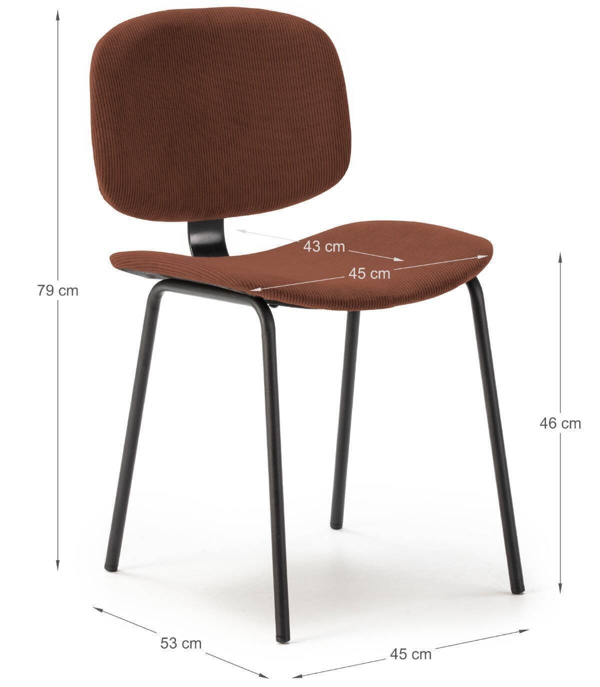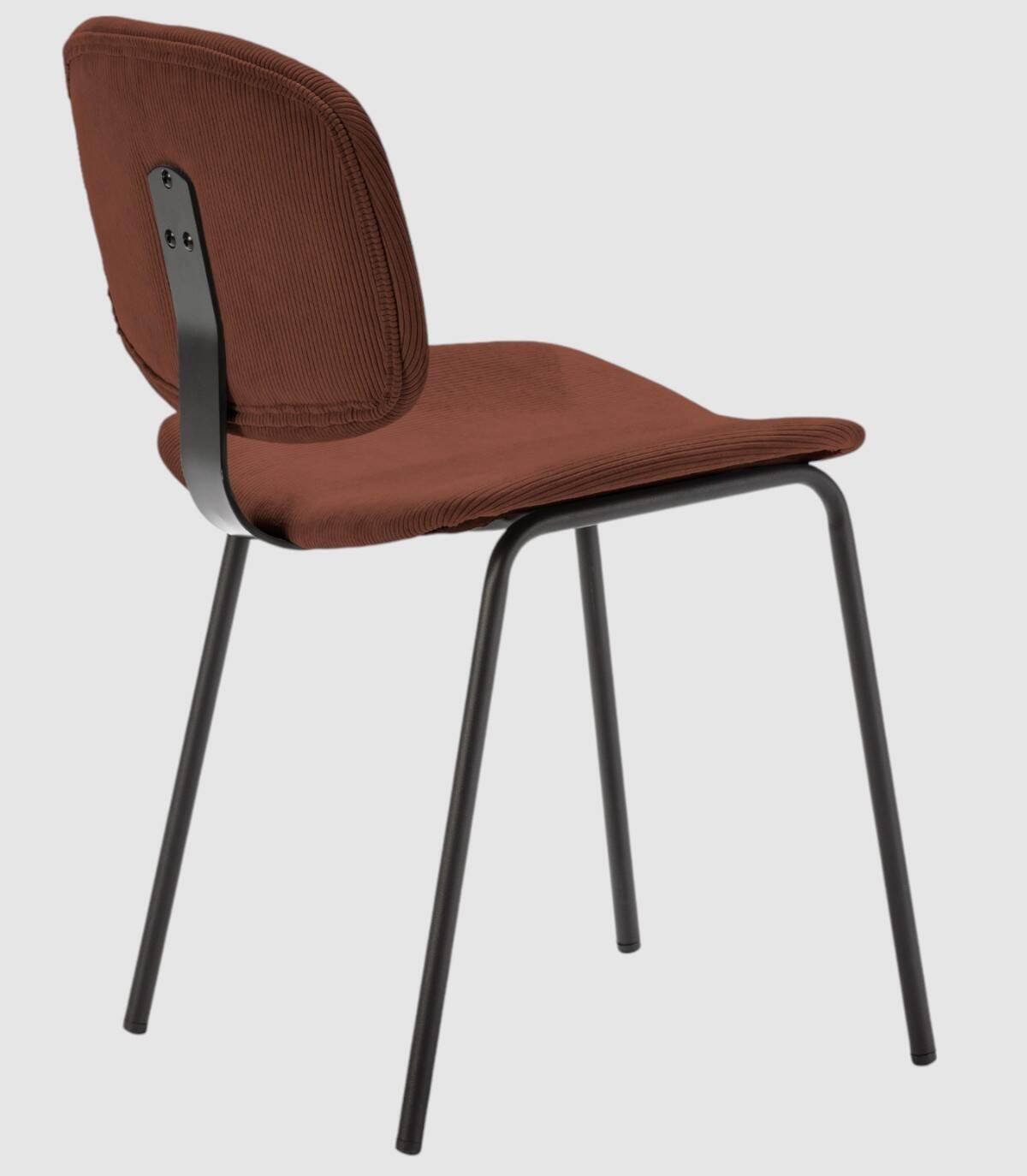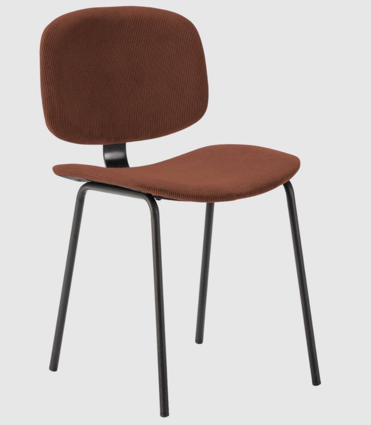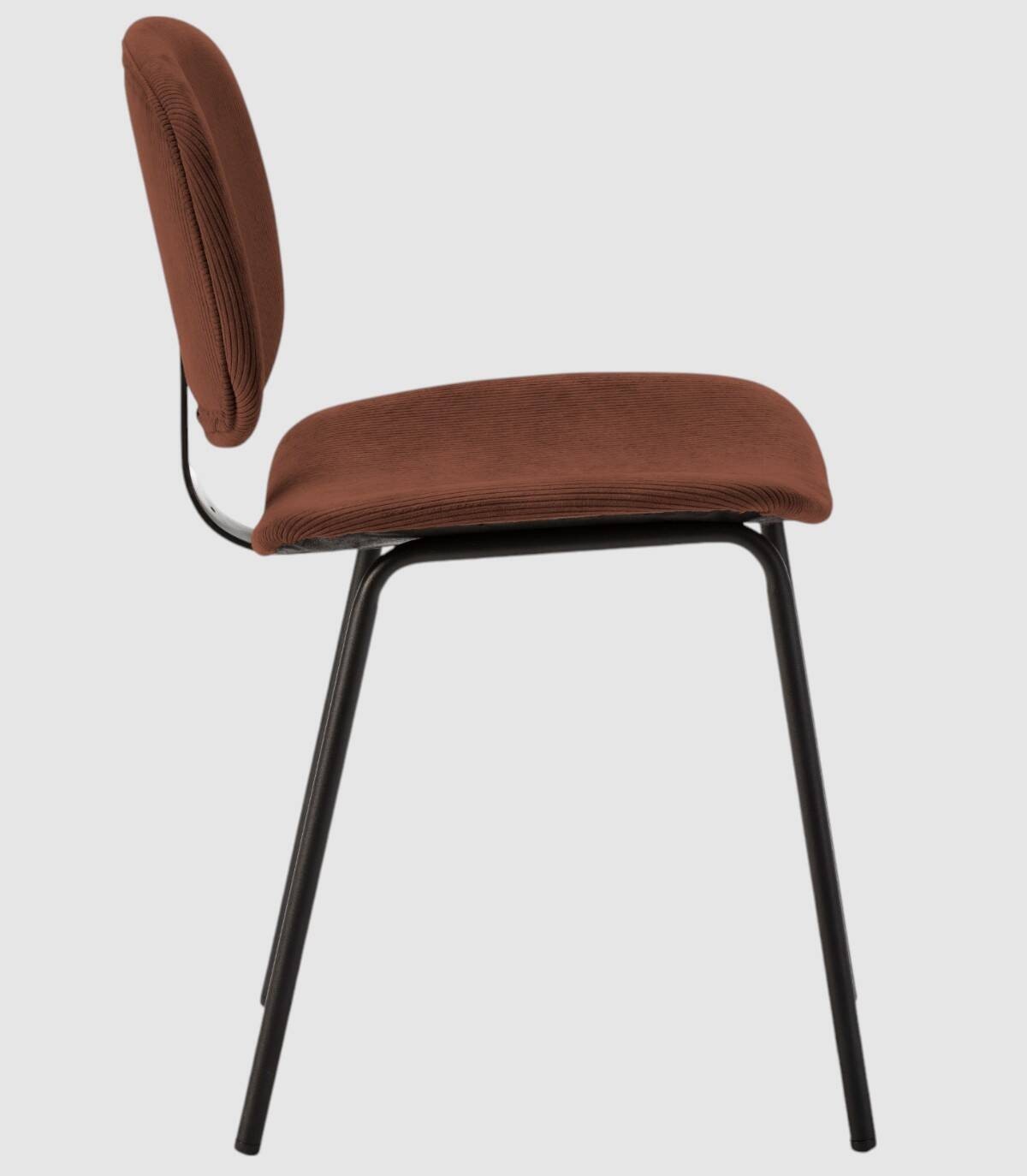 La silla Dimsu se compone de asiento y respaldo tapizado de color caldera sobre estructura de metal con cuatro patas pintado de color negro.