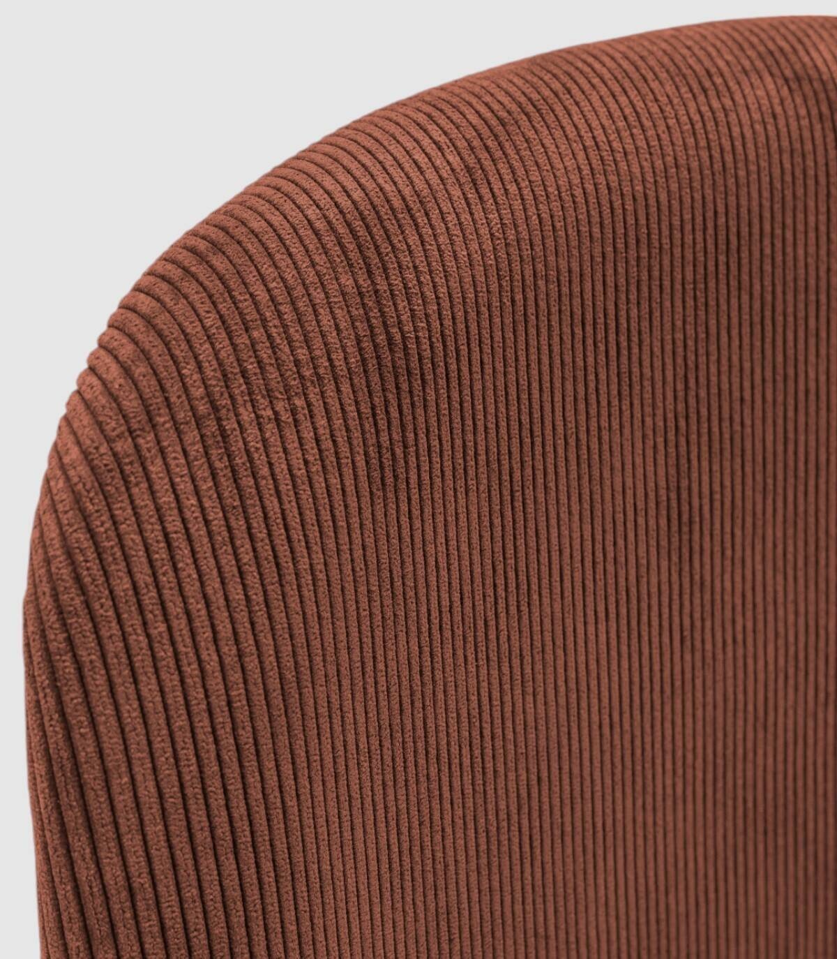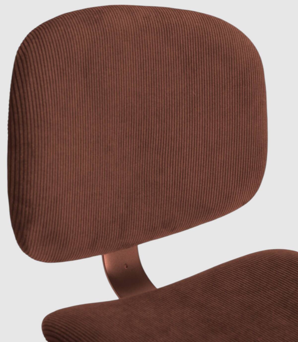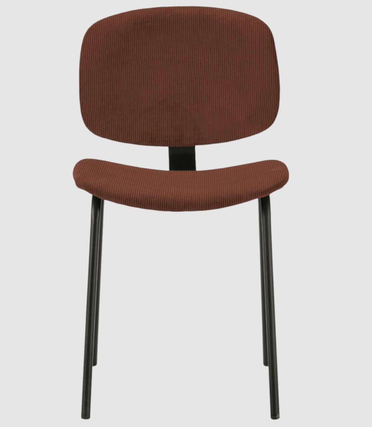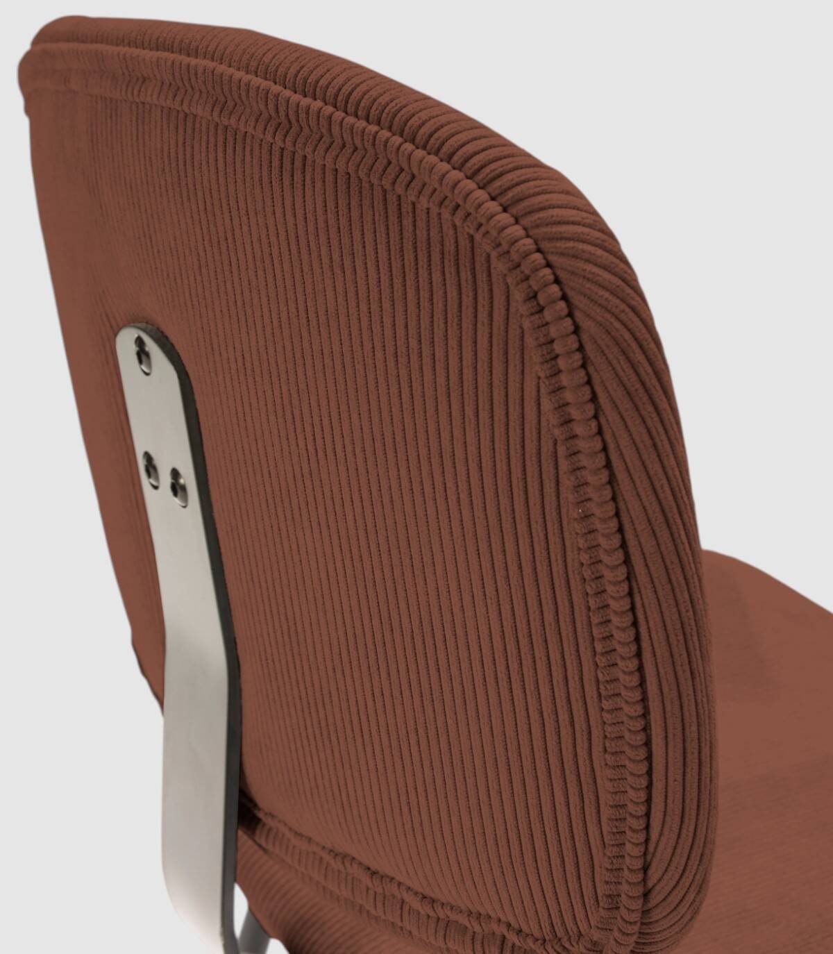 La silla Dimsu se compone de asiento y respaldo tapizado de color caldera sobre estructura de metal con cuatro patas pintado de color negro.