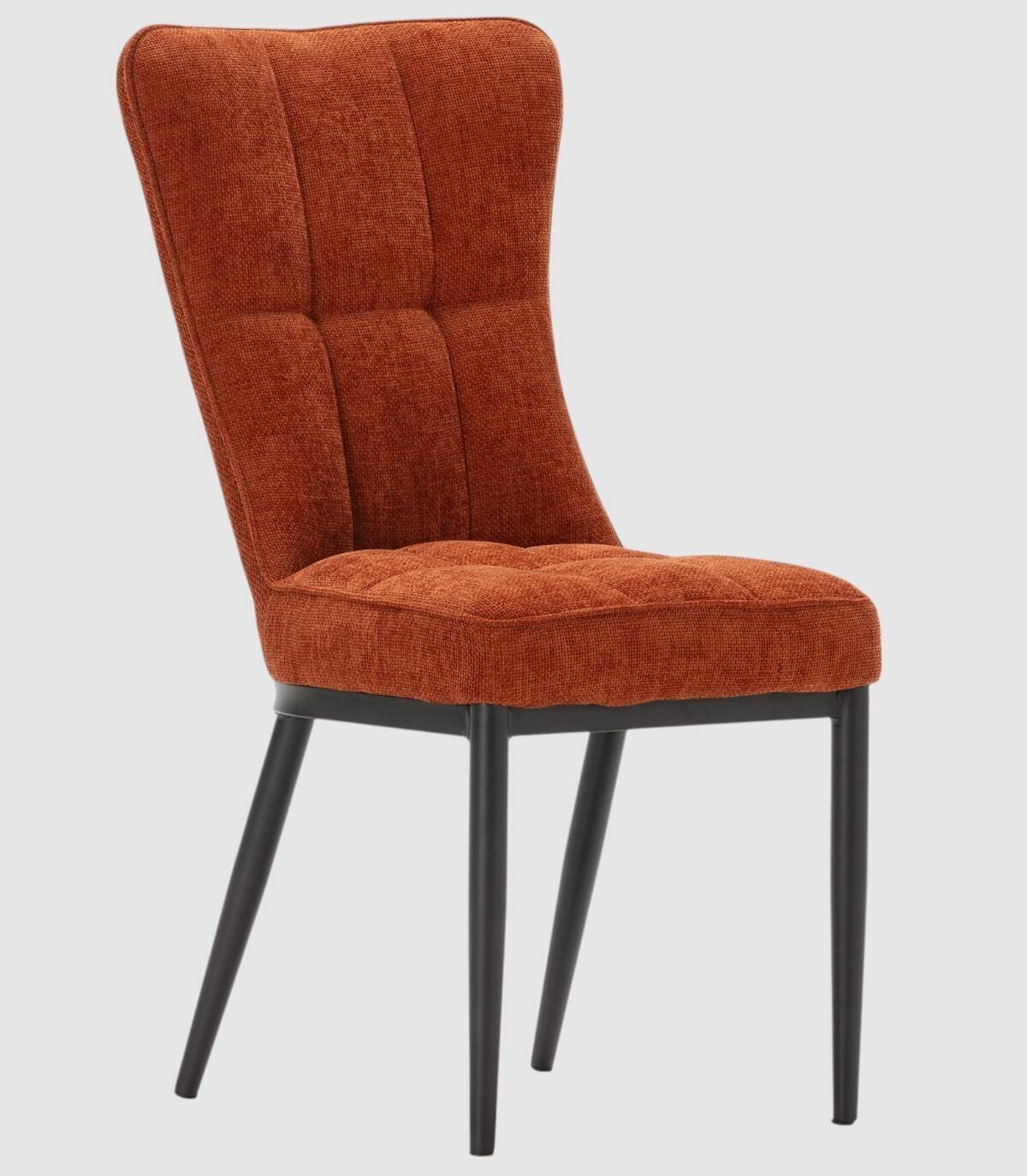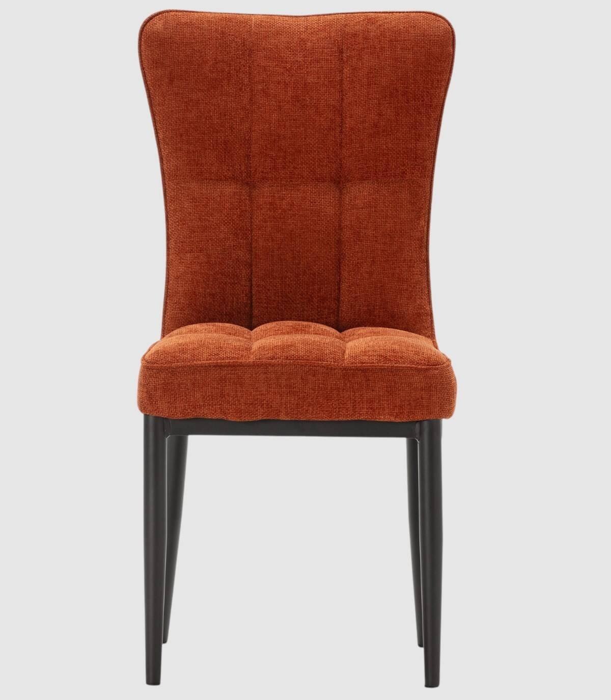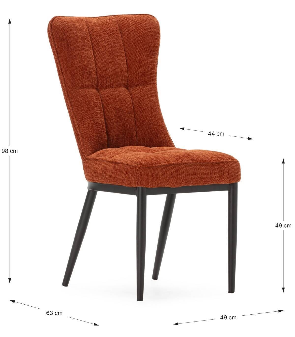 La silla Daka se compone de asiento y respaldo tapizados de color terracota sobre estructura y cuatro patas de metal pintado de color negro.