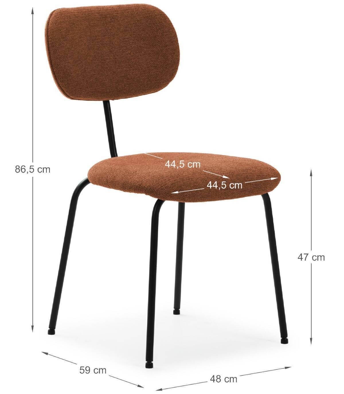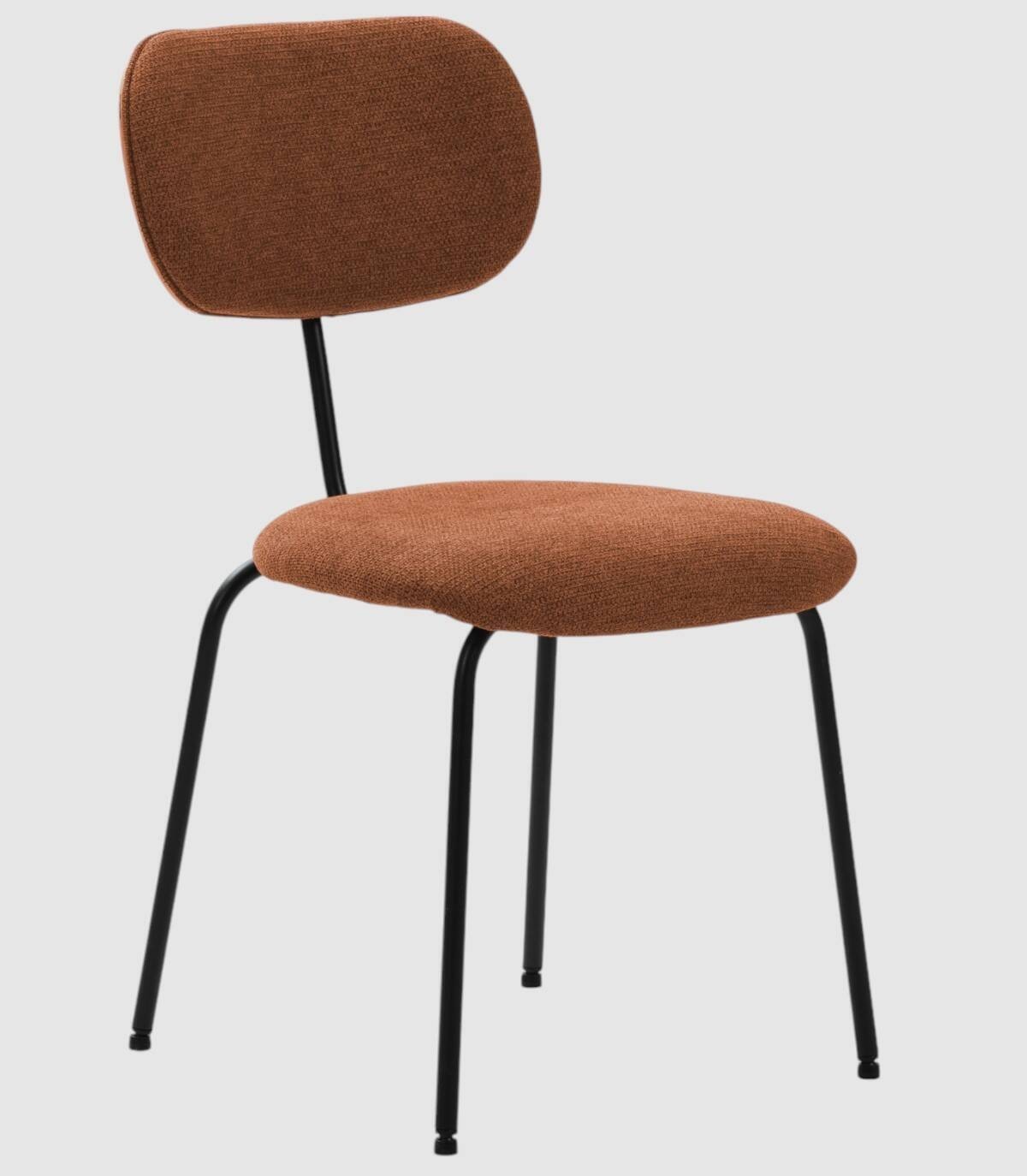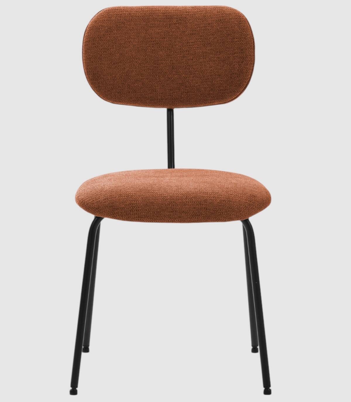La silla Wame se compone de asiento y respaldo tapizados de color teja sobre estructura de metal con cuatro patas pintado de color negro.